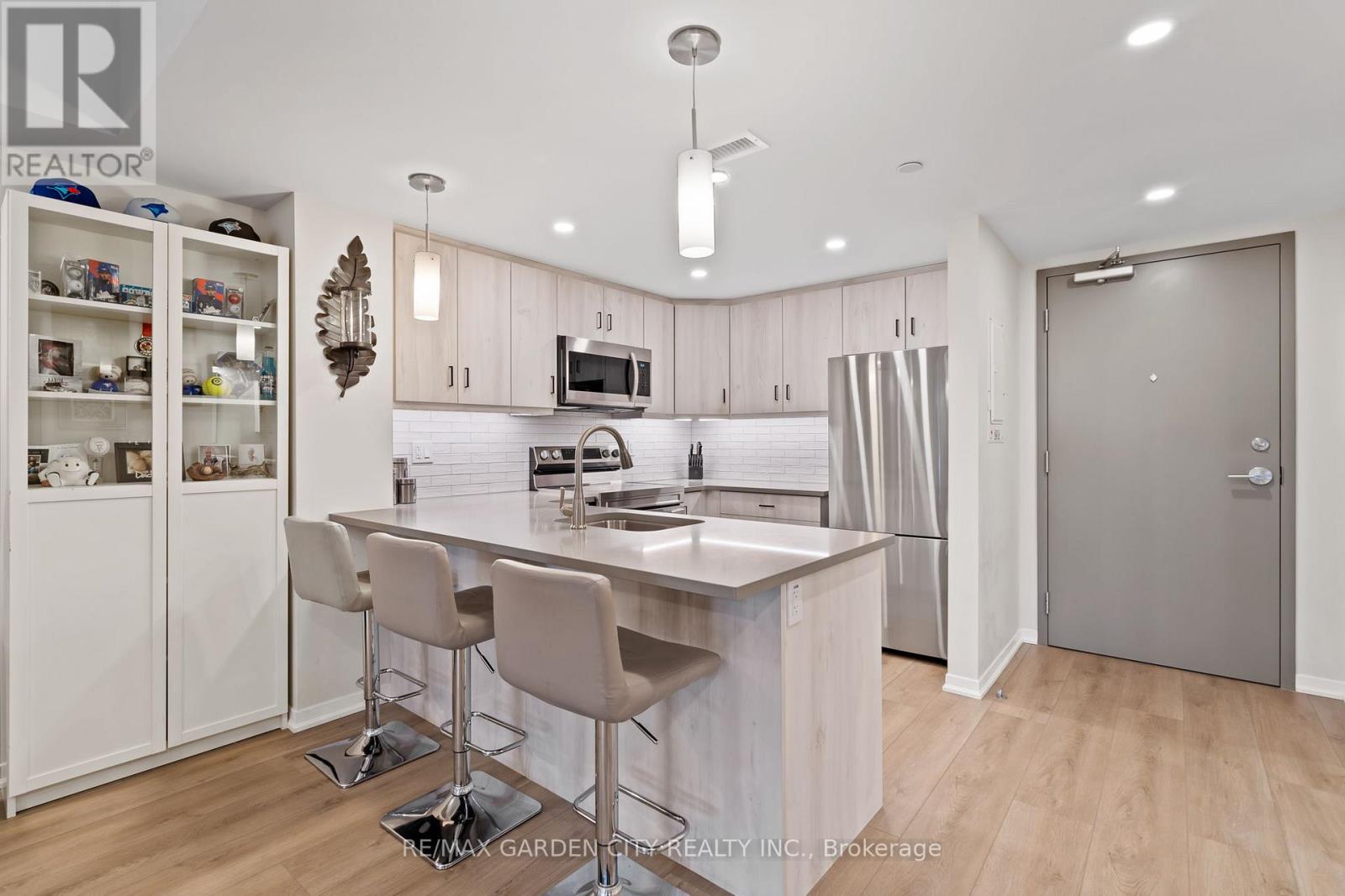 Welcome to Adelaar, a fantastic 4-storey luxury condominium built by Lincoln Construction in 2022. Nestled in the heart of Vineland, with Lake Ontario just to the north, this modern condo community offers exceptional convenience with shops, restaurants, and amenities all within walking distance. Whether you're a first-time buyer, a single or couple, or a senior looking to downsize, this is a wonderful opportunity to enter the real estate market in a stylish, low-maintenance home. This main floor 1 bedroom, 1 bath suite features an open and efficient 678 sq ft layout, complete with a spacious private walk-out that provides easy access to your unit. The interior is beautifully finished with luxury vinyl plank flooring, hard-surface countertops, upgraded light fixtures and pot lights, and in-suite appliances. Adelaar offers an impressive array of upscale amenities, including: A multi-purpose family room/lounge with kitchenette and a large harvest table-perfect for hosting gatherings or extending your living space; a fitness room exclusively for Adelaar residents; a stunning lobby and sitting area with high ceilings and abundant natural light. Make this Your Niagara Home. (id:64974)