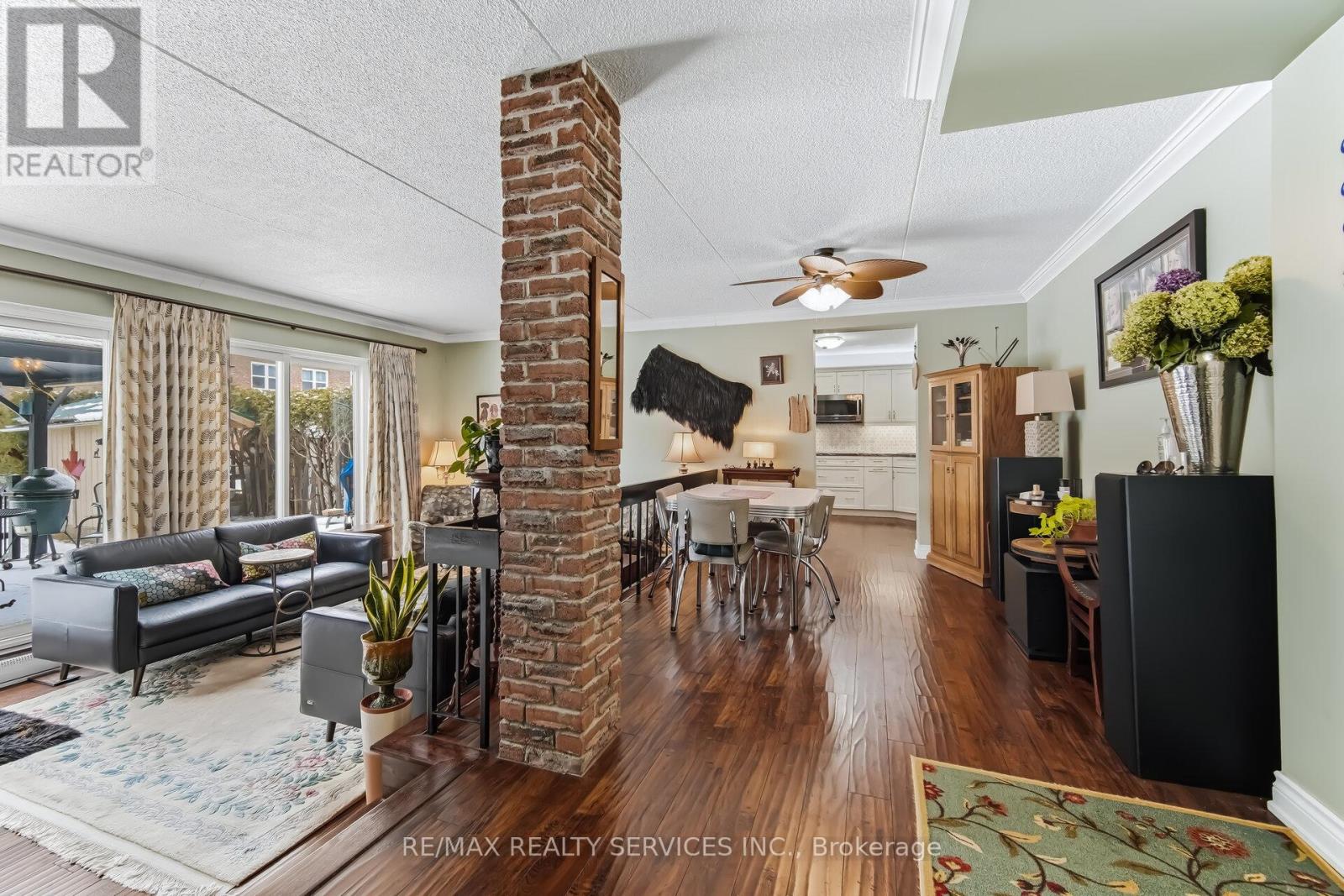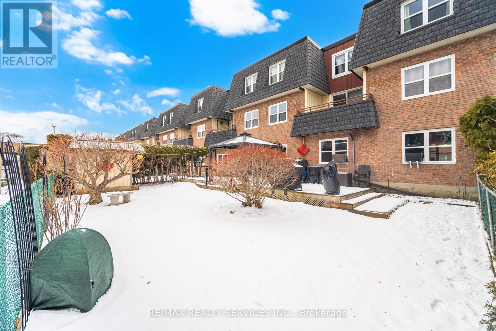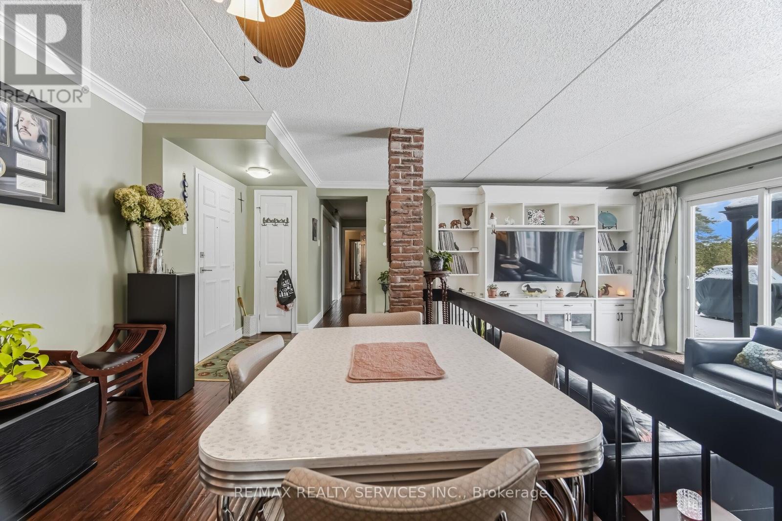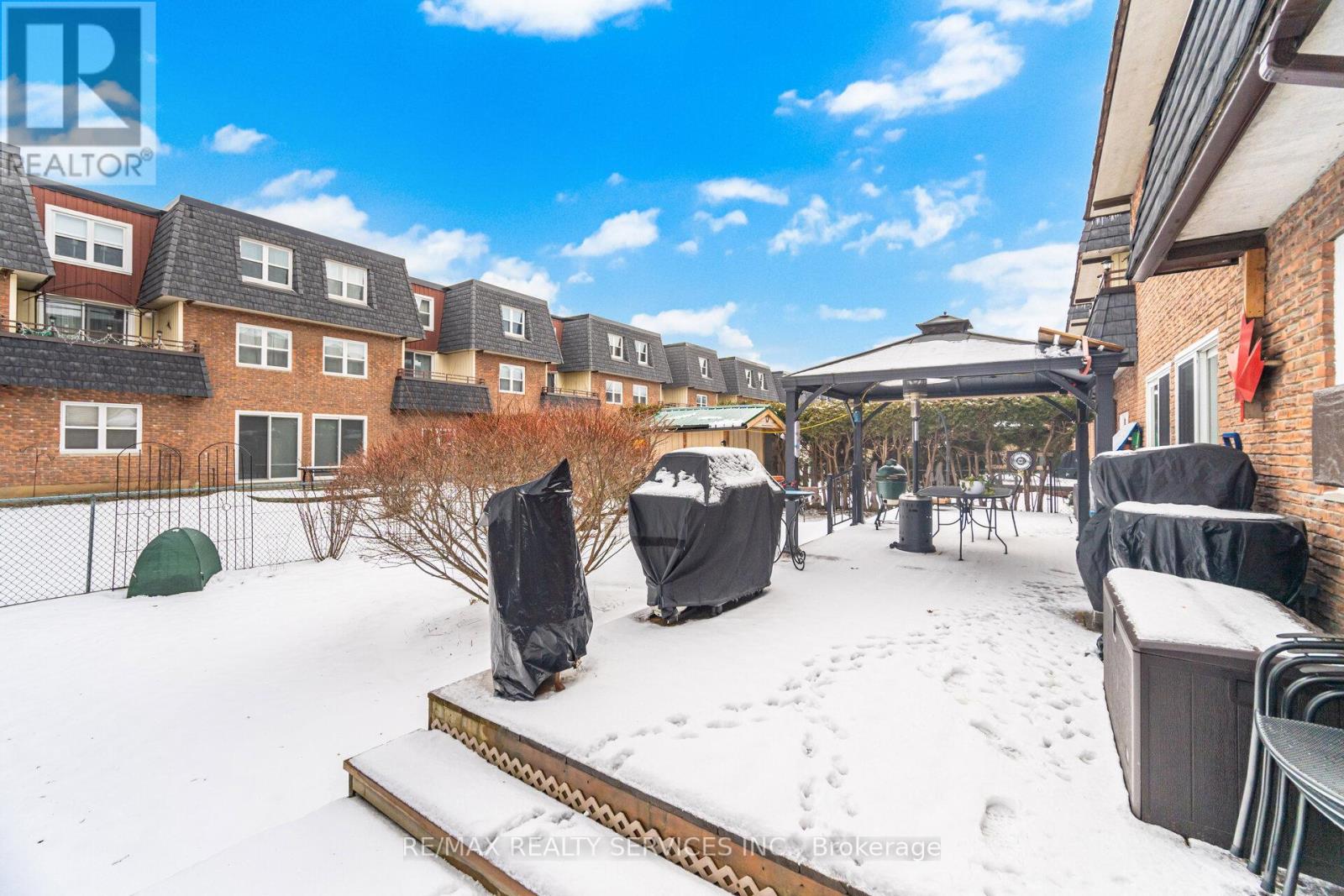 Rarely offered ground level corner unit condo bungalow that truly lives like a private home. This spacious 2 bedroom plus den suite offers approximately 1,274 sq ft with a unique open layout rarely found in condominium living. The inviting living space features a sunken two level living room filled with natural light, highlighted by a striking exposed interior brick architectural column that adds warmth and architectural character rarely seen in condo design. A custom built-in wall unit adds both character and functional storage while enhancing the living space. From the living area, walk out to an exceptionally large private backyard deck and garden space, a rare feature for condo living that creates a seamless indoor outdoor feel and offers plenty of room for relaxing or entertaining. The split level living and dining layout provides natural separation of space while maintaining an open flow ideal for everyday living. Laminate flooring runs throughout the suite, offering a clean carpet free layout and enhancing the warm bungalow style feel. The home has been extensively upgraded throughout with quality finishes and thoughtful improvements reflecting pride of ownership. The upgraded kitchen features generous cabinetry, ample counter space, stainless steel appliances including a built in oven, microwave, and dishwasher, along with a stylish stone backsplash. Tucked away for added privacy, the versatile den is perfect for a home office or reading lounge, while both bedrooms are generously sized with excellent natural light. The well appointed bathroom includes a marble countertop vanity and an oversized glass shower. This suite also features the convenience of ensuite laundry, a sought after feature within the building. The expansive private outdoor space also includes a storage shed equipped with electrical power. Conveniently located in the heart of downtown Whitby close to shops, parks, trails, and quick access to Hwy 401. (id:64974)