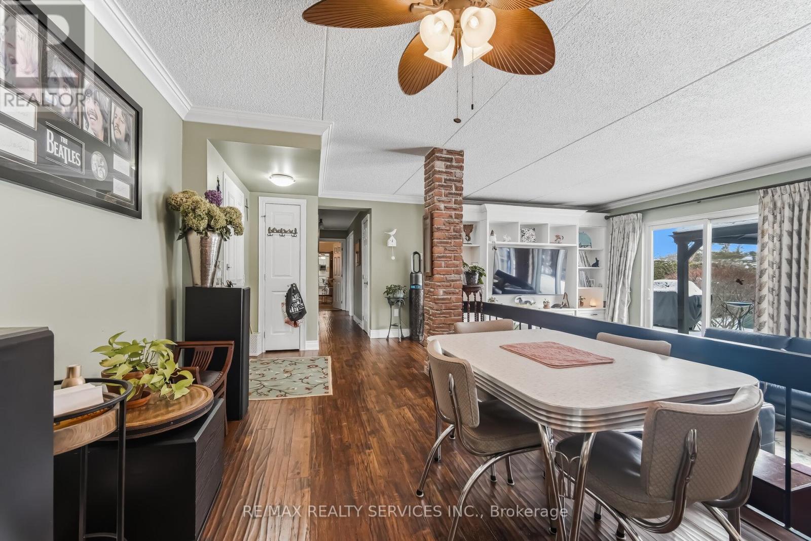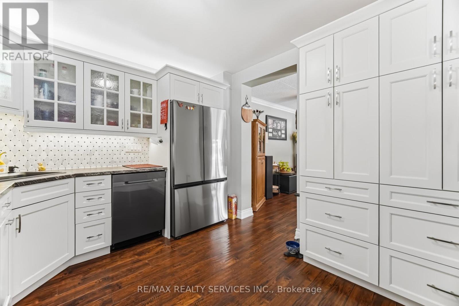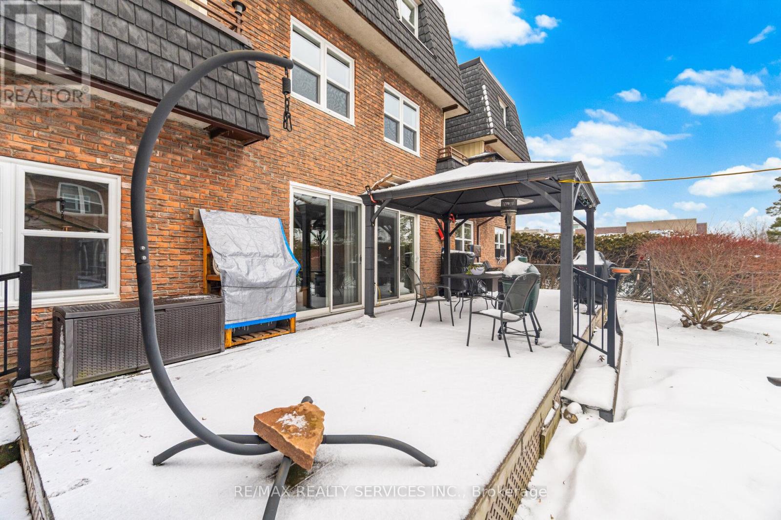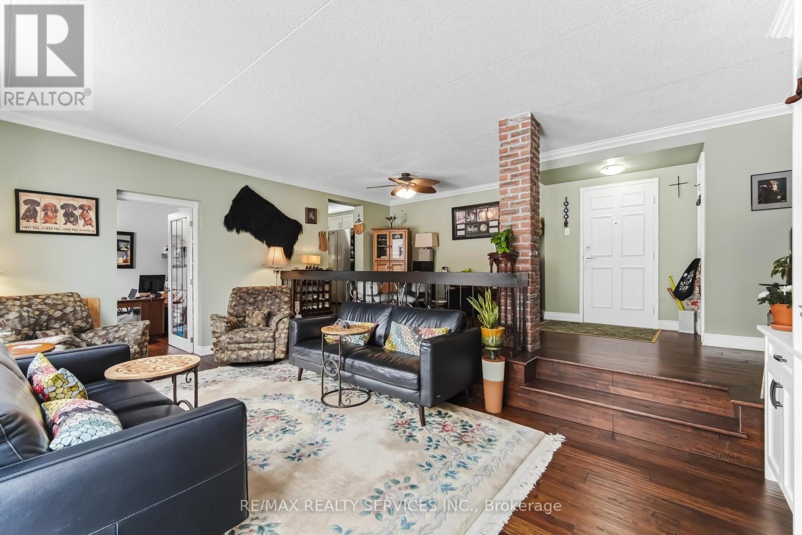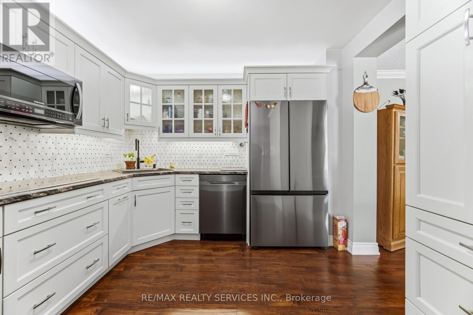 Rarely offered ground level corner unit condo bungalow that truly lives like a private home. This spacious 2 bedroom plus den suite offers approximately 1,274 sq ft with a unique open layout rarely found in condominium living. The inviting living space features a sunken two level living room filled with natural light, highlighted by a striking exposed interior brick architectural column that adds warmth and architectural character rarely seen in condo design. A custom built-in wall unit adds both character and functional storage while enhancing the living space. From the living area, walk out to an exceptionally large private backyard deck and garden space, a rare feature for condo living that creates a seamless indoor outdoor feel and offers plenty of room for relaxing or entertaining. The split level living and dining layout provides natural separation of space while maintaining an open flow ideal for everyday living. Laminate flooring runs throughout the suite, offering a clean carpet free layout and enhancing the warm bungalow style feel. The home has been extensively upgraded throughout with quality finishes and thoughtful improvements reflecting pride of ownership. The upgraded kitchen features generous cabinetry, ample counter space, stainless steel appliances including a built in oven, microwave, and dishwasher, along with a stylish stone backsplash. Tucked away for added privacy, the versatile den is perfect for a home office or reading lounge, while both bedrooms are generously sized with excellent natural light. The well appointed bathroom includes a marble countertop vanity and an oversized glass shower. This suite also features the convenience of ensuite laundry, a sought after feature within the building. The expansive private outdoor space also includes a storage shed equipped with electrical power. Conveniently located in the heart of downtown Whitby close to shops, parks, trails, and quick access to Hwy 401. (id:64974)