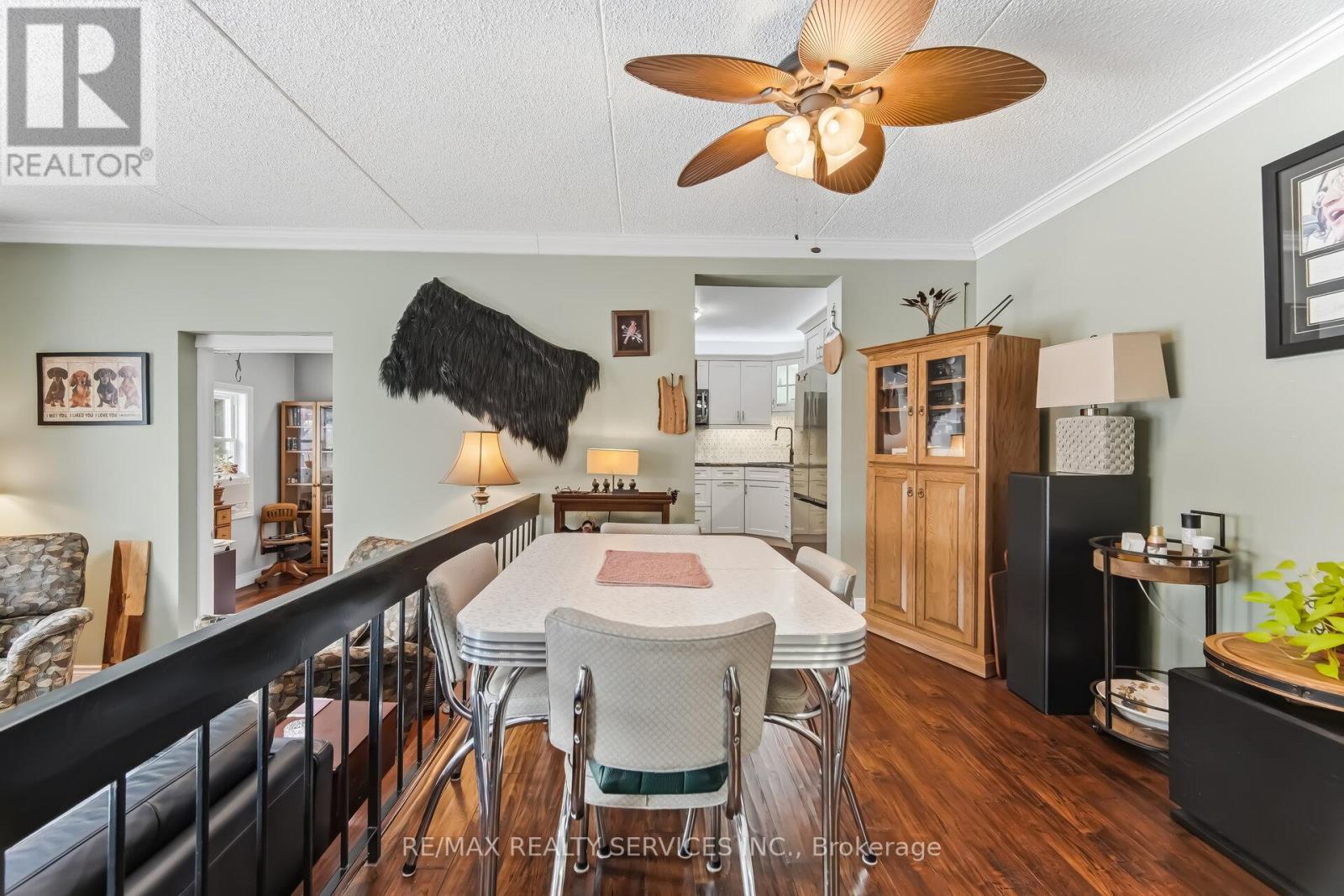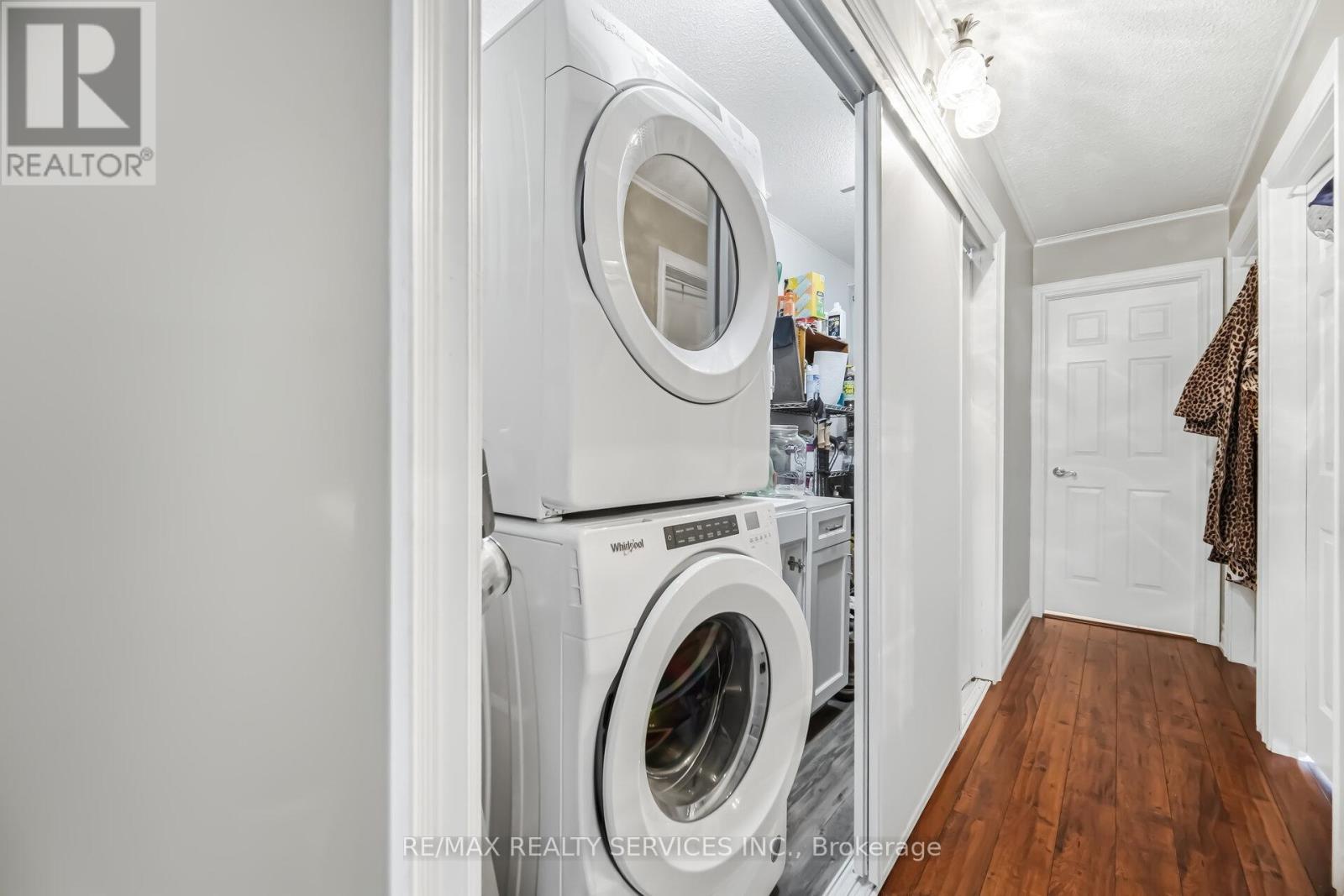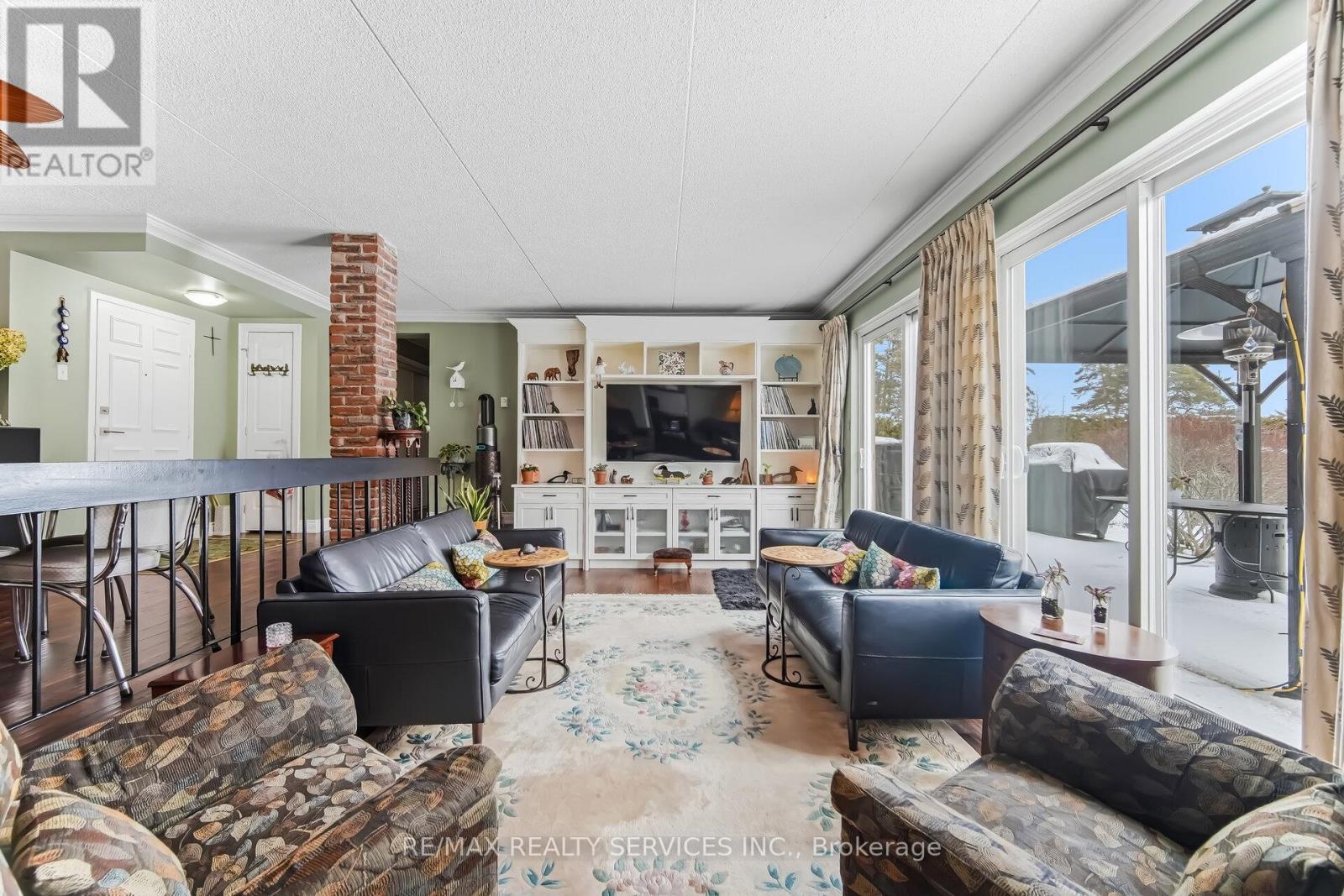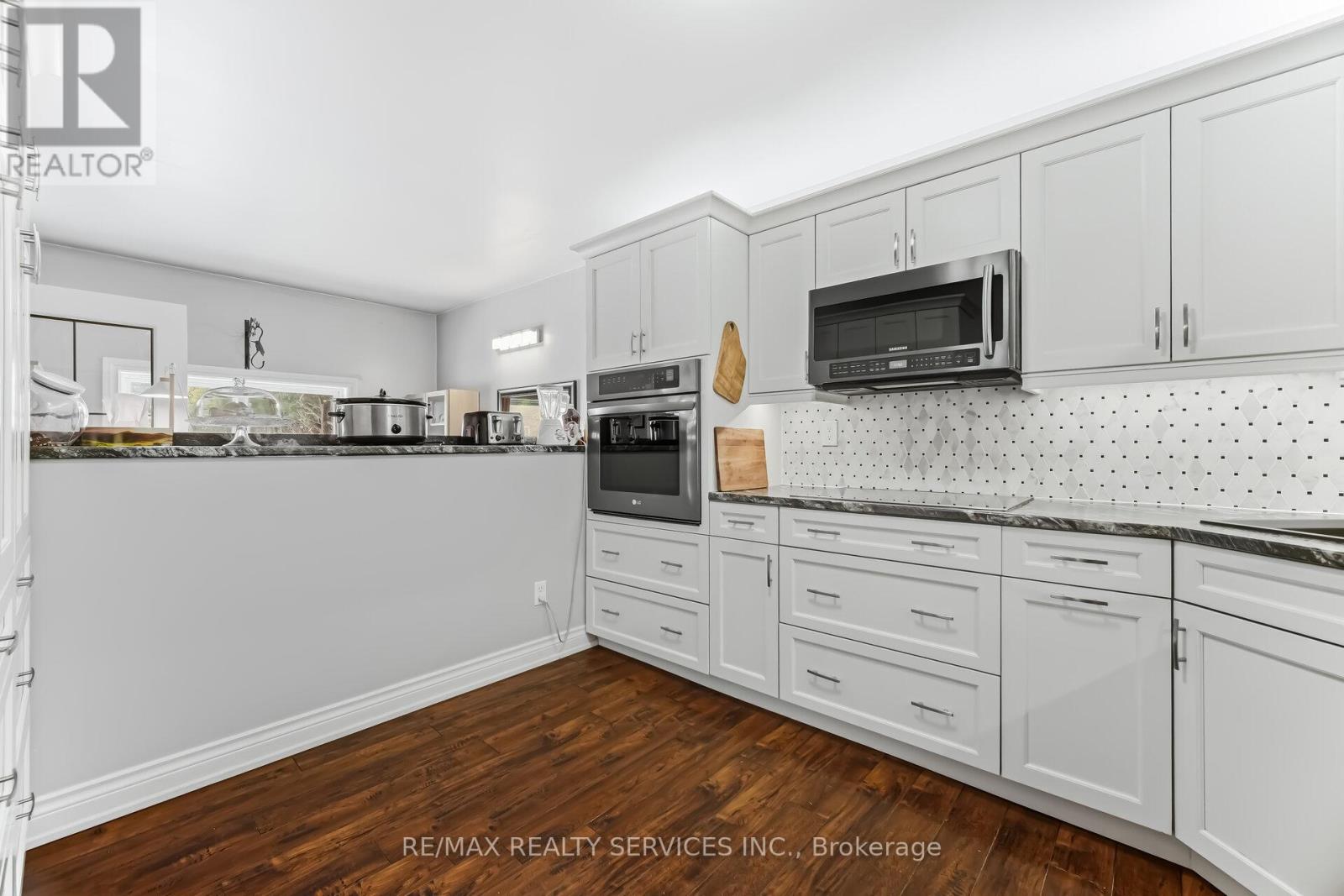 Rarely offered ground level corner unit condo bungalow that truly lives like a private home. This spacious 2 bedroom plus den suite offers approximately 1,274 sq ft with a unique open layout rarely found in condominium living. The inviting living space features a sunken two level living room filled with natural light, highlighted by a striking exposed interior brick architectural column that adds warmth and architectural character rarely seen in condo design. A custom built-in wall unit adds both character and functional storage while enhancing the living space. From the living area, walk out to an exceptionally large private backyard deck and garden space, a rare feature for condo living that creates a seamless indoor outdoor feel and offers plenty of room for relaxing or entertaining. The split level living and dining layout provides natural separation of space while maintaining an open flow ideal for everyday living. Laminate flooring runs throughout the suite, offering a clean carpet free layout and enhancing the warm bungalow style feel. The home has been extensively upgraded throughout with quality finishes and thoughtful improvements reflecting pride of ownership. The upgraded kitchen features generous cabinetry, ample counter space, stainless steel appliances including a built in oven, microwave, and dishwasher, along with a stylish stone backsplash. Tucked away for added privacy, the versatile den is perfect for a home office or reading lounge, while both bedrooms are generously sized with excellent natural light. The well appointed bathroom includes a marble countertop vanity and an oversized glass shower. This suite also features the convenience of ensuite laundry, a sought after feature within the building. The expansive private outdoor space also includes a storage shed equipped with electrical power. Conveniently located in the heart of downtown Whitby close to shops, parks, trails, and quick access to Hwy 401. (id:64974)