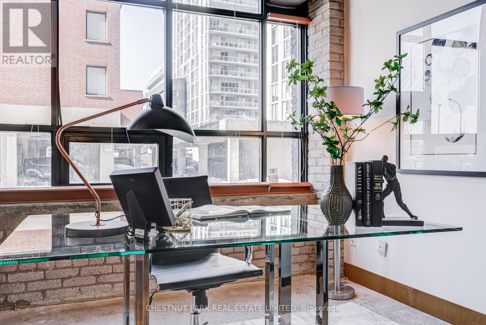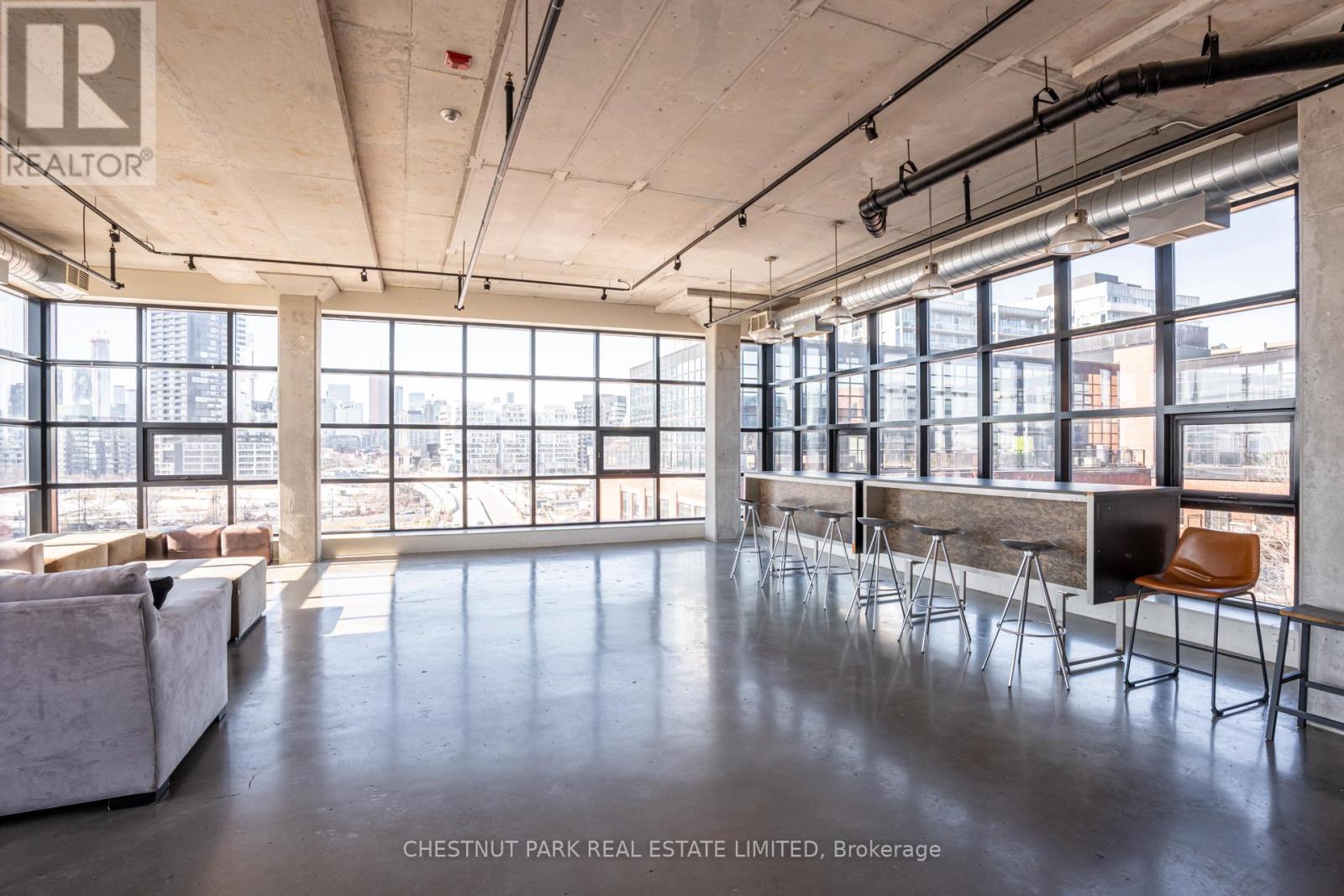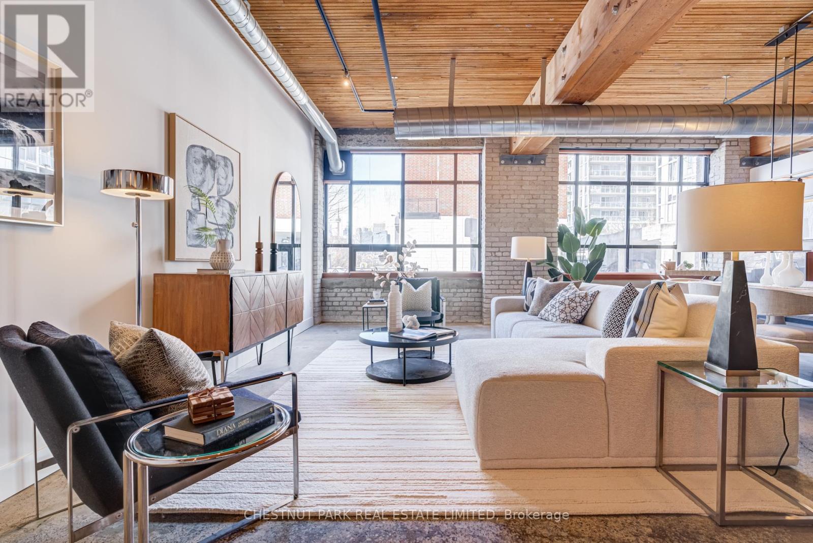 Spectacular brick-and-beam true hard loft in the Broadview Lofts, one of Toronto's most iconic and in the Broadview sought-after hard loft conversions. Perfectly positioned in the heart of vibrant Riverside, this rare extra-wide 2-bedroom, 2-bathroom residence offers almost 1300 sq. ft. of authentic industrial-chic living designed for those who appreciate character, scale, and style.From the moment you enter, the architectural details make a statement. Soaring 10.5 ft. wood beam ceilings, original Douglas fir posts, exposed brick walls, polished concrete floors, oversized warehouse windows, and original metal doors create a dramatic yet warm aesthetic that simply cannot be replicated in new construction. Every element reflects the building's rich history while offering the comfort and functionality modern urban professionals expect.The expansive open-concept layout provides exceptional flexibility for entertaining, working from home, or creating distinct living and dining zones without sacrificing flow. The extra width of the suite enhances the sense of volume and light, while two full bathrooms offer rare practicality in authentic hard loft living. Whether hosting dinner parties, enjoying quiet evenings in, or designing a space that reflects your personal brand and creativity, this loft adapts effortlessly to your lifestyle.Exclusive underground parking and a large locker add everyday convenience, while the surrounding neighbourhood offers some of the city's best cafés, restaurants, boutiques, fitness of the studios, and transit options just steps from your door.This is more than a condo. It is a statement space in a landmark building, offering scale, statement space authenticity, and an unmatched east-end energy that continues to define Toronto living. (id:64974)