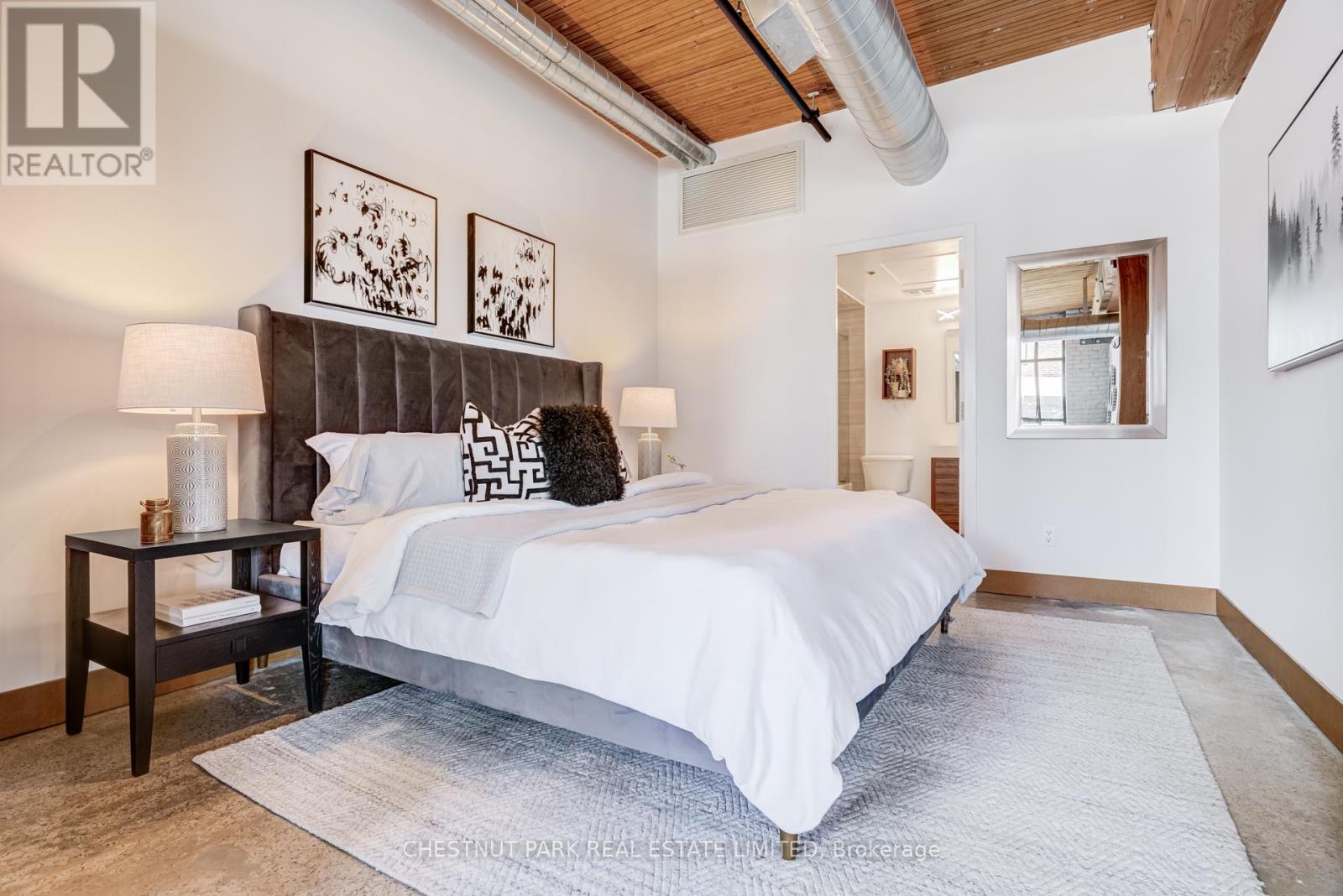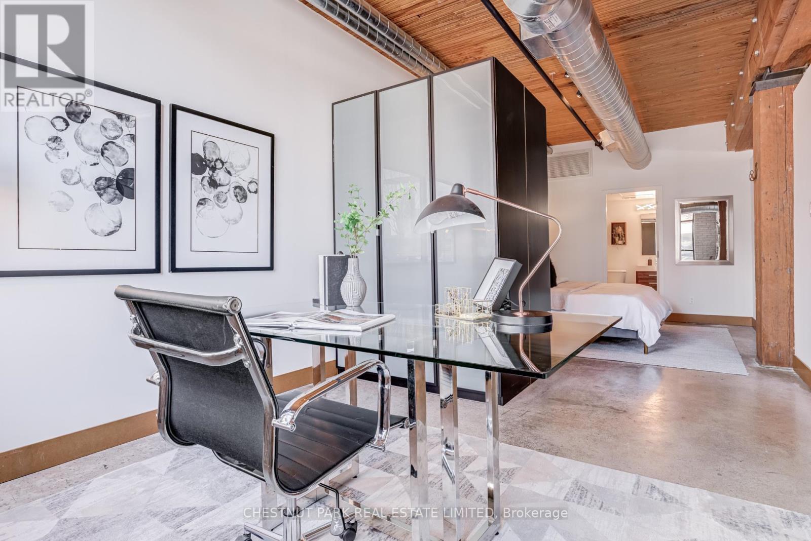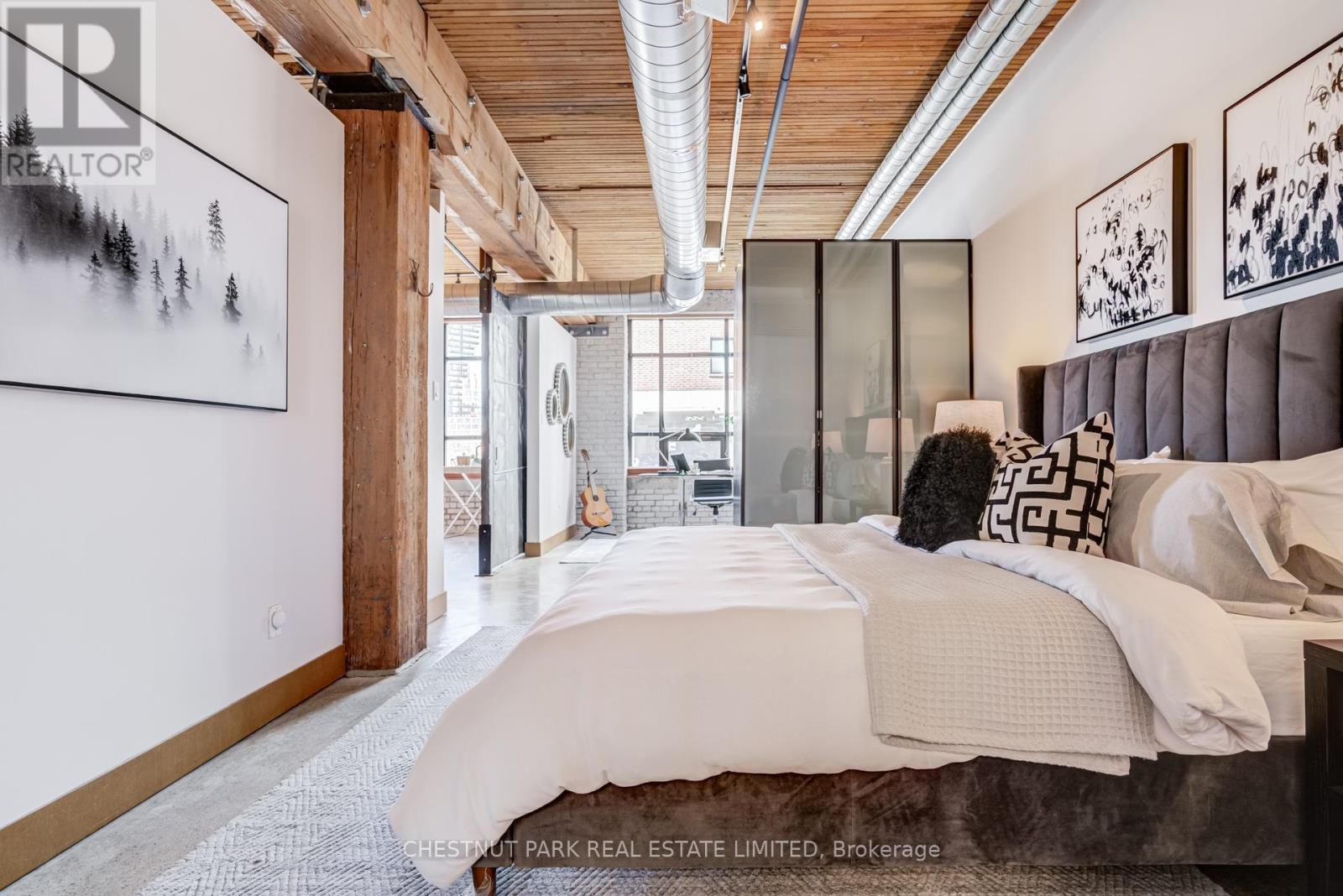 Spectacular brick-and-beam true hard loft in the Broadview Lofts, one of Toronto's most iconic and in the Broadview sought-after hard loft conversions. Perfectly positioned in the heart of vibrant Riverside, this rare extra-wide 2-bedroom, 2-bathroom residence offers almost 1300 sq. ft. of authentic industrial-chic living designed for those who appreciate character, scale, and style.From the moment you enter, the architectural details make a statement. Soaring 10.5 ft. wood beam ceilings, original Douglas fir posts, exposed brick walls, polished concrete floors, oversized warehouse windows, and original metal doors create a dramatic yet warm aesthetic that simply cannot be replicated in new construction. Every element reflects the building's rich history while offering the comfort and functionality modern urban professionals expect.The expansive open-concept layout provides exceptional flexibility for entertaining, working from home, or creating distinct living and dining zones without sacrificing flow. The extra width of the suite enhances the sense of volume and light, while two full bathrooms offer rare practicality in authentic hard loft living. Whether hosting dinner parties, enjoying quiet evenings in, or designing a space that reflects your personal brand and creativity, this loft adapts effortlessly to your lifestyle.Exclusive underground parking and a large locker add everyday convenience, while the surrounding neighbourhood offers some of the city's best cafés, restaurants, boutiques, fitness of the studios, and transit options just steps from your door.This is more than a condo. It is a statement space in a landmark building, offering scale, statement space authenticity, and an unmatched east-end energy that continues to define Toronto living. (id:64974)