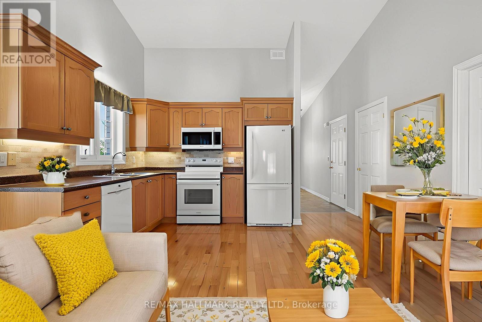 Beautiful bungalow-style home featuring SOARING VAULTED CEILINGS and an expansive open-concept Living Room and Dining Room with GLEAMING HARDWOOD FLOORS throughout the main living space. Oversized windows fill the home with Natural Light, creating a BRIGHT AND AIRY atmosphere and a WELCOMING FLOW throughout. Spacious Kitchen with AMPLE CABINETRY, Tile Backsplash, Double Sink, Built-In Microwave, Dishwasher, Refrigerator and Stove overlooking the Main Living Area, ideal for ENTERTAINING WITH EASE or comfortable everyday living. Walk-out from the Living Room to a PRIVATE ELEVATED DECK Overlooking Open Green Space with NO DIRECT REAR NEIGHBOURS, offering PEACEFUL VIEWS and ADDED PRIVACY. Generous Primary Bedroom with LARGE WALK-IN CLOSET and plush broadloom designed for RELAXED COMFORT. Well-appointed 3-Piece Bathroom with GLASS ENCLOSED SHOWER and extended vanity providing FUNCTIONAL DESIGN. Convenient Main Floor Laundry for everyday practicality. Full unfinished Basement with EXCELLENT CEILING HEIGHT, Large Windows and Cold Storage Room presenting FUTURE DEVELOPMENT POTENTIAL for additional Living Space, Recreation Room or Bedrooms. Attached single-car Garage with opener and interior access adds everyday convenience. A wonderful opportunity to enjoy OPEN-CONCEPT LIVING in a quiet setting close to Amenities, Parks and Transit. (id:64974)