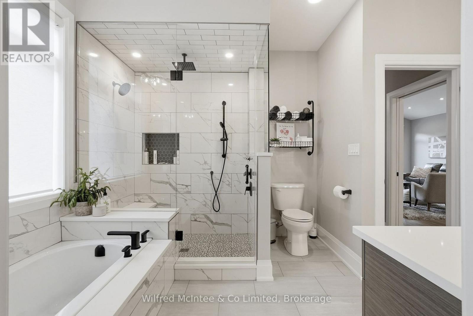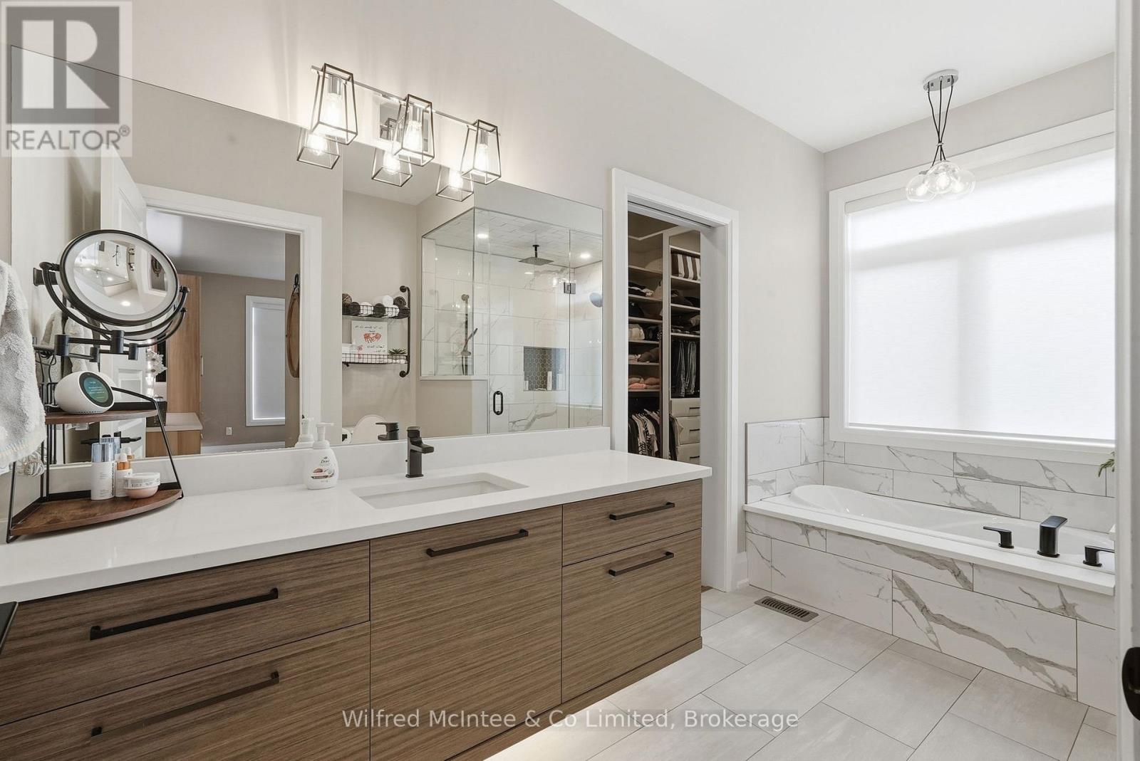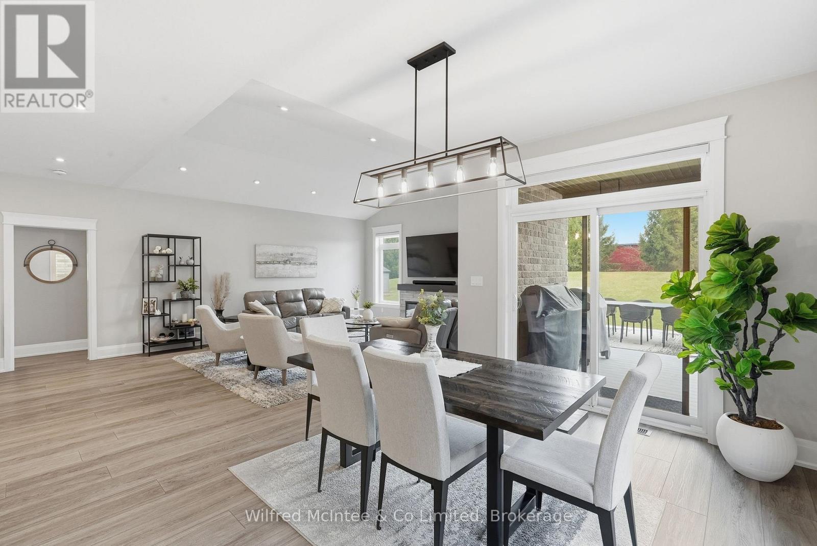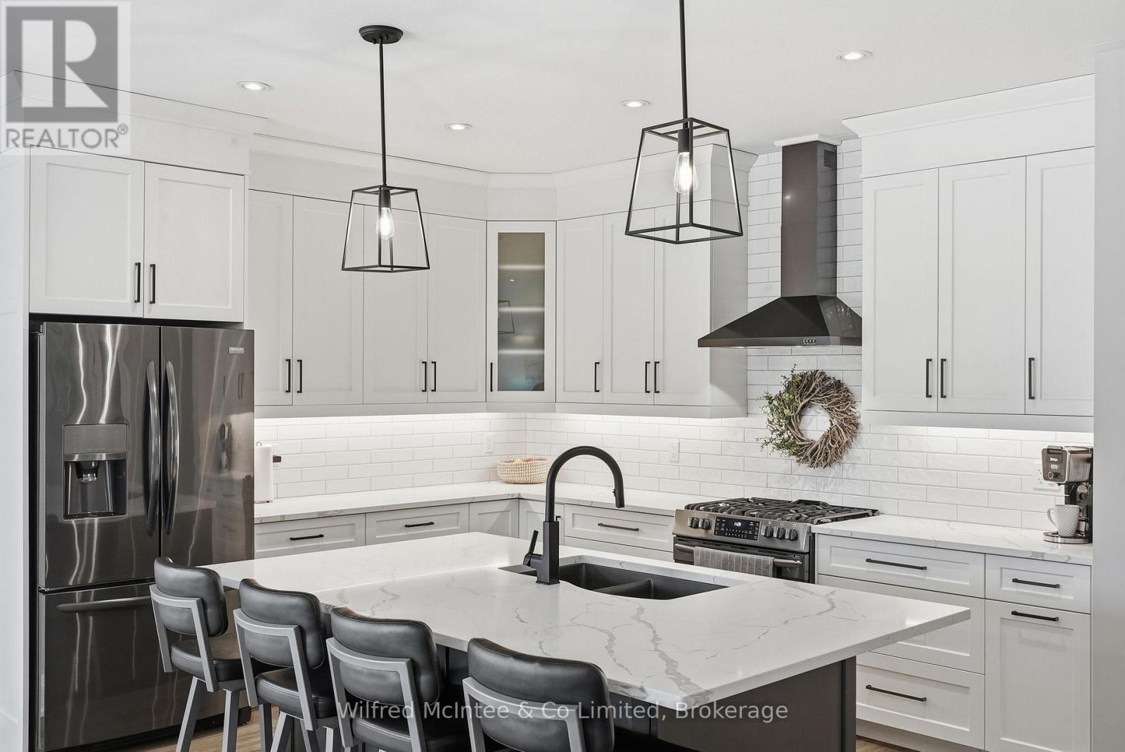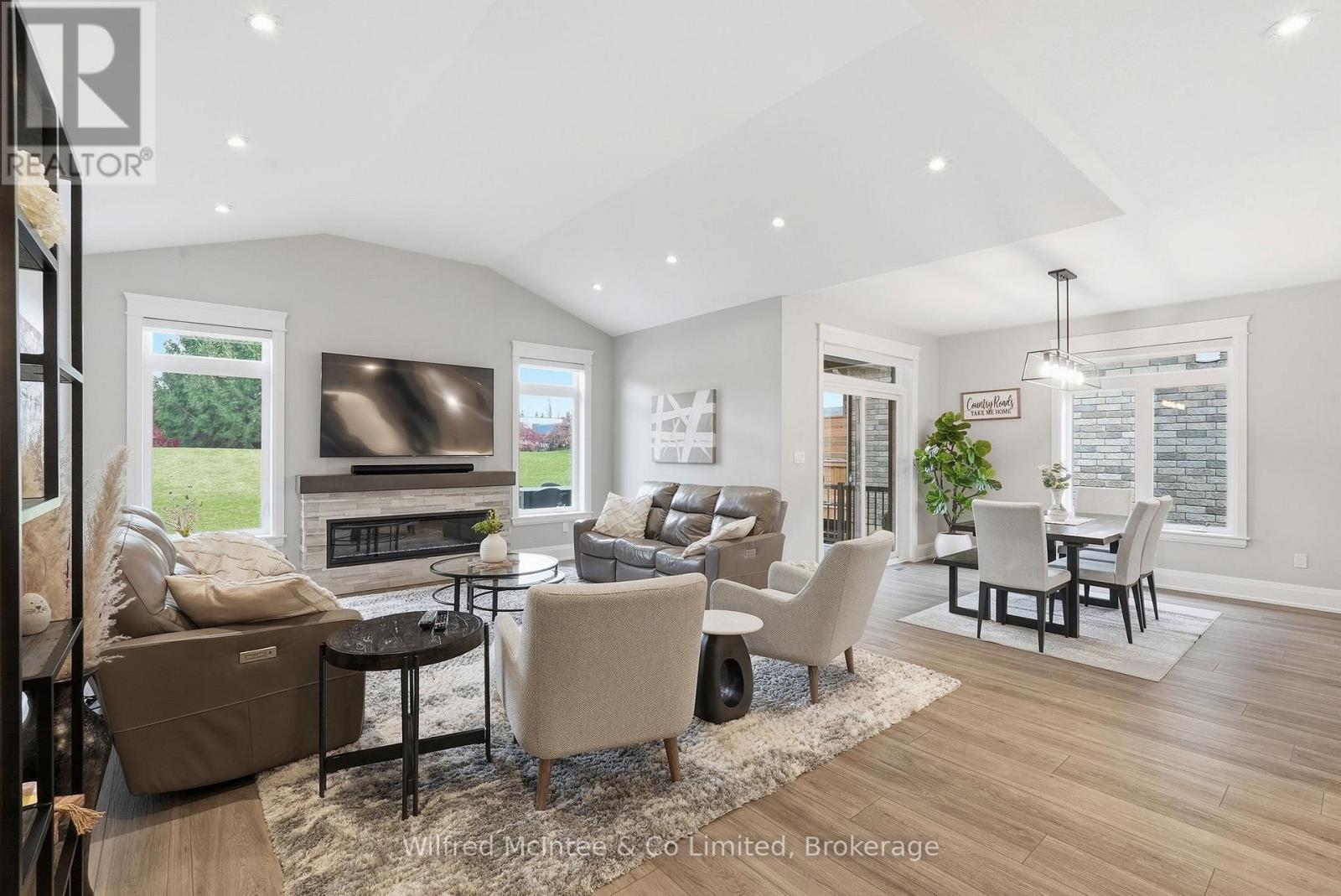 Welcome to 105 Fourth Street in Walkerton! This exquisite, magazine-worthy bungalow built in 2020 by the highly regarded Candue Homes is perfectly positioned on an exceptionally deep and private lot in one of Walkerton's most sought-after family-friendly neighborhoods. From the moment you enter this show-stopping residence, you're greeted by a bright, sophisticated interior defined by sleek lines, upscale finishes, and impeccable attention to detail. At the heart of the home is a chef-inspired, designer kitchen featuring stainless steel appliances, elegant white cabinetry, quartz countertops and breakfast bar. The adjoining dining area flows seamlessly to a low-maintenance aluminum deck, extending to a private patio oasis complete with a custom gas fire table topped in granite-ideal for relaxing evenings! The living room highlighted by a fireplace exudes warmth and sophistication. The main level also features a spacious bedroom with a walk-in closet, a beautifully finished 3-piece bath with a tiled shower, a convenient laundry room, and a grand primary suite boasting a spa-inspired ensuite and a stunning custom walk-in closet showcasing cutting-edge design and exceptional storage solutions. The fully finished lower level is equally impressive, offering an expansive and beautifully detailed family room, two additional well-appointed bedrooms, a gorgeous 4-piece bathroom, and a practical utility space. A convenient walk-up provides direct access to the heated double car garage, which is fully outfitted with premium Ribtrax flooring and built-in storage systems-delivering organization and versatility. Outside, the tastefully landscaped grounds are both elegant and low-maintenance. This exceptional property is a rare blend of modern luxury, thoughtful design, and effortless living-an absolute must-see in Walkerton. (id:64974)