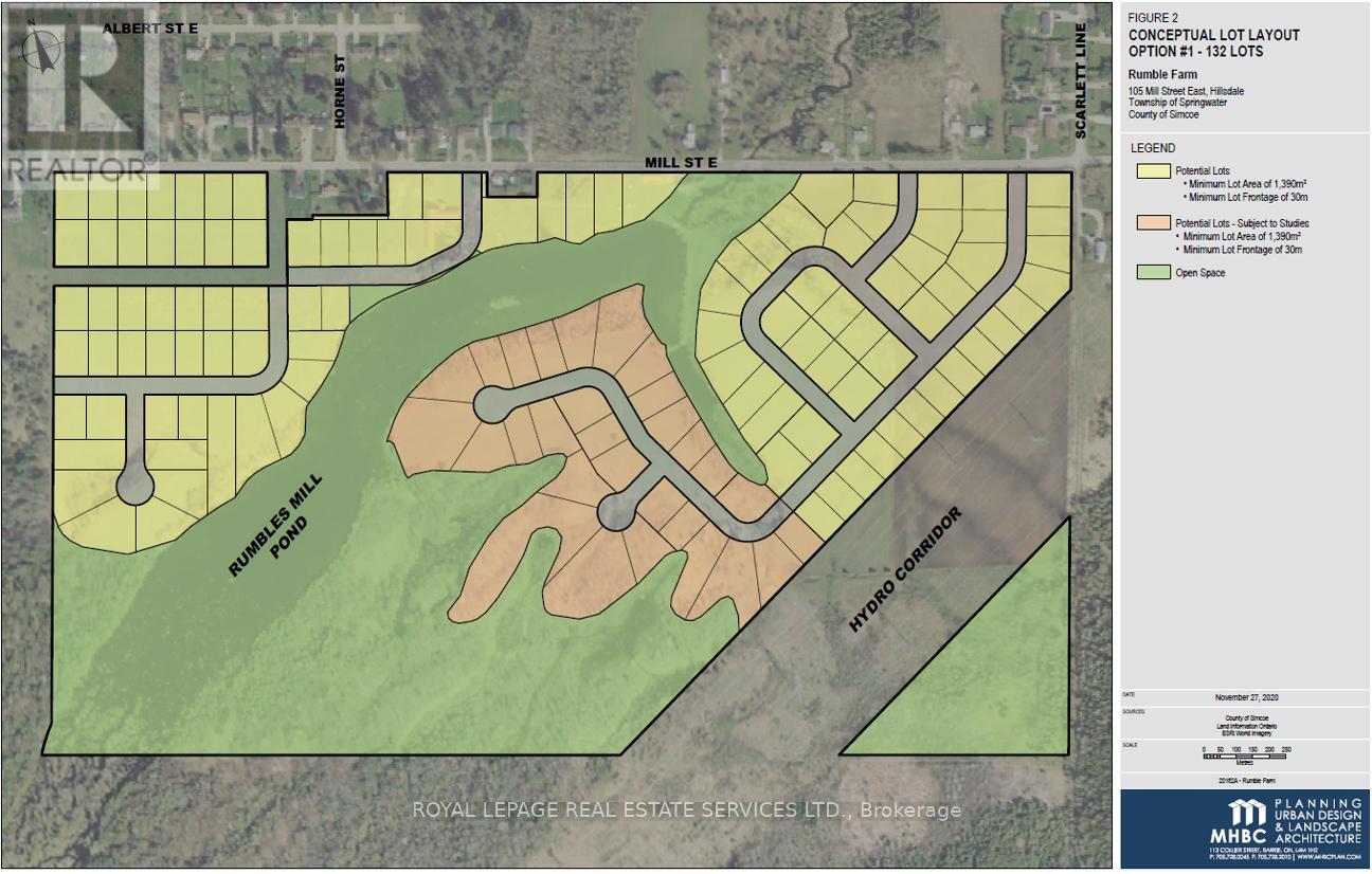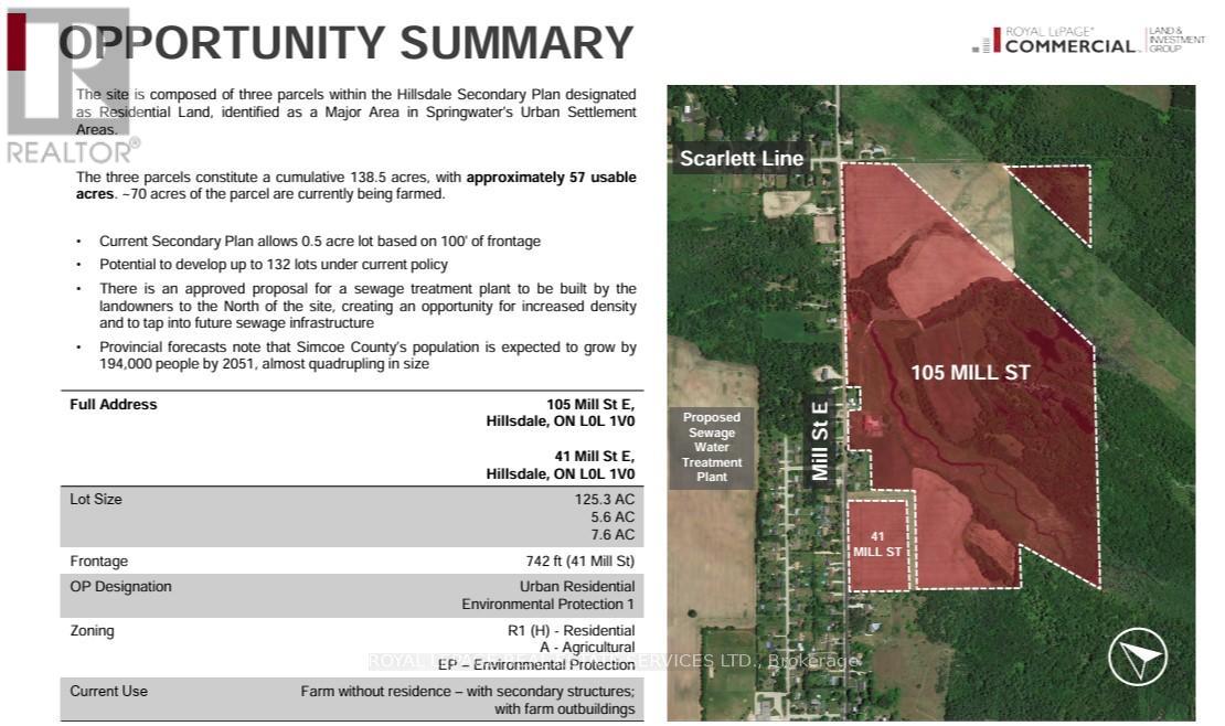 The site is composed of three parcels within the Springwater Simcoe Hillsdale Secondary Plan designatedas Residential Land, identified as a Major Area in Springwater's Urban Settlement Areas. The three parcels constitute a cumulative 138.5 acres, with approximately 57 usable acres. ~70 acres of the parcel are currently being farmed. Current Secondary Plan allows 0.5 acre lot based on 100' of frontage Potential to develop up to 132 lots under current policy There is an approved proposal for a sewage treatment plant to be built by the landowners to the North of the site, creating an opportunity for increased density and to tap into future sewage infrastructure Provincial forecasts note that Simcoe County's population is expected to grow by 194,000 people by 2051, almost quadrupling in size. (id:64974)