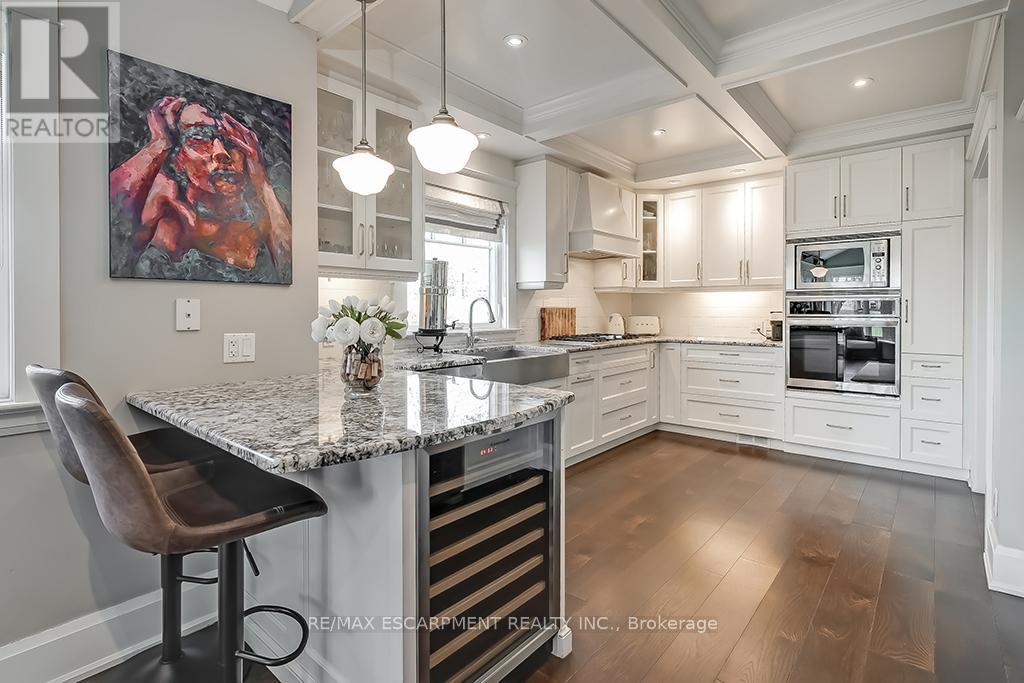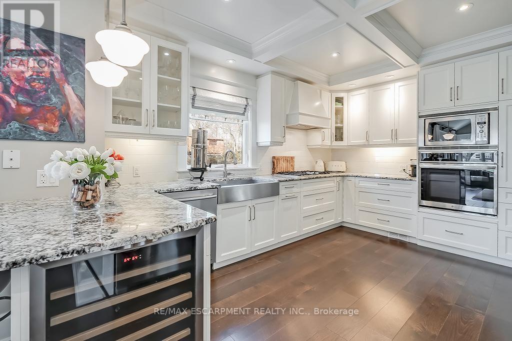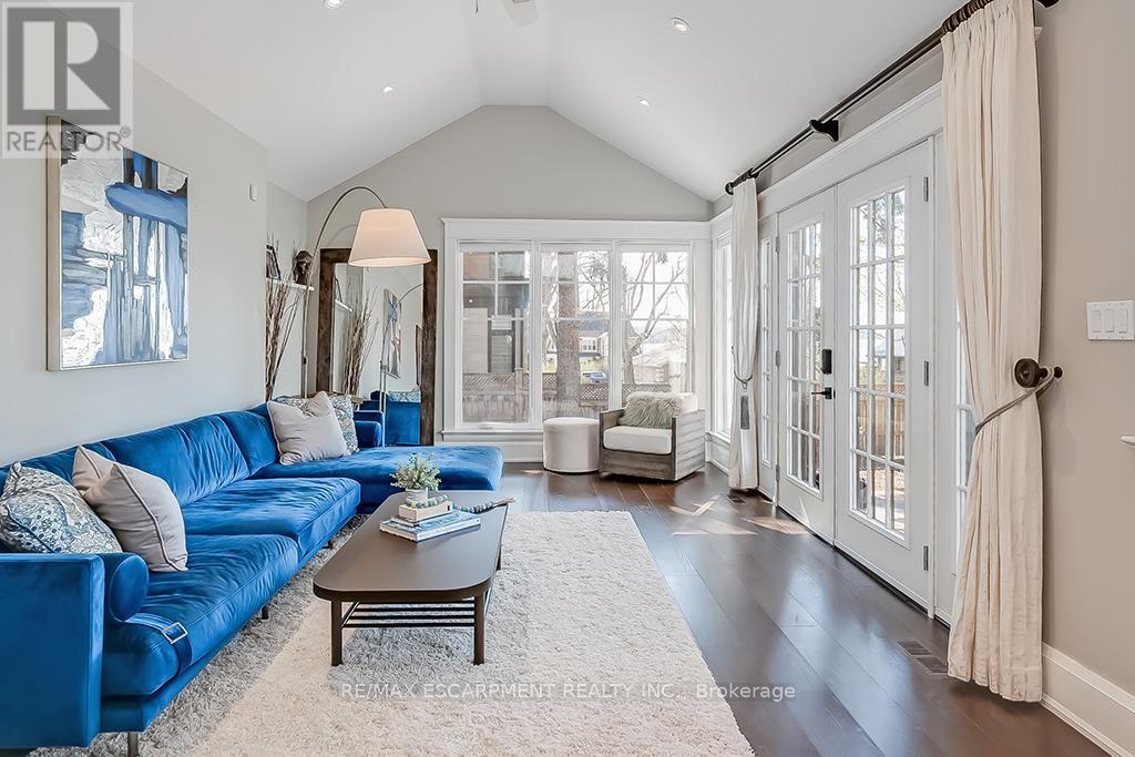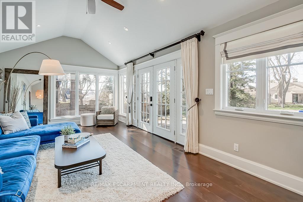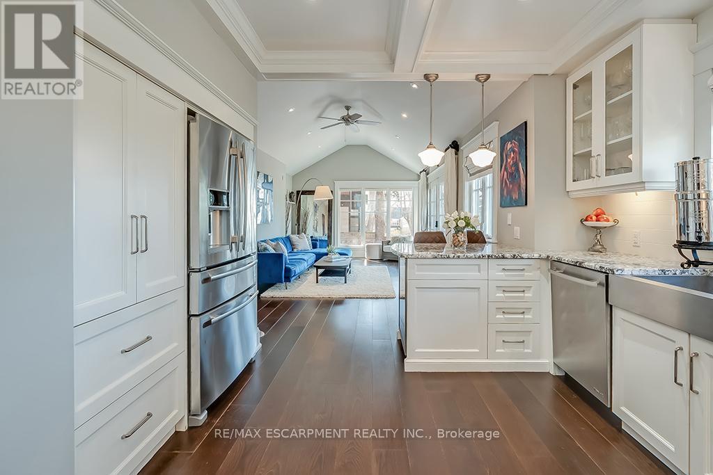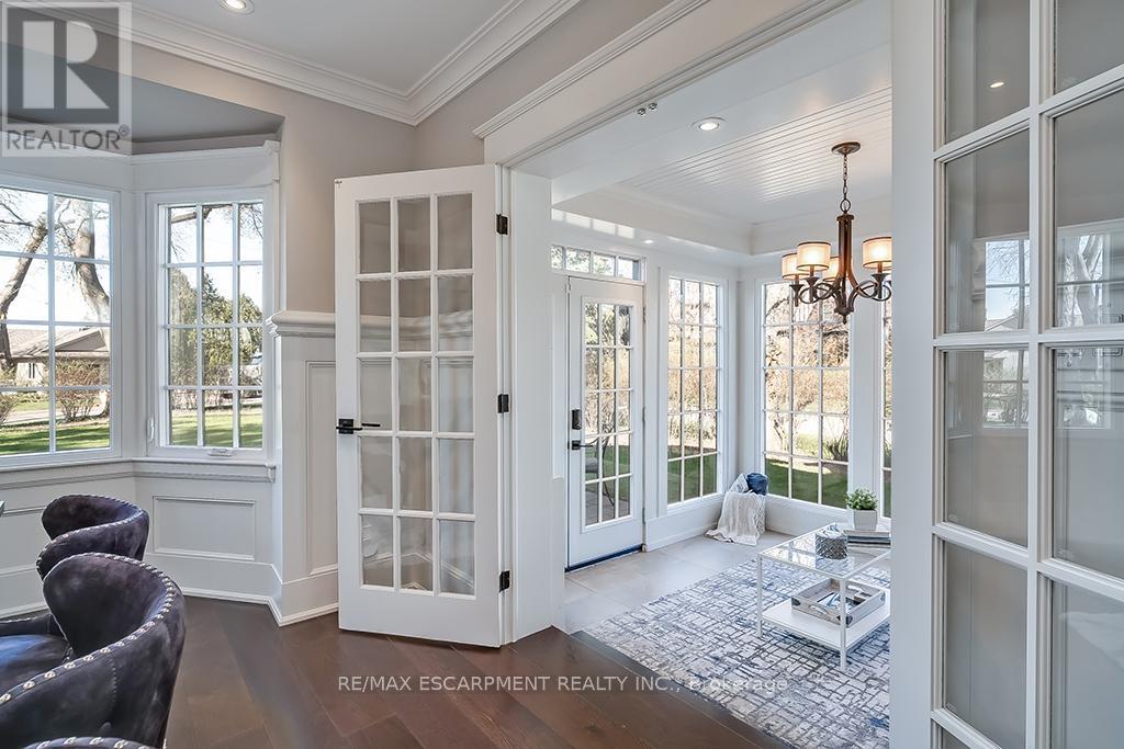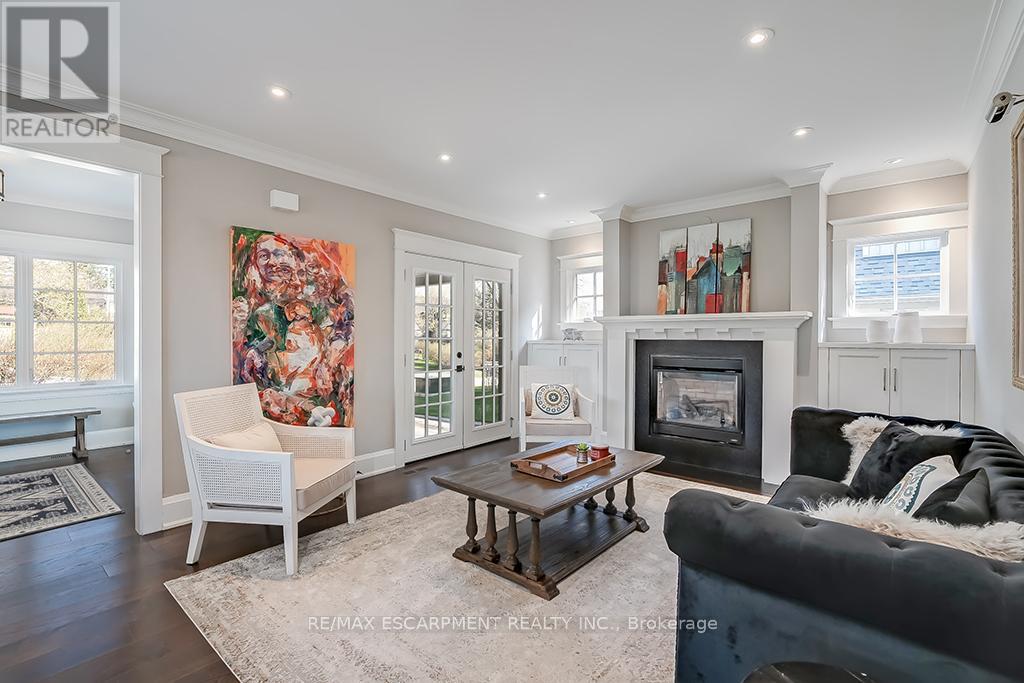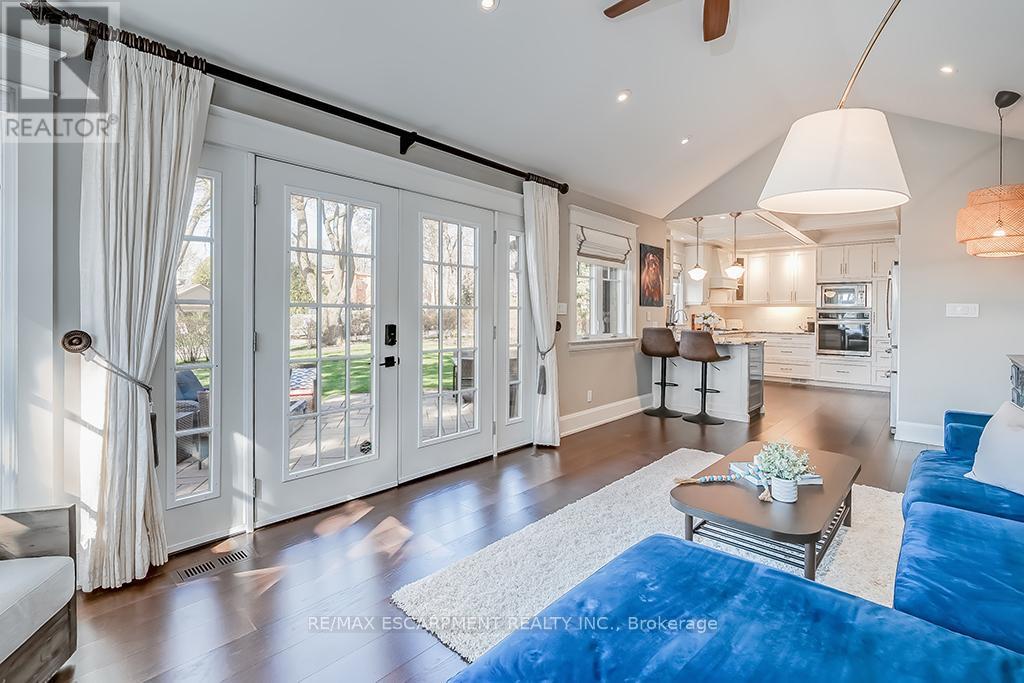 Beautifully upgraded character home in Aldershot's exclusive "Indian Point"! Just steps to downtown, the bay/lake, restaurants, shops,parks, highway access and the Burlington Golf & Country Club! Stunning custom kitchen with granite, coffered ceiling, stainless steelappliances, gas cooktop and a subway tile backsplash. Spacious family room with vaulted ceiling and a walkout to a large patiooverlooking a tranquil outdoor setting. Living room with gas fireplace and large separate dining room with bay window and wainscotingopens to a charming sunroom with tray ceiling and walkout. The upper level features three bedrooms including two with stunning viewsof Burlington Bay and a primary bedroom with spa-inspired 5-piece ensuite and a separate dressing room! Hardwood floors, crownmoulding, pot lighting and loads of natural light throughout! Main level laundry/mudroom with inside entry from a double garage with EVcharger and two driveways with combined parking for at least 8 cars. 3+1 bedrooms and 2.5 bathrooms. (id:64974)