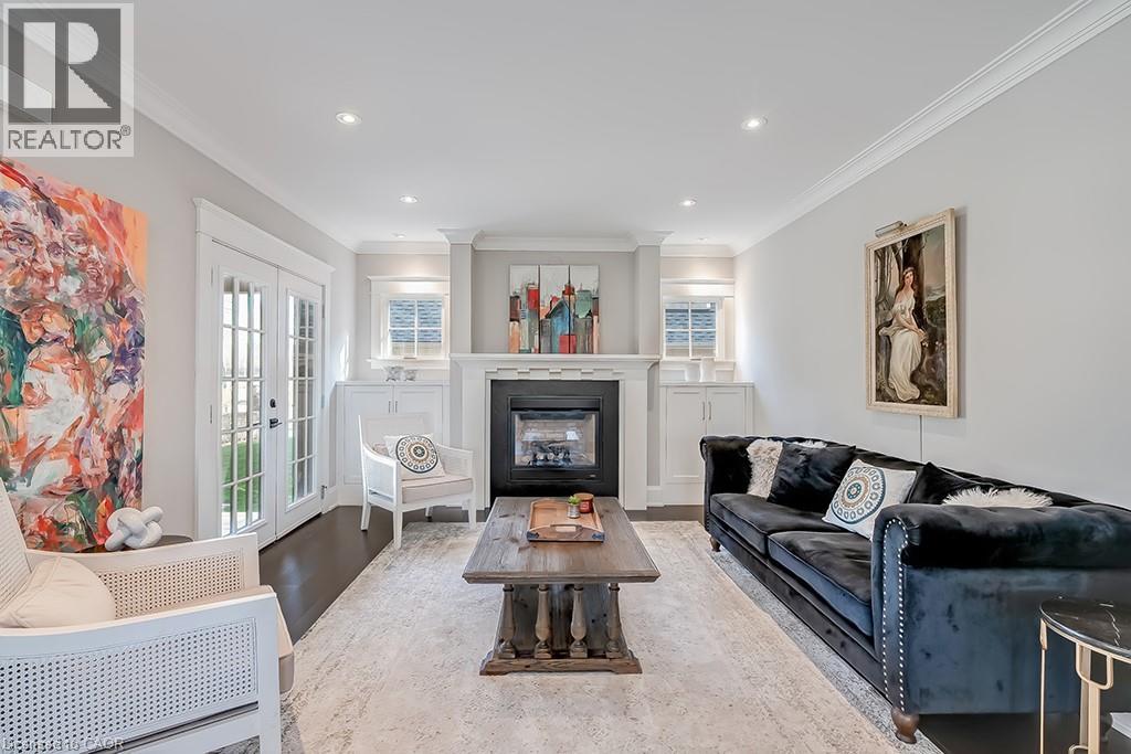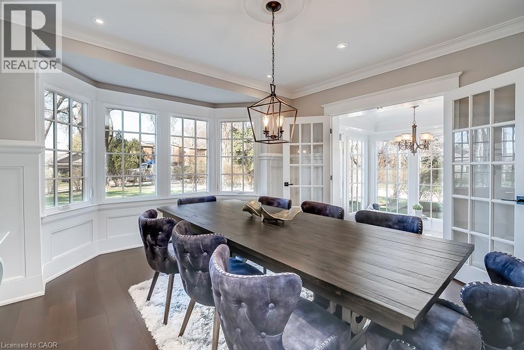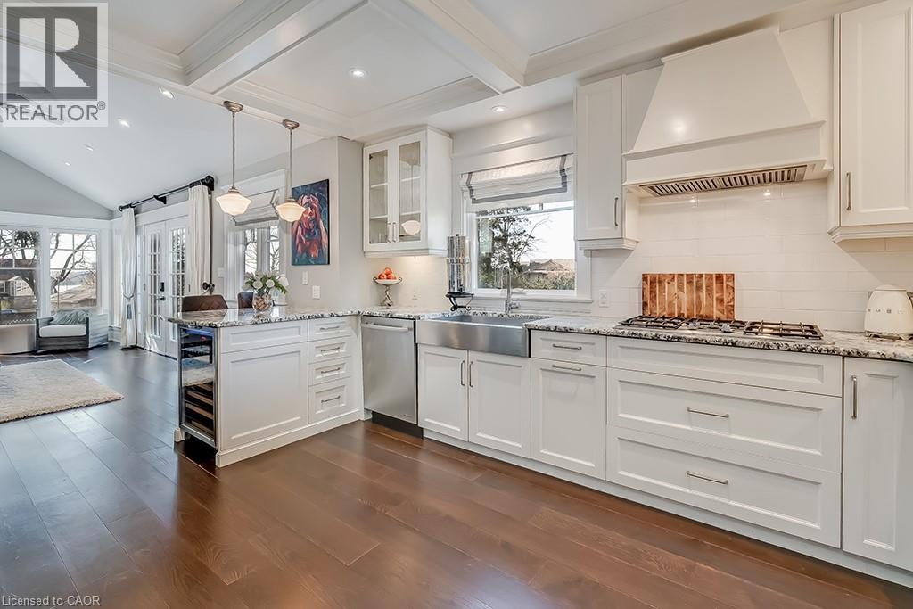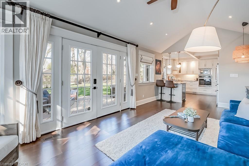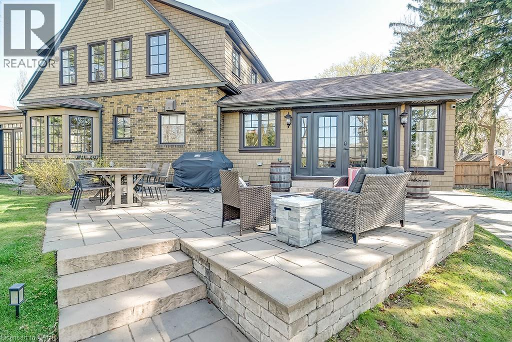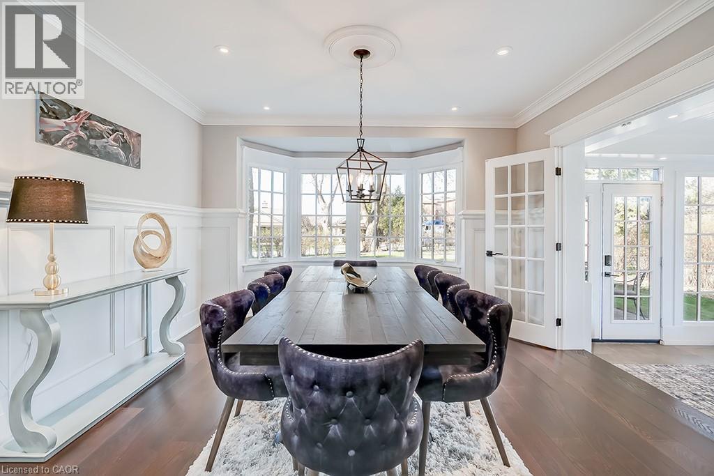 Beautifully upgraded character home in Aldershot's exclusive Indian Point! Just steps to downtown, the bay/lake, restaurants, shops, parks, highway access and the Burlington Golf & Country Club! Stunning custom kitchen with granite, coffered ceiling, stainless steel appliances, gas cooktop and a subway tile backsplash. Spacious family room with vaulted ceiling and a walkout to a large patio overlooking a tranquil outdoor setting. Living room with gas fireplace and large separate dining room with bay window and wainscoting opens to a charming sunroom with tray ceiling and walkout. The upper level features three bedrooms including two with stunning views of Burlington Bay and a primary bedroom with spa-inspired 5-piece ensuite and a separate dressing room! Hardwood floors, crown moulding, pot lighting and loads of natural light throughout! Main level laundry/mudroom with inside entry from a double garage with EV charger and two driveways with combined parking for at least 8 cars. 3+1 bedrooms and 2.5 bathrooms. (id:64974)