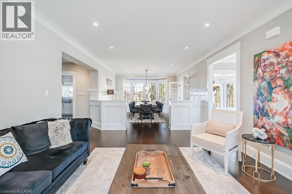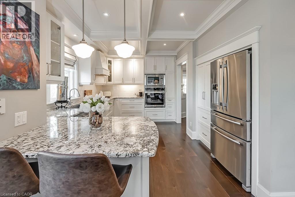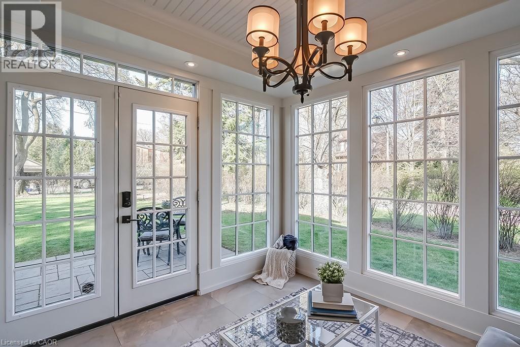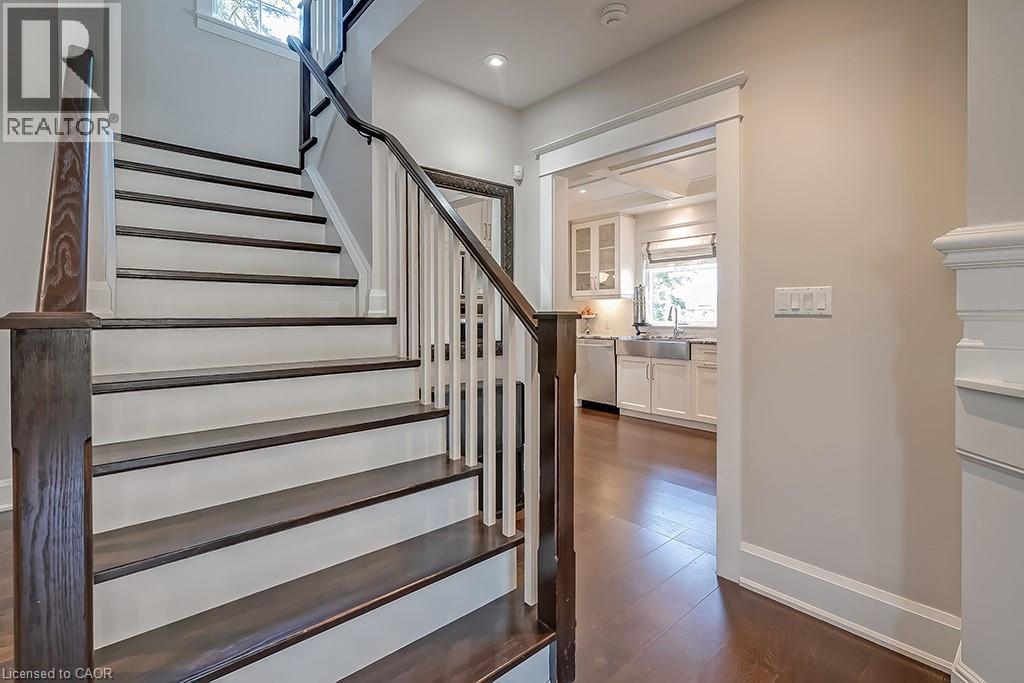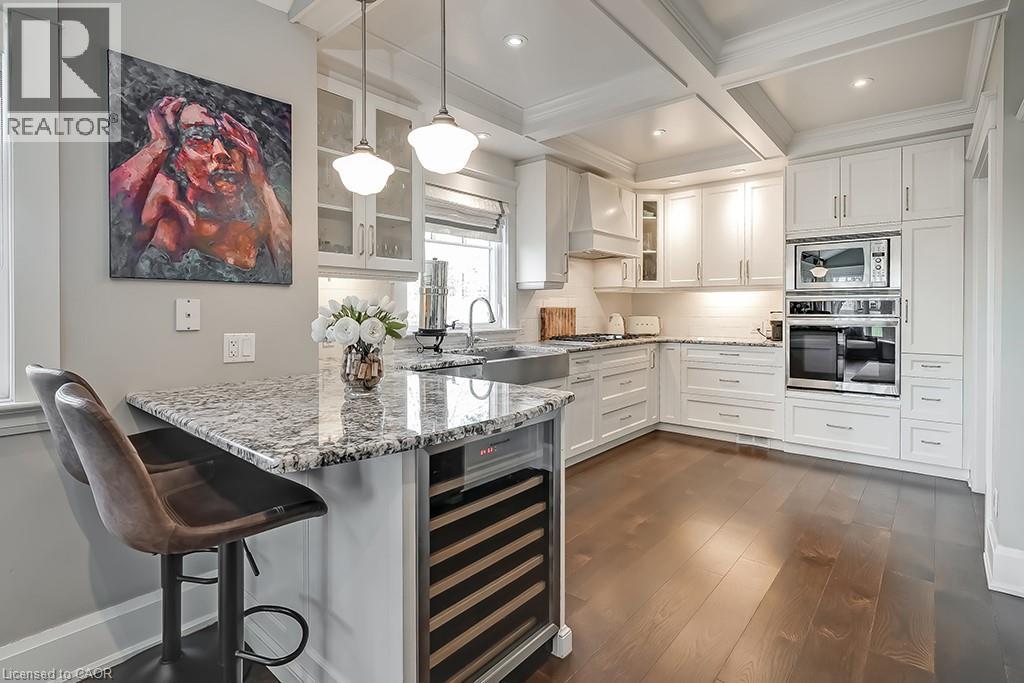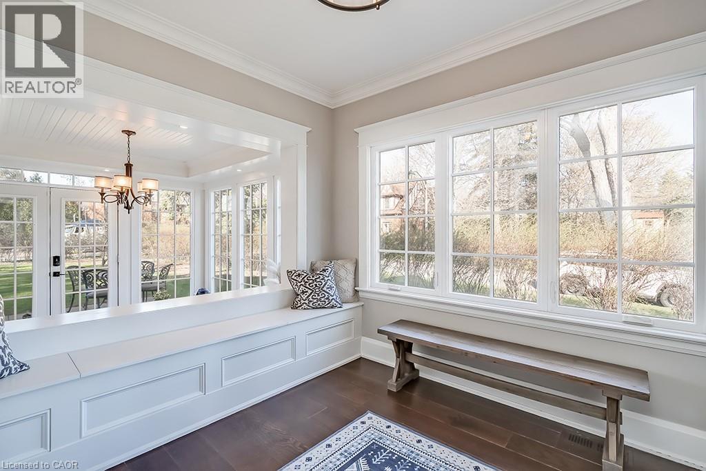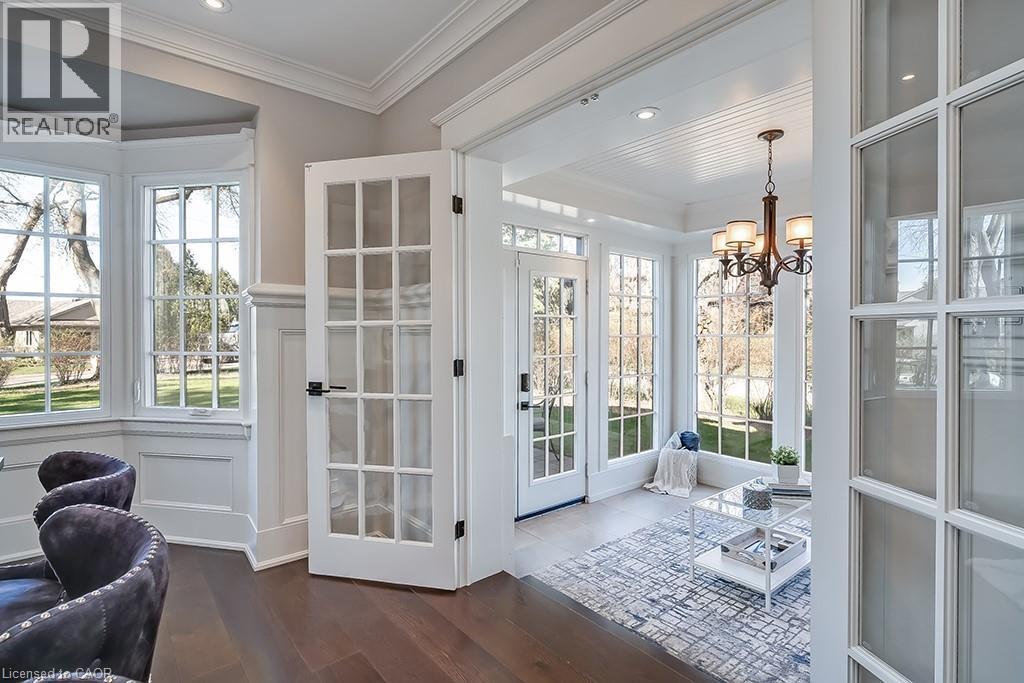 Beautifully upgraded character home in Aldershot's exclusive Indian Point! Just steps to downtown, the bay/lake, restaurants, shops, parks, highway access and the Burlington Golf & Country Club! Stunning custom kitchen with granite, coffered ceiling, stainless steel appliances, gas cooktop and a subway tile backsplash. Spacious family room with vaulted ceiling and a walkout to a large patio overlooking a tranquil outdoor setting. Living room with gas fireplace and large separate dining room with bay window and wainscoting opens to a charming sunroom with tray ceiling and walkout. The upper level features three bedrooms including two with stunning views of Burlington Bay and a primary bedroom with spa-inspired 5-piece ensuite and a separate dressing room! Hardwood floors, crown moulding, pot lighting and loads of natural light throughout! Main level laundry/mudroom with inside entry from a double garage with EV charger and two driveways with combined parking for at least 8 cars. 3+1 bedrooms and 2.5 bathrooms. (id:64974)