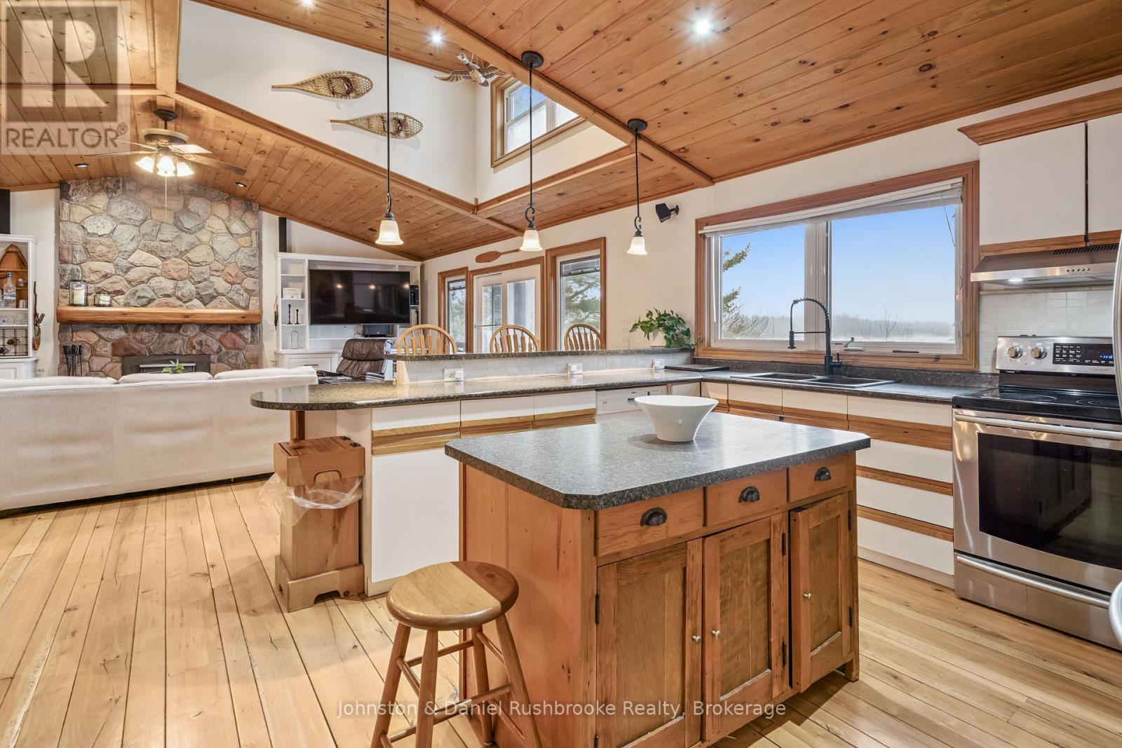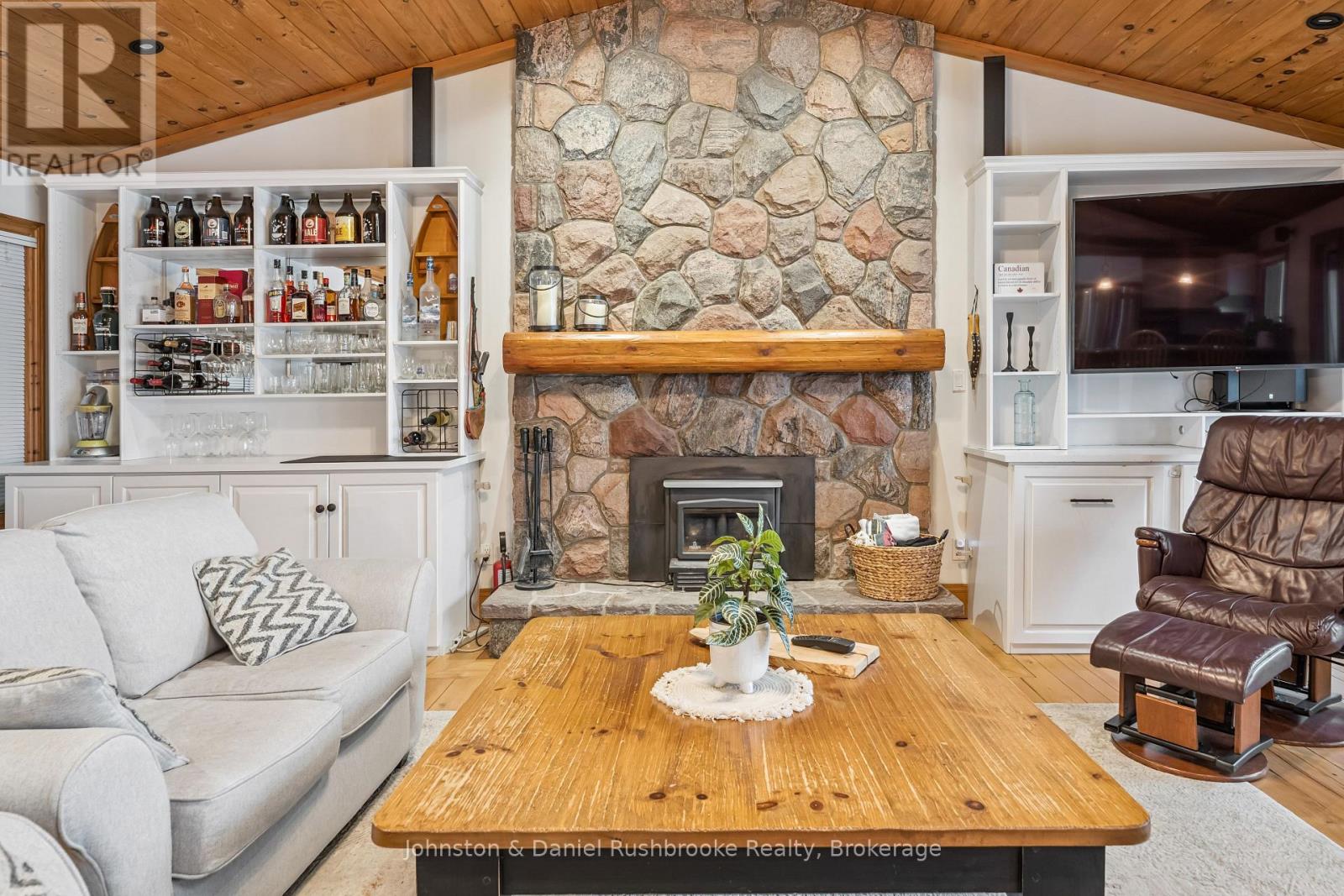 Get ready for the summer of 2026 at this inviting four-season Morrison Lake retreat. Ideally situated on a gently sloping lot with 146 feet of prime southwest-facing waterfrontage, this property presents the classic Muskoka experience for the whole family. The sun-soaked shoreline provides a gentle entry into a sandy area that is ideal for little ones, while the floating raft is perfectly positioned for swimming in deeper water. With southwest exposure, you are treated to beautiful natural light throughout the day and breathtaking evening sunsets from the dock or the lakeside firepit.Inside, the cottage is thoughtfully designed for family living and entertaining friends. The open-concept kitchen, dining room and living room serve as the heart of the cottage, boasting vaulted pine ceilings, oversized windows, and a beautiful stone wood-burning fireplace. A large walk-out deck enables seamless transitions to the outdoors, making it easy to enjoy a barbecue or a quiet morning coffee while overlooking the lake. The layout showcases three bedrooms, a den and two full bathrooms, including a primary bedroom retreat complete with an ensuite and its own wood-burning stove for cozy autumn nights.Practical highlights abound, such as a Muskoka Room, a detached two-car garage for convenient storage, and an automatic generator for peace of mind. A lakeside hot tub sits just steps from the cottage. The grounds are beautifully landscaped with granite pathways and stairs leading down to the waterfront and dock. Located just 1.5 hrs from Toronto and a short drive from Gravenhurst's amenities, this property balances seclusion with convenience. Whether you are boating, fishing, or simply relaxing by the water, this mostly furnished property is ready for its next chapter of family memories. Do not miss this must-see opportunity to secure your place on the water and start cottaging this summer on popular Morrison Lake. (id:64974)