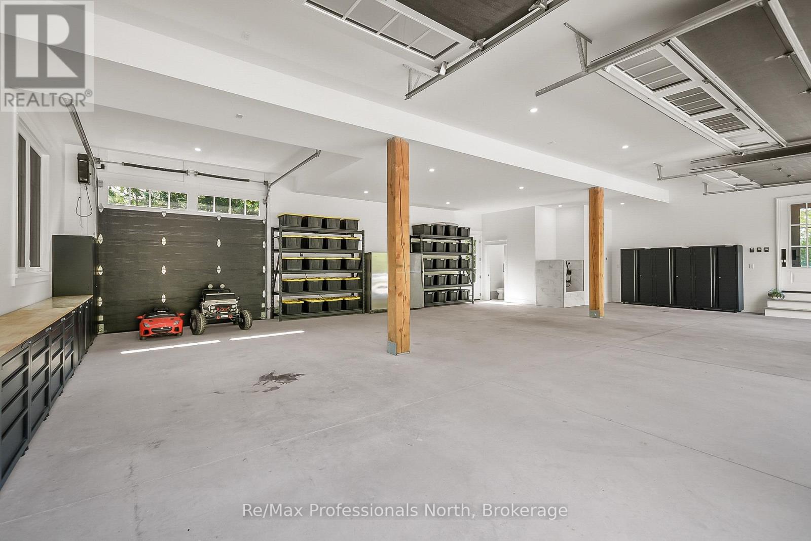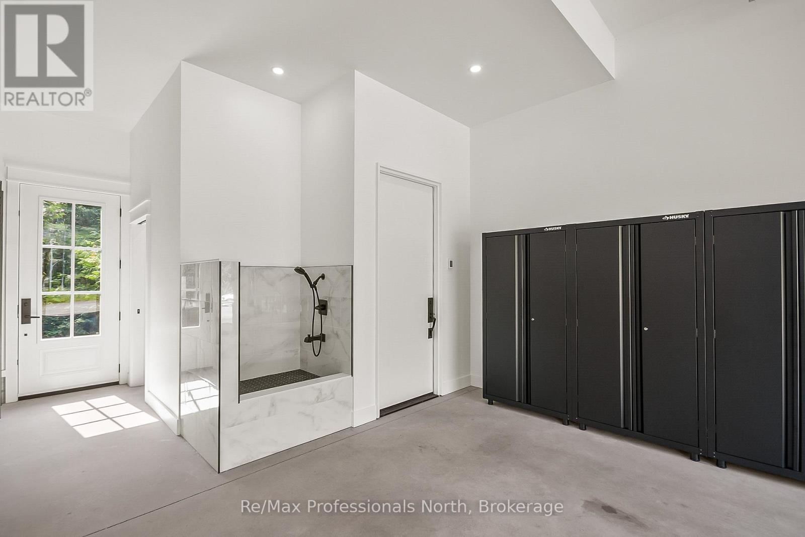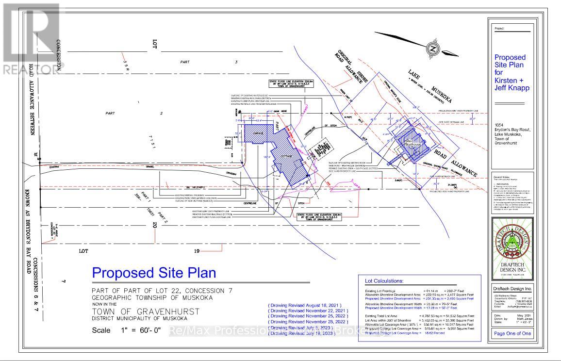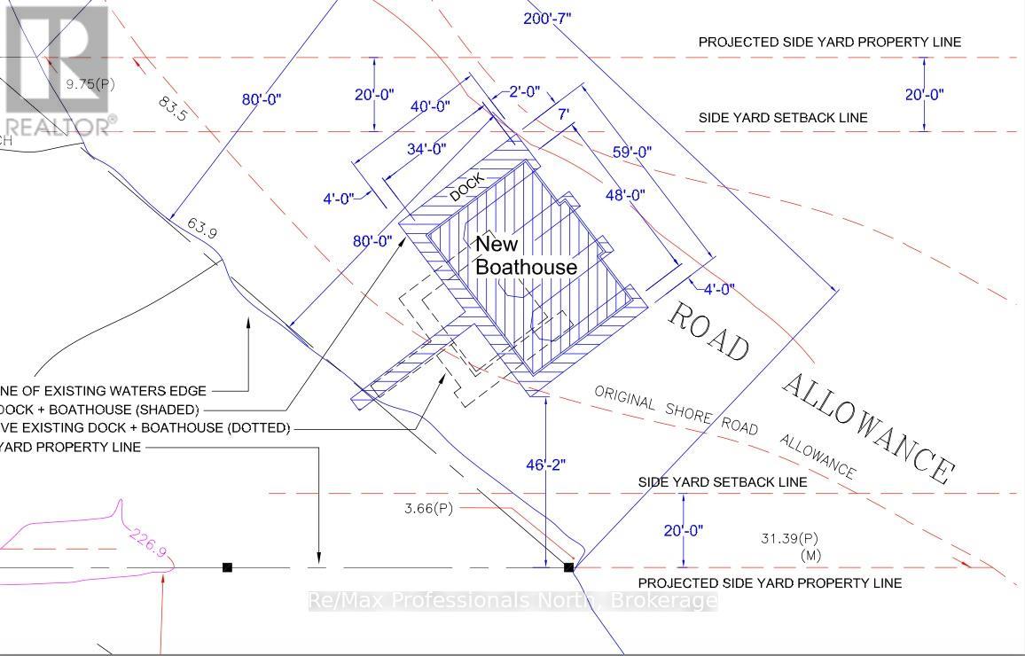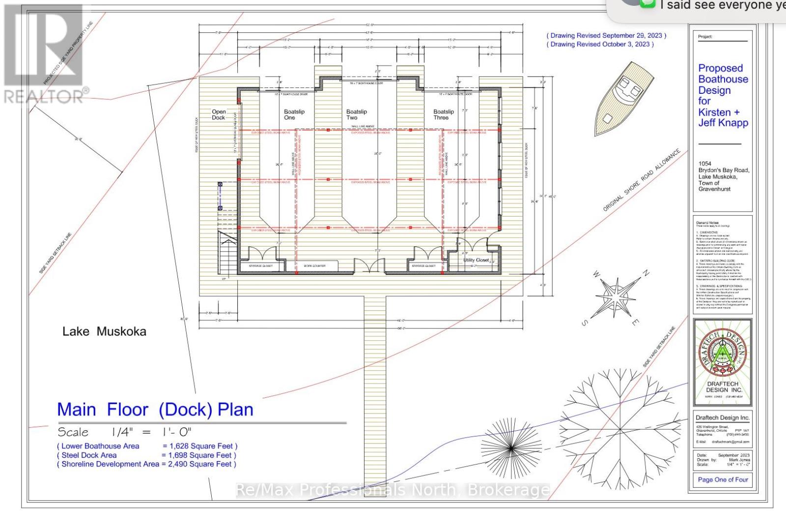 True developer's dream consists of R2 zoning with full municipal services: water, sewer, natural gas and fiber run down your 600' private driveway, very gradual 1.33 acre lot with 270' curved (200' straight line frontage) with coveted NW sunset views and long lake views out the bay. Shallow clean sandy waterfront excellent for pets and people of all ages. Site plan approved for a large attached 5350sqft 2 storey main cottage with 5 bedrooms and 8 additional bathrooms, as well as proposed triple boathouse with 2nd storey deck and storage, with even more lot coverage available for sports courts, additional storage garages etc. The large luxurious carriage house completed in 2023 is just phase 1 of this spectacular property, with enough parking for 7 cars, its approx. 32' deep and 52' wide, space to park boats and other toys, it also has a convenient dog shower, 2 piece washroom, radiant glycol heated slab and mechanical room. The back garage door was planning ahead for the future main cottage as it provides easy access to the lakeside for machines. The carriage house contains 3 bedrooms and 2 bathrooms upstairs with 9' ceilings throughout, vaulted great room with wood beams, granite floor to ceiling fireplace, decorative shiplap, extensive built in cabinets, very large kitchen and island for entertaining, heated with a high end boiler system and natural gas the efficiency is unlike most cottages. Heated floors in the entrance and bathrooms, glass tile bathtubs with the ensuite having a jacuzzi. Whole home 22kw Generac newly installed in 2025. Large windows let lots of natural light in at all hours of the day. Matching shed with metal roof just completed in the forested area on the way to the boathouse. The double boathouse is grandfathered and provides good docking. Low boat traffic due to land bridge next door, no neighbors to the East, just islander parking. Incredible Lake Muskoka property, make this legacy property! (id:64974)