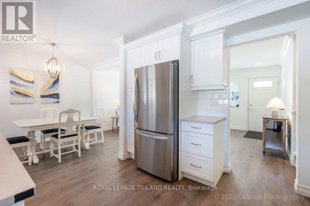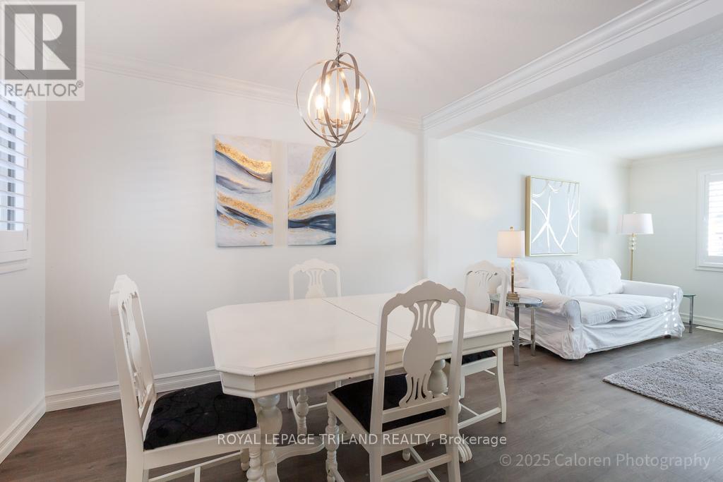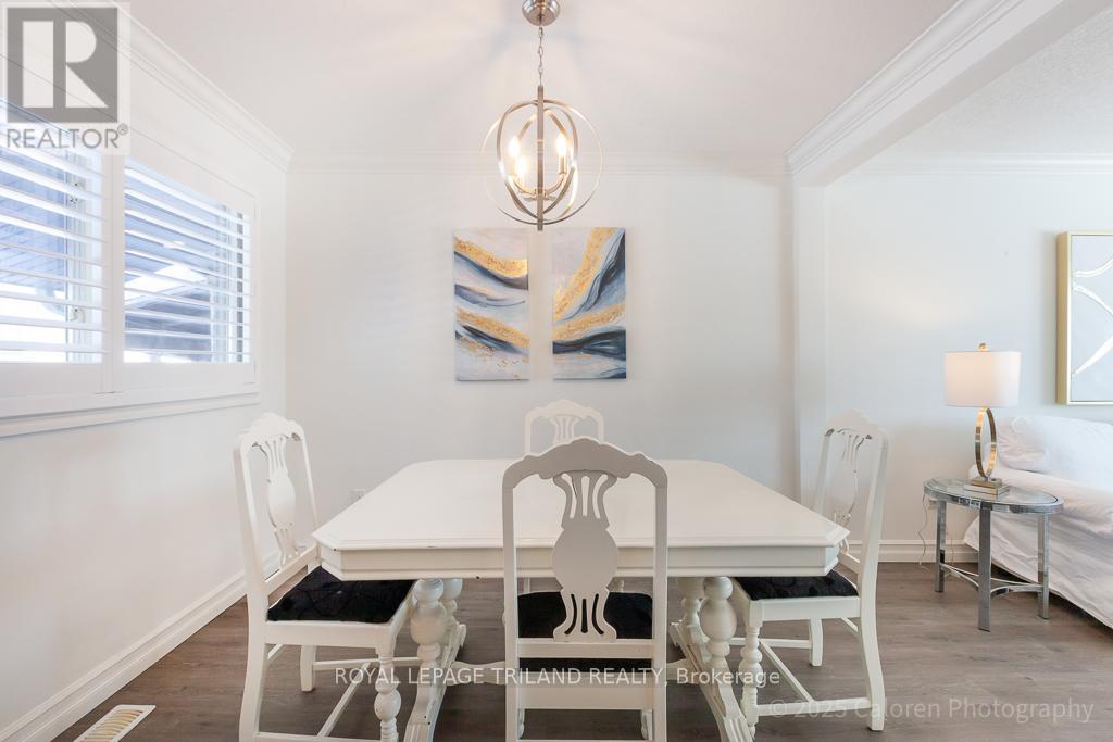 This charming and well-maintained three-level side-split home offers an ideal blend of functionality, comfort, and modern updates-perfect for first-time buyers, young families, or investors seeking a solid property in a desirable Northeast London neighbourhood. The main level features a bright and inviting living room with a large picture window, a dedicated dining area, and a beautifully updated white kitchen (2018) with quality cabinetry, crown moulding, and newer flooring. Upstairs, you'll find three spacious bedrooms and a well-appointed four-piece bathroom.The lower level extends the living space with a thoughtfully finished recreation room featuring oversized windows, a two-piece bath, a laundry area, and abundant storage in the large crawl space. Outdoors, enjoy a deep, fully fenced backyard complete with one storage shed and one garden shed-perfect for BBQs, family gatherings, or gardening enthusiasts. A single-car garage offers additional space ideal for a workshop or hobby area.Recent upgrades include main floor and basement renovations (2018-2020) with spray insulation, drywall, carpeting, a pantry with grid ceiling, new flooring throughout the main and second levels, and modern kitchen finishes. Other notable improvements include a new garage door (2019), gas line and gas stove (2021), updated window coverings and California shutters (2023), new air conditioner and window capping (2024), and a new furnace (2025).Located on a quiet residential street in the heart of London East, this home is within minutes of schools, parks, Stronach Community Centre & Arena, Fanshawe College, shopping, public transit, and major routes including Highway 401. Combining comfort, versatility, and meticulous care, this move-in-ready home presents an exceptional opportunity in a well-connected, family-friendly community. (id:64974)