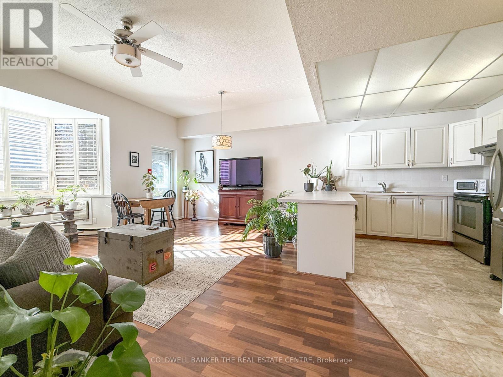 Welcome to Unit 106 at The Ridge Condos, a quiet low-rise adult-oriented building nestled in the heart of Holland Landing. Surrounded by mature trees, this well-maintained ground-floor suite offers a peaceful lifestyle in a serene setting. This bright 1-bedroom + den, 1-bath unit features a private walk-out to the rear grounds-ideal for enjoying the outdoors just steps from your living space. The updated custom kitchen offers modern finishes and functionality, while the renovated bathroom adds a fresh, contemporary touch. The spacious primary bedroom includes ample closet space, and the versatile den is perfect for a home office or guest area. Laminate flooring runs throughout for easy maintenance and a clean aesthetic. Amenities include an exercise room, library, party room, lounge area, gazebo, and picnic space. Conveniently located within walking distance to the local library, seniors' centre, walking trails, and nearby parks. Includes one designated parking space located directly outside the front entrance and a private locker for additional storage. (id:64974)