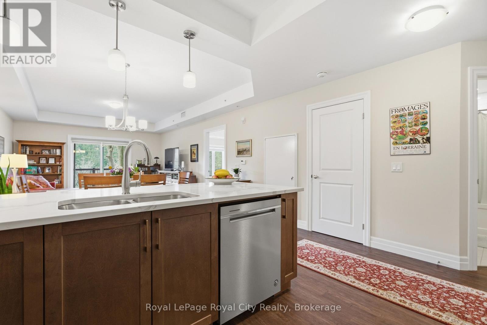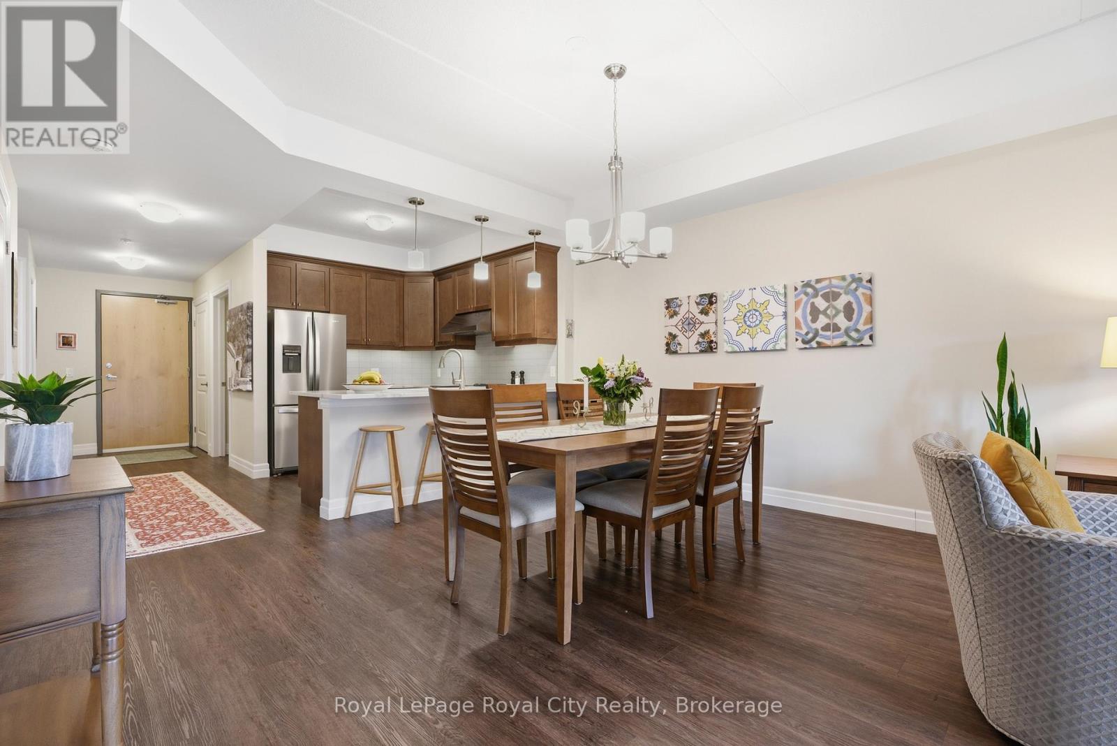 Welcome to unit 106 at 19 Stumpf Street in the highly sought-after Elora Heights condominium, where comfort, space, and spectacular natural surroundings come together. This spacious, fully accessible, main-floor unit offers over 1,300 square feet of thoughtfully designed living space. While located on the main floor, the private balcony is elevated from the road, providing an added sense of privacy and security while you take in the incredible views of the nearby Irvine Gorge. Inside, the bright open-concept layout creates a welcoming atmosphere perfect for everyday living and entertaining. The kitchen features stainless steel appliances, a convenient breakfast bar, and plenty of workspace, flowing seamlessly into a generous dining area and living room with sliding doors that lead to the large covered balcony - an ideal spot to relax and enjoy the scenic surroundings. The primary bedroom is spacious and comfortable, complete with a walk-in closet and a large 3-piece ensuite bathroom. A sizeable den offers the versatility of a second bedroom, guest space, or home office, and is conveniently located next to the unit's second full bathroom. Storage is abundant throughout the condo, including a dedicated in-suite storage room and an oversized, fully enclosed private locker room. Additional features include in-suite laundry, a heated underground parking space, gym and welcoming community room. Situated just a 15-minute walk from the heart of Elora, you'll have easy access to its restaurants, boutique shops, galleries, and vibrant community atmosphere. It's easy to see why visitors from across Ontario are drawn to this beautiful and historic town. Experience easy condo living with exceptional space and an unbeatable natural backdrop at Elora Heights. (id:64974)