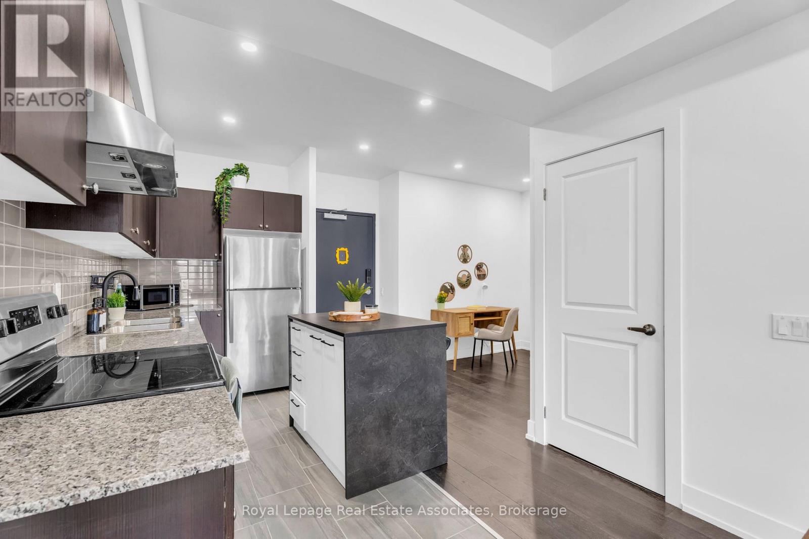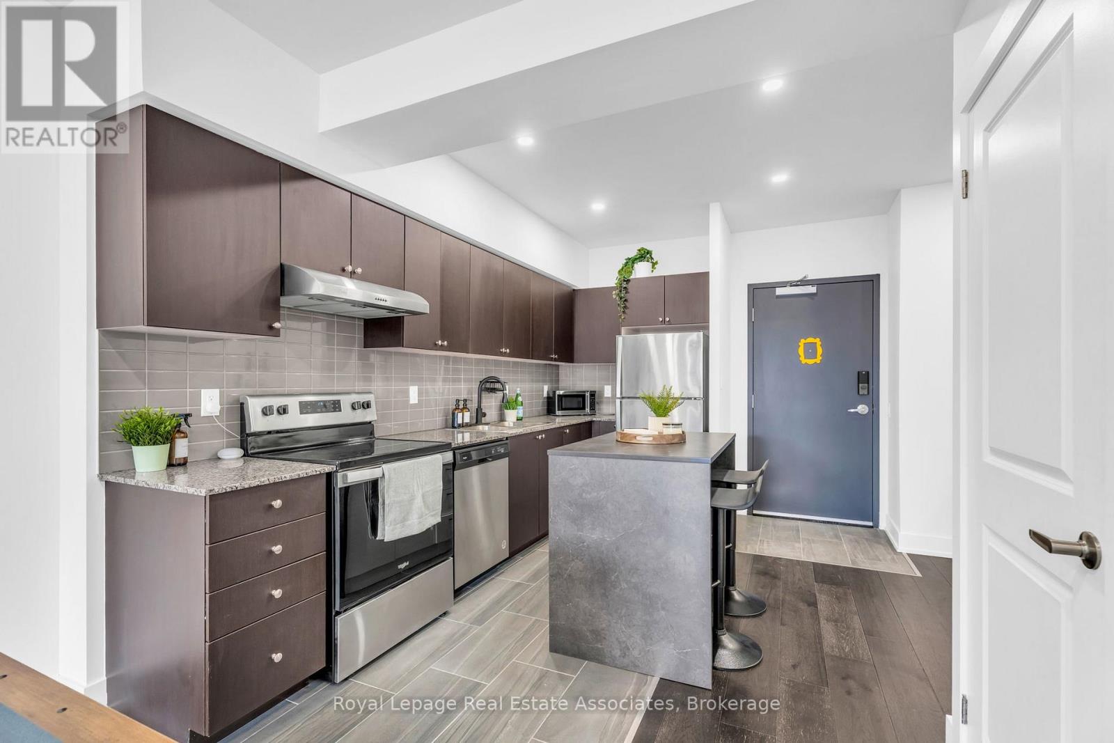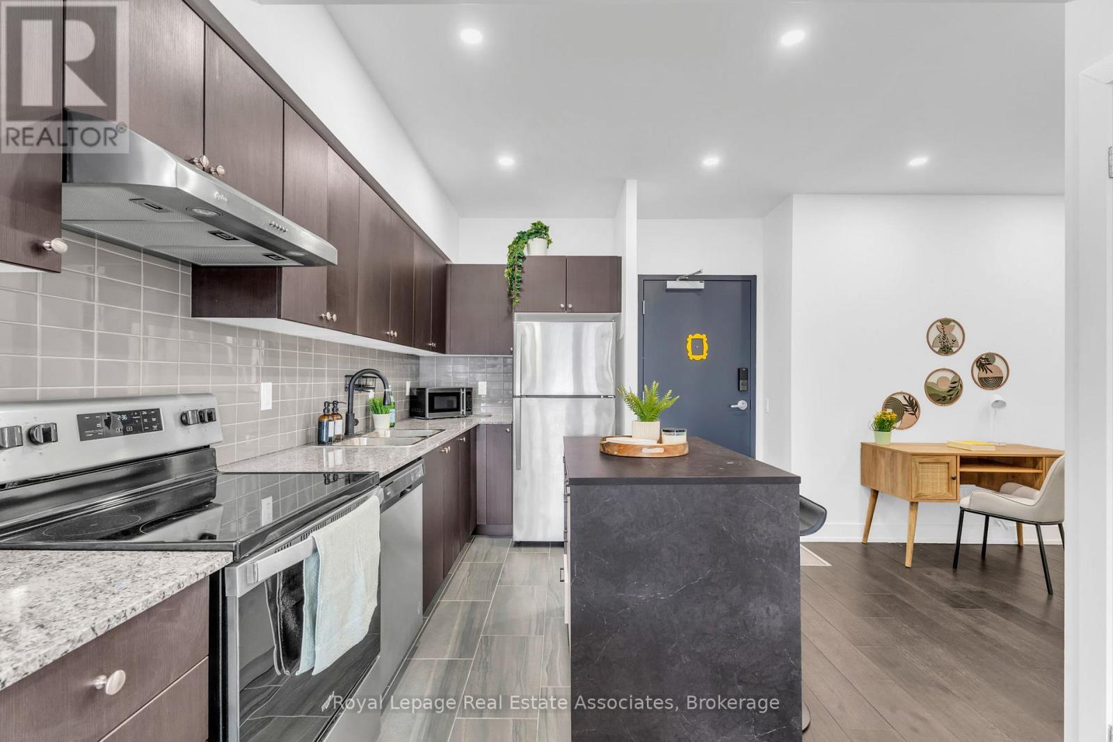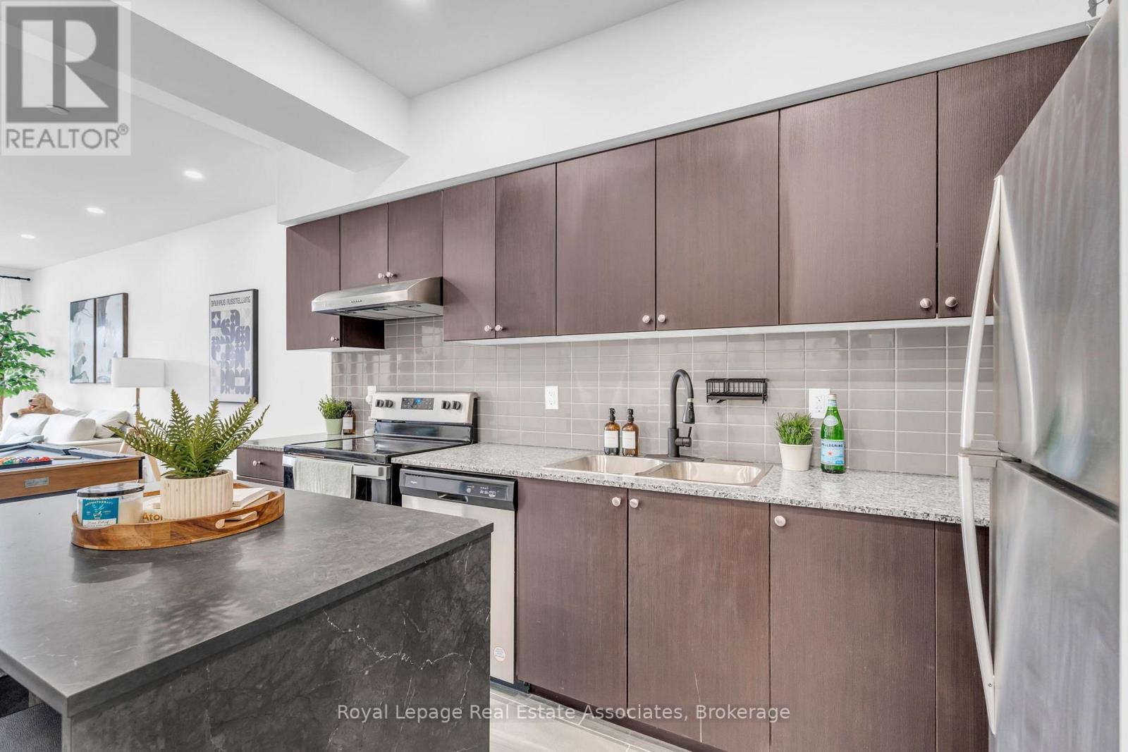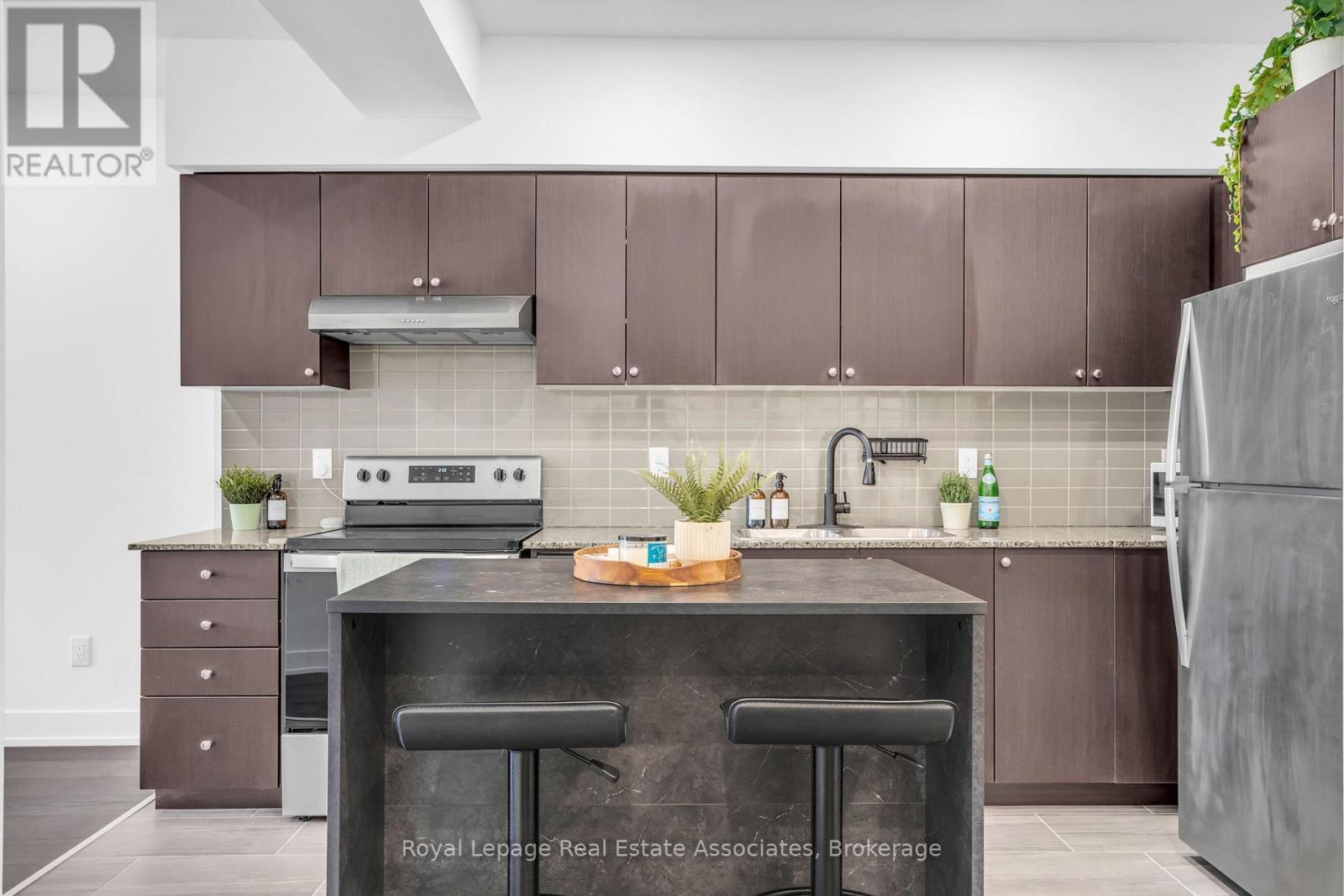 Set just moments from the heart of downtown Orangeville, this one bedroom plus den residence offers a thoughtfully composed balance of modern living and small-town ease. Positioned along Broadway Street and within easy walking distance to cafés, shops, restaurants, and everyday amenities, the home feels both connected and comfortably removed. Inside, the Madison model reveals a well-considered layout where light and proportion guide the experience from room to room. Large windows draw natural light deep into the living space, creating an atmosphere that feels open yet grounded. The flow is effortless, with a dedicated den offering flexibility for a home office, reading nook, or guest space, quietly set apart.The kitchen is clean-lined and contemporary, anchored by elegant porcelain tile flooring and a refined porcelain tile backsplash that bring both durability and understated sophistication. Designed for both function and calm, the space opens naturally to the living and dining areas, ideal for everyday living or effortless entertaining. From here, step outside to a rare and generous 220 square foot private walk-out patio-an extension of the living space that encourages morning coffee outdoors, evening unwinding, or simple moments of fresh air rarely found in condominium living.The bedroom is serene and well-proportioned, offering ample storage and a true sense of retreat at the end of the day. The modern four-piece bathroom is finished with porcelain tile flooring, echoing the home's cohesive design language. In-suite laundry and individually controlled heating and air conditioning in each room ensure comfort is both seamless and precisely tailored.Completing the offering are a private parking space, storage locker, and convenient visitor parking-details that quietly enhance daily life. This residence is ideal for first time homebuyers, downsizers or those seeking a refined, low-maintenance lifestyle just steps from the charm and vitality of downtown Orangeville. (id:64974)