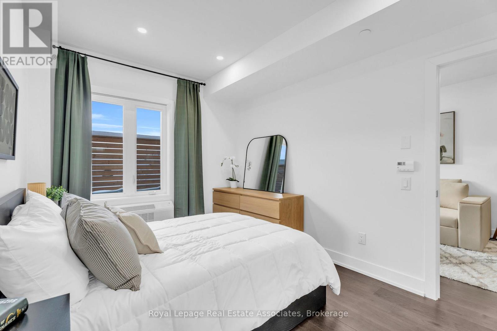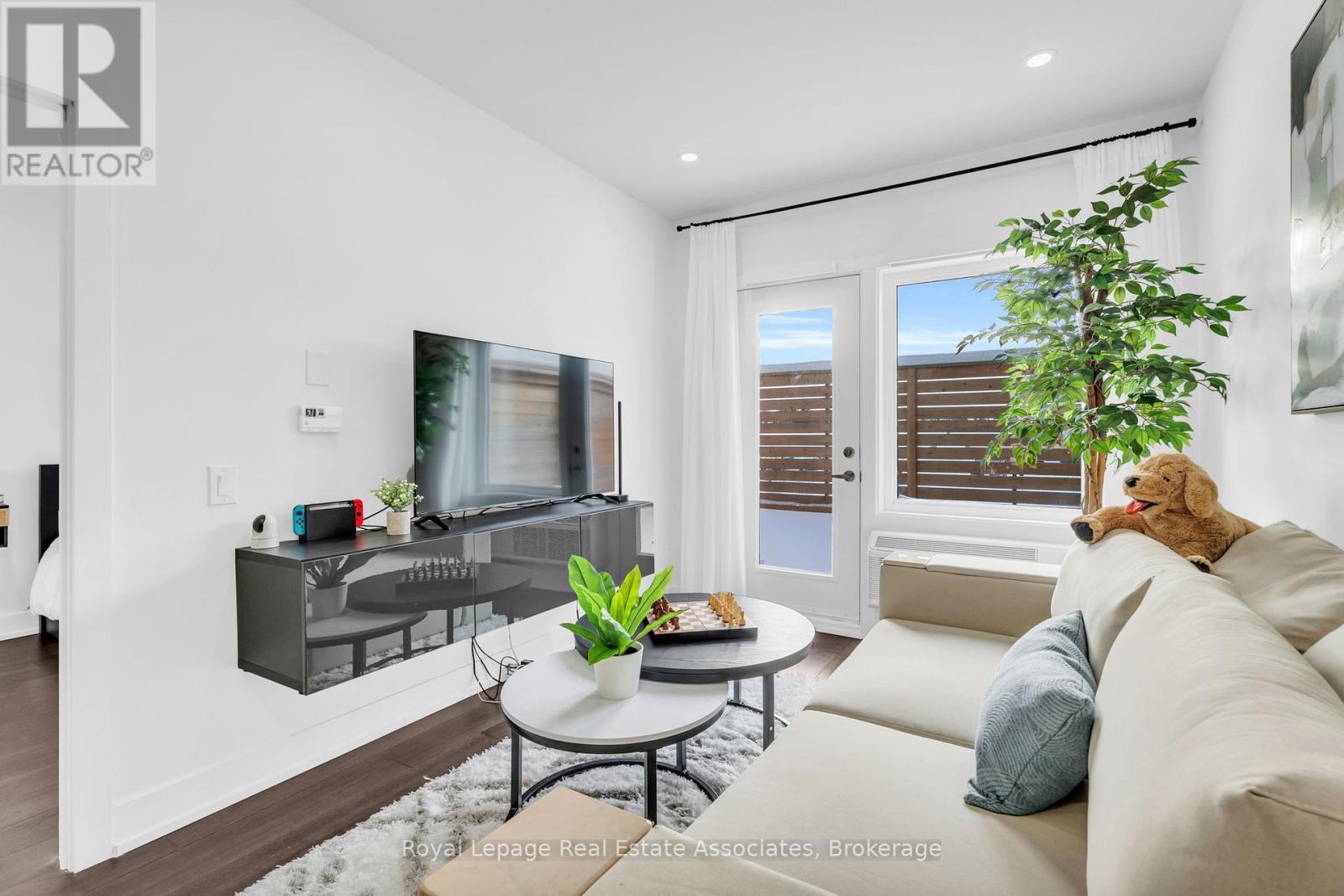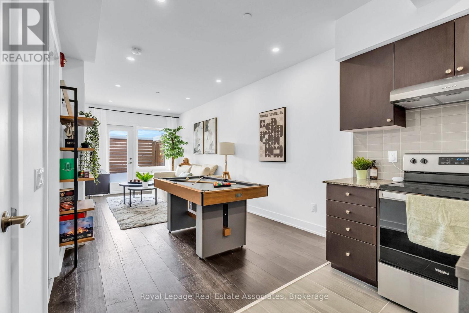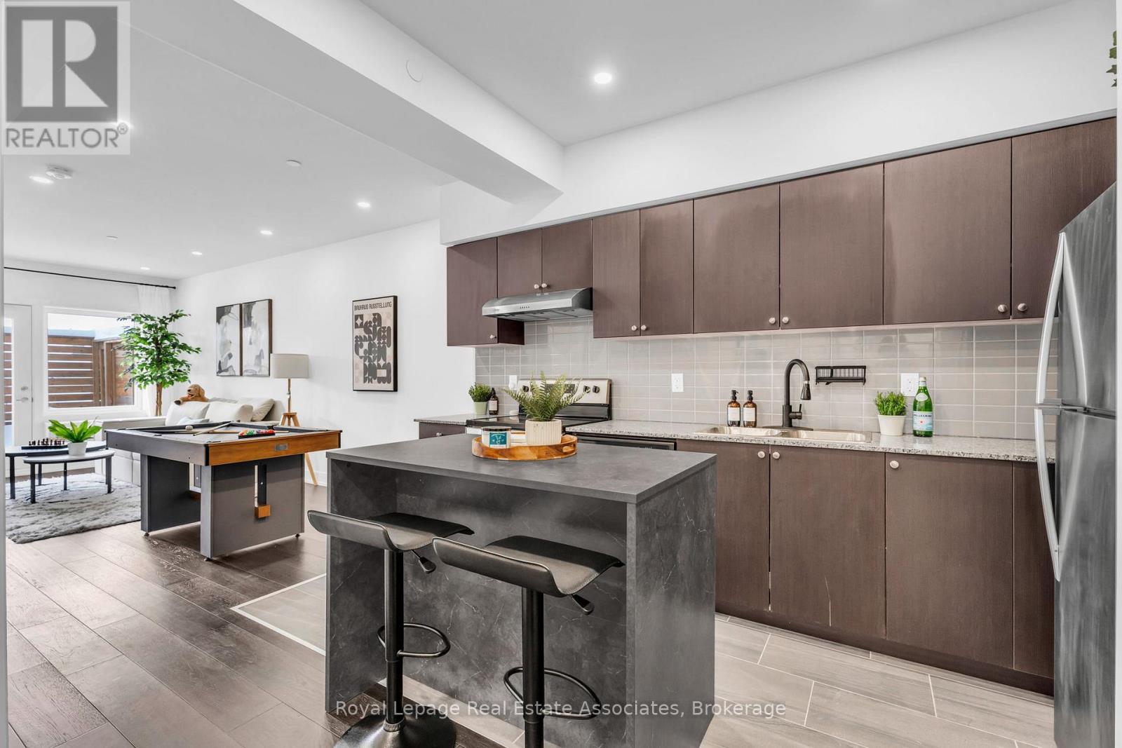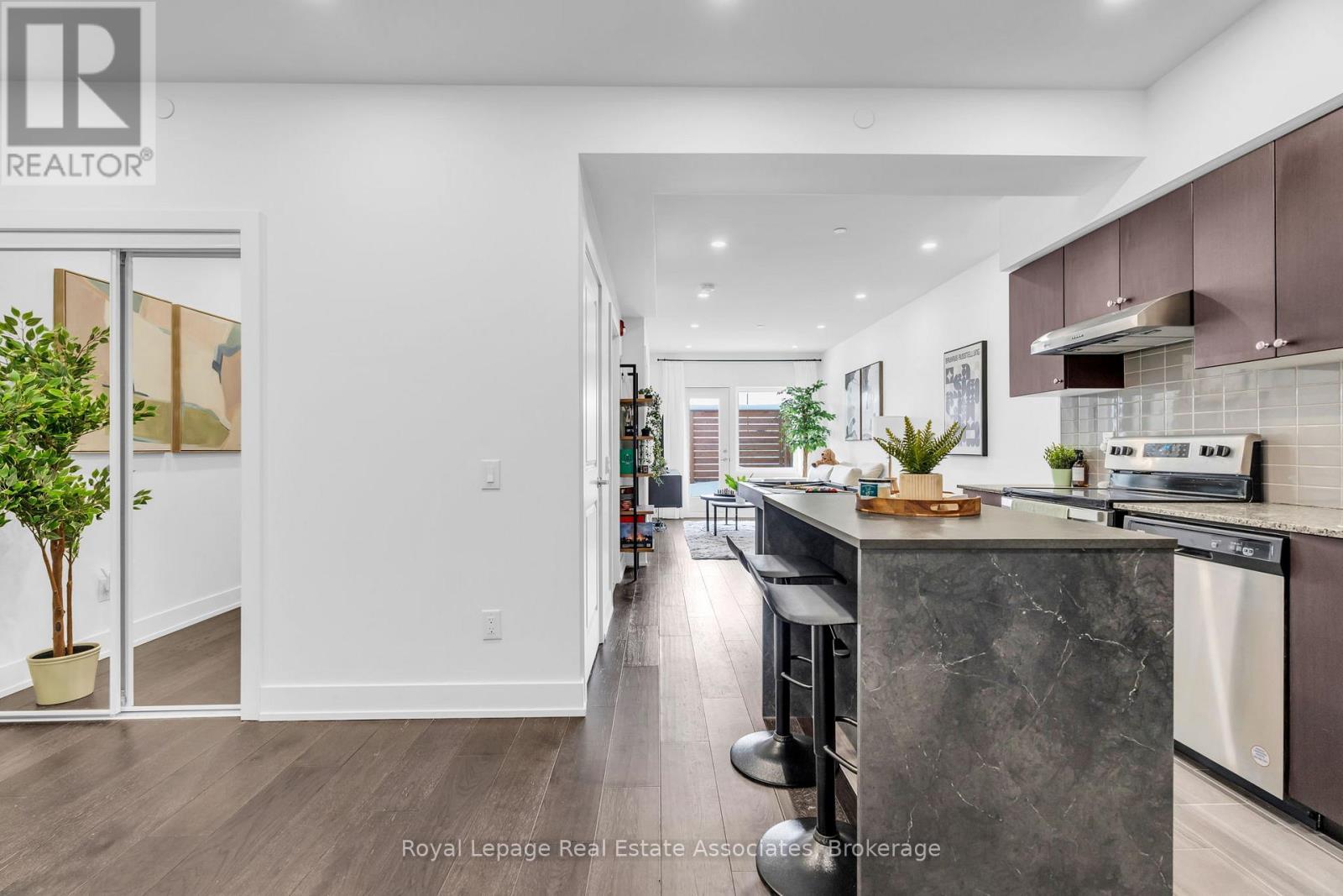 Set just moments from the heart of downtown Orangeville, this one bedroom plus den residence offers a thoughtfully composed balance of modern living and small-town ease. Positioned along Broadway Street and within easy walking distance to cafés, shops, restaurants, and everyday amenities, the home feels both connected and comfortably removed. Inside, the Madison model reveals a well-considered layout where light and proportion guide the experience from room to room. Large windows draw natural light deep into the living space, creating an atmosphere that feels open yet grounded. The flow is effortless, with a dedicated den offering flexibility for a home office, reading nook, or guest space, quietly set apart.The kitchen is clean-lined and contemporary, anchored by elegant porcelain tile flooring and a refined porcelain tile backsplash that bring both durability and understated sophistication. Designed for both function and calm, the space opens naturally to the living and dining areas, ideal for everyday living or effortless entertaining. From here, step outside to a rare and generous 220 square foot private walk-out patio-an extension of the living space that encourages morning coffee outdoors, evening unwinding, or simple moments of fresh air rarely found in condominium living.The bedroom is serene and well-proportioned, offering ample storage and a true sense of retreat at the end of the day. The modern four-piece bathroom is finished with porcelain tile flooring, echoing the home's cohesive design language. In-suite laundry and individually controlled heating and air conditioning in each room ensure comfort is both seamless and precisely tailored.Completing the offering are a private parking space, storage locker, and convenient visitor parking-details that quietly enhance daily life. This residence is ideal for first time homebuyers, downsizers or those seeking a refined, low-maintenance lifestyle just steps from the charm and vitality of downtown Orangeville. (id:64974)