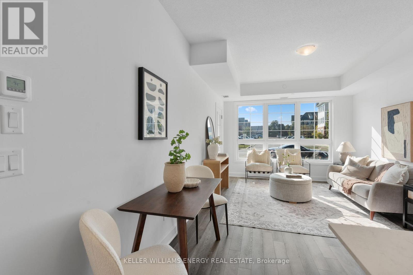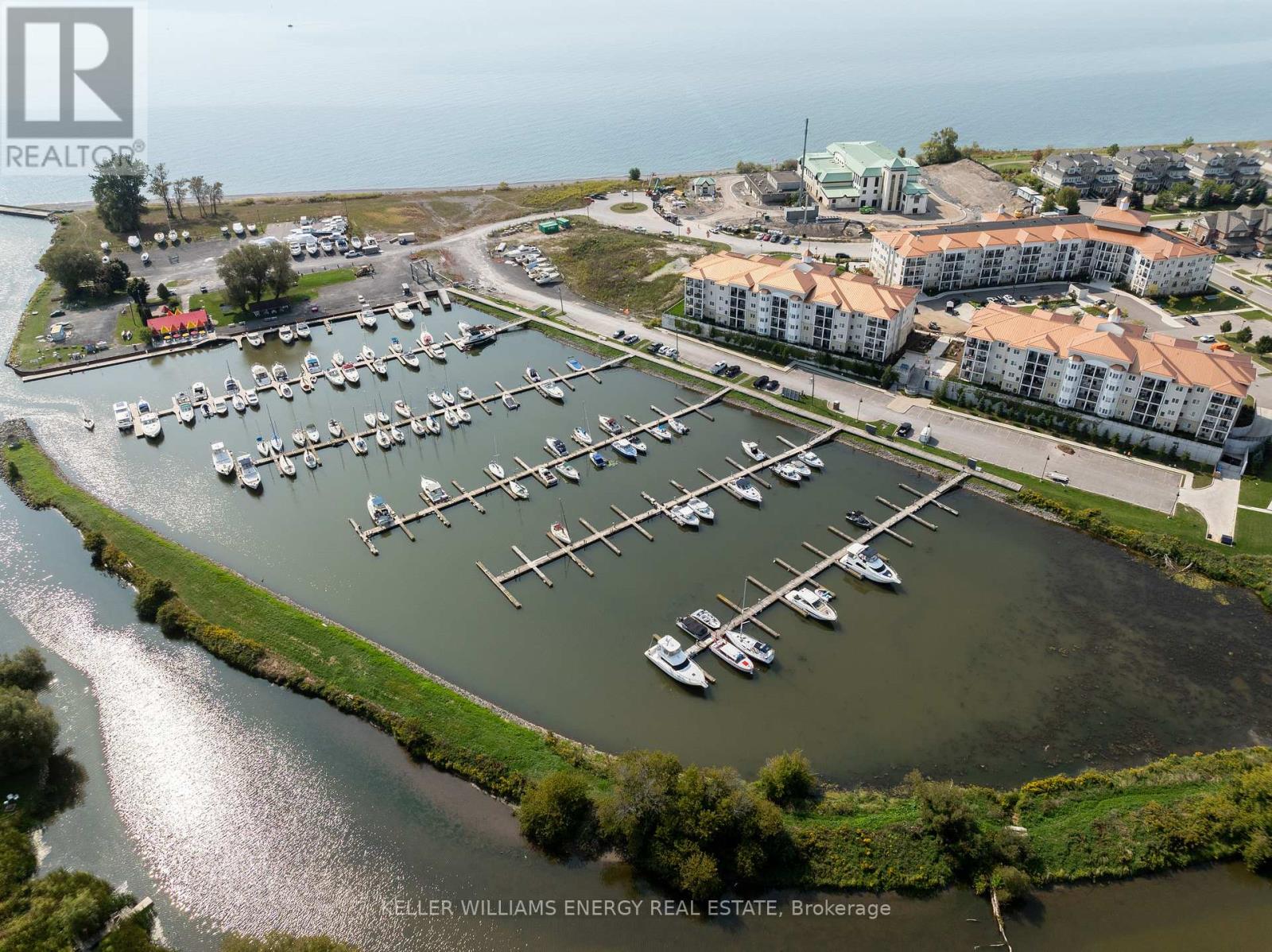 Welcome to this beautifully appointed main-floor 2-bedroom, 2-bathroom condo, ideally situated just steps from the shoreline and conveniently close to the elevators. Enjoy breathtaking views of Lake Ontario from your private terrace-an ideal spot to enjoy morning coffee or relax while taking in stunning sunset views. Inside, the spacious open-concept layout is enhanced by modern finishes throughout. The gourmet kitchen features quartz countertops, ample cabinetry, and a convenient breakfast bar, perfect for everyday living and entertaining. The bright living and dining area seamlessly extends to the terrace, filling the space with natural light. The primary bedroom offers a tranquil retreat, complete with a large closet and a luxurious 4-piece ensuite with contemporary fixtures. A generously sized second bedroom and an additional full bathroom provide flexibility for guests, family, or a home office. Residents enjoy exclusive access to the Admiral Club, offering resort-style amenities including a fully equipped fitness centre, indoor pool, theatre room, library, and party room. Additional highlights include in-suite laundry, premium flooring, and easy access to all building amenities. Experience the convenience of main-floor living with no reliance on elevators, all within close proximity to walking trails, parks, shopping, and transit. Don't miss this opportunity to live in one of the area's most sought-after lakeside communities. (id:64974)