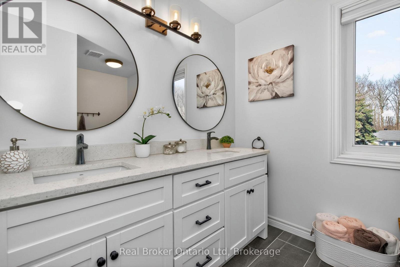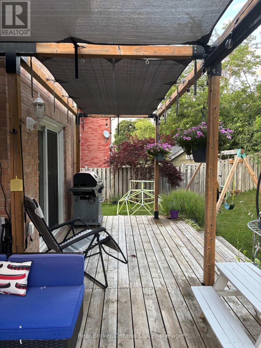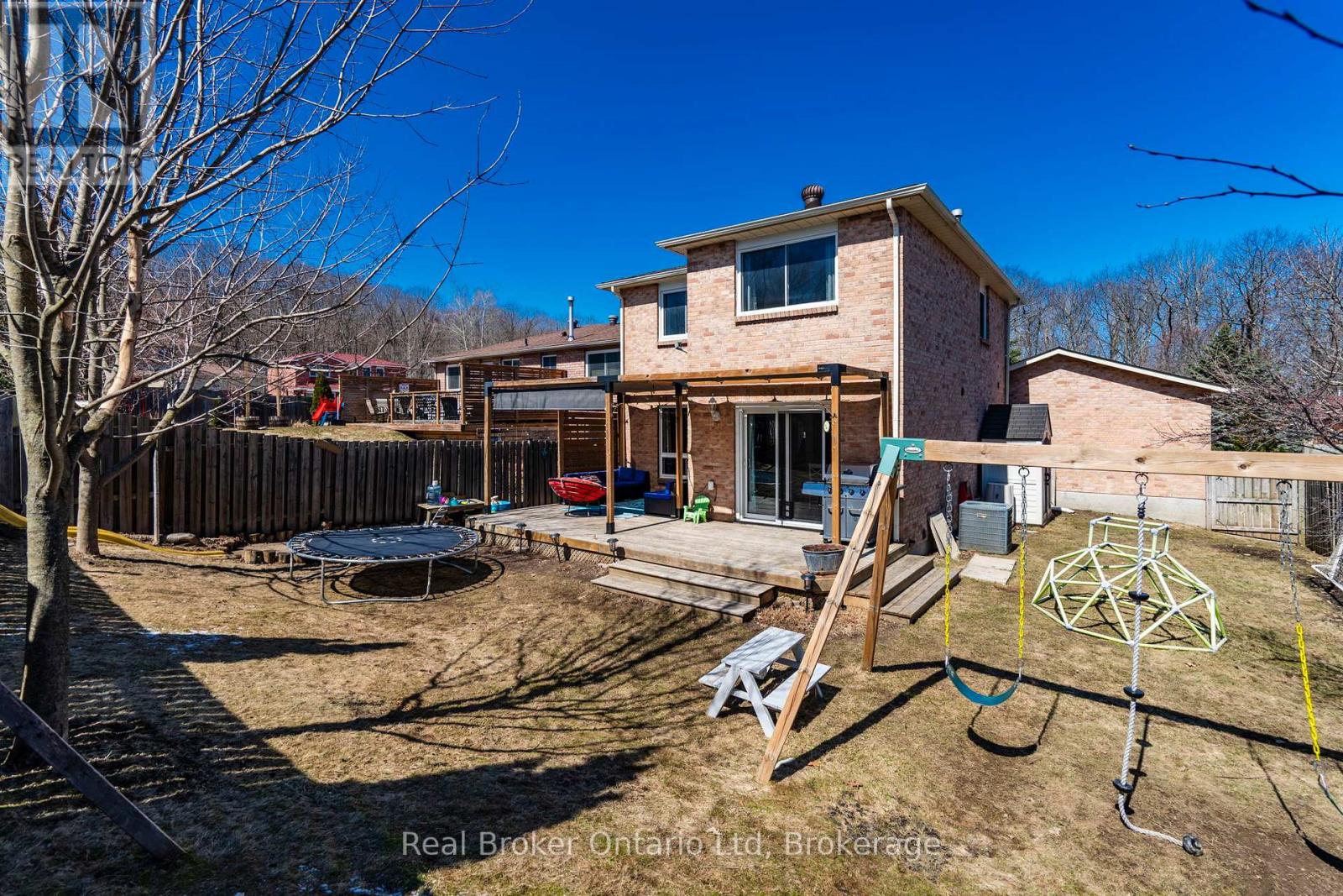 Welcome to this great family home tucked away on a quiet crescent in a prime, convenient location. Just a short walk to Monsignor Castex Catholic School, Bayview Public School, and Georgian Bay District Secondary, and close to Hwy 93, the hospital, and shopping - everything you need is within easy reach. This attractive all-brick two-storey home offers wonderful curb appeal and an inviting covered front entry. Inside, you'll find three spacious bedrooms, including a primary bedroom with a 2-piece ensuite, plus a convenient powder room off the main entry. The stunning 5-piece main bathroom was fully renovated in March, adding modern comfort and style. The kitchen has been thoughtfully updated to improve functionality by bumping out the peninsula, adding a dishwasher, new counters with breakfast bar, backsplash, and a modern paint color for the cabinetry. Flooring on main floor has also been previously updated and brand new carpet on the staircase and throughout the upper level adds a fresh, move-in-ready feel. Enjoy outdoor living on the back deck with the attractive and practical TOJA GRID custom shade system, providing relief from the summer sun and helping keep the main floor cool. Mature deciduous trees enhance privacy during warmer months. Additional highlights include replaced main floor windows and sliding glass door (approx. 3 years ago) and upgraded insulation, newer casement window in the staircase and updated primary bedroom window, an owned hot water tank with no rental costs, and a full high basement offering excellent potential for additional living space. This property offers comfort, updates, and location - everything you could hope for at an affordable price. (id:64974)