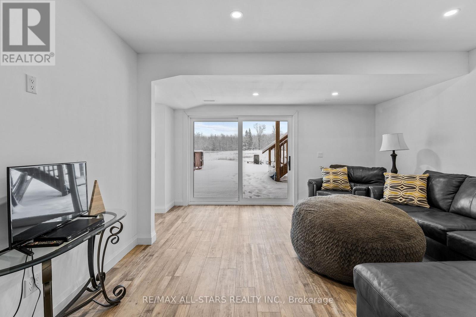 Beautifully built in 2023, this modern bungalow offers stylish living and a detached 1.5-car garage. Step into the welcoming front foyer, where heated tile floors extend seamlessly into the kitchen for added comfort and luxury. The bright living room features a cozy propane fireplace, creating a warm and inviting space to relax. The open-concept kitchen and dining area are perfect for entertaining, complete with a sleek island, ample counter space. The main floor also includes a convenient laundry room, a 2-piece bath, and a spacious primary bedroom with a walk-in closet and a luxurious 5-piece en-suite featuring a soaker tub. The fully finished walkout basement provides exceptional additional living space, offering a large recreation room, a utility room, two generous bedrooms-each with its own walk-in closet-and a 3-piece bath. Outdoors, enjoy a large deck overlooking the above-ground pool, built-in BBQ, fire pit, and a charming chicken coop. Located close to ATV trails, this property is ideal for outdoor enthusiasts seeking both comfort and adventure. (id:64974)