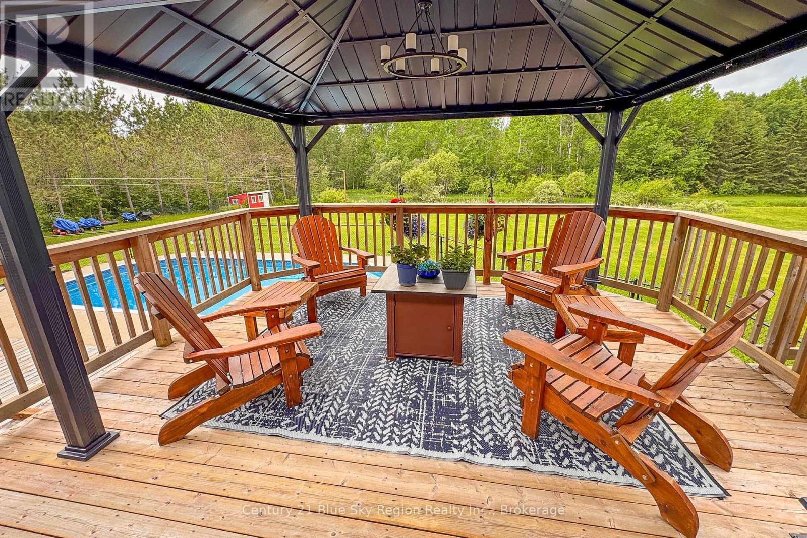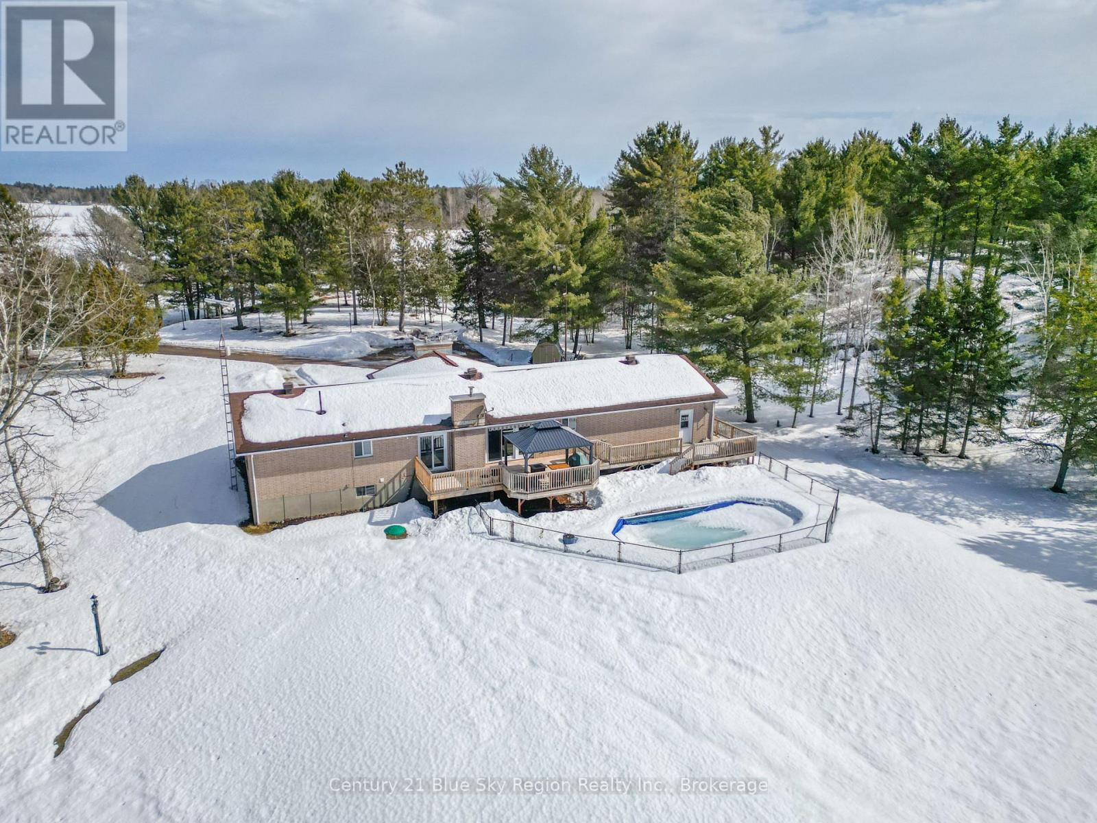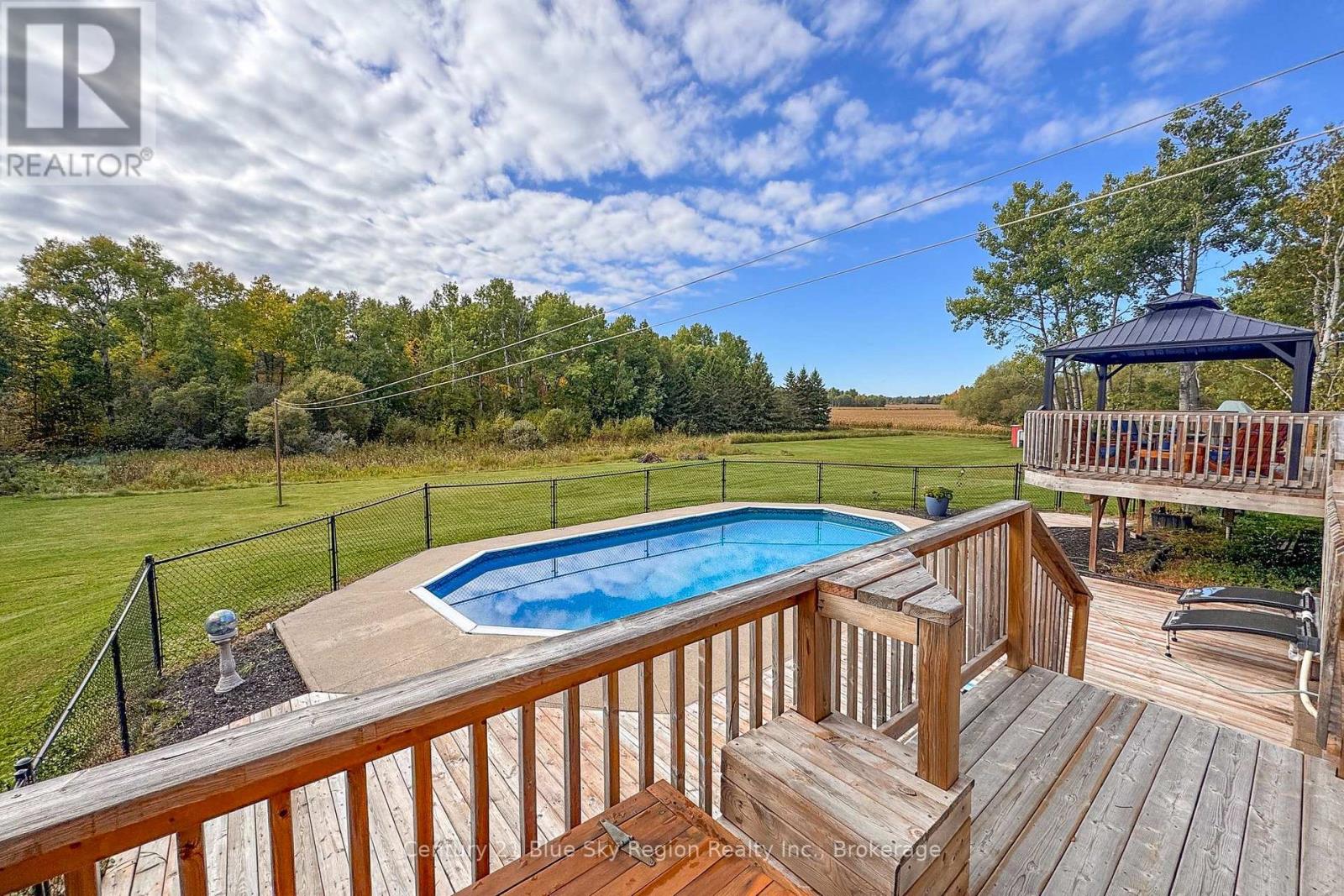 Escape to your own private 5.6-acre country retreat on the peaceful outskirts of Lavigne. This charming all-brick ranch-style bungalow offers the perfect blend of comfort, space, and natural beauty. Step into a bright and welcoming living room featuring vaulted ceilings and large windows that flood the home with natural light. The main level has been tastefully refreshed with new flooring, fresh paint, and updated bathrooms, giving the home a clean, modern feel. The open-concept kitchen and dining area create an ideal space for family living and entertaining, with garden doors leading to a spacious deck and gazebo - perfect for outdoor dining, relaxing, or enjoying the tranquil surroundings. The main floor features three comfortable bedrooms, including a generous primary suite complete with a private 3-piece ensuite. The full, partially finished basement adds valuable living space, offering a large recreation room with a cozy wood fireplace, a private office, and an expansive utility/workshop area with walkout access to the attached insulated double garage. Outside, enjoy summer days in the beautiful in-ground pool, surrounded by mature forest and open pastures. This exceptional property provides privacy, space, and the serenity of country living while still being close to local amenities. A true country oasis with room to relax, entertain, and enjoy nature. (id:64974)