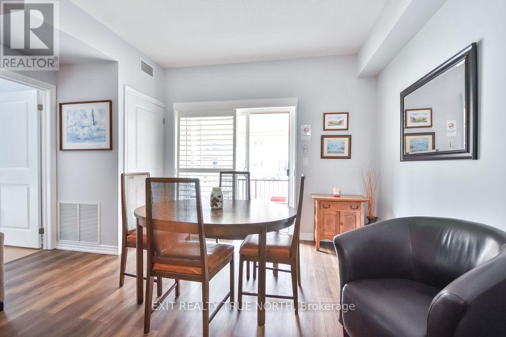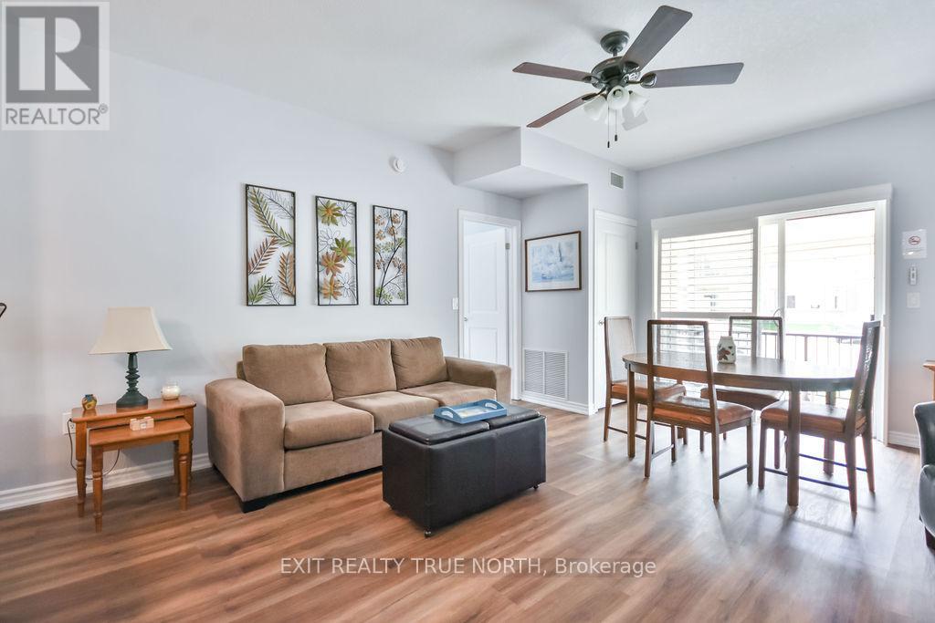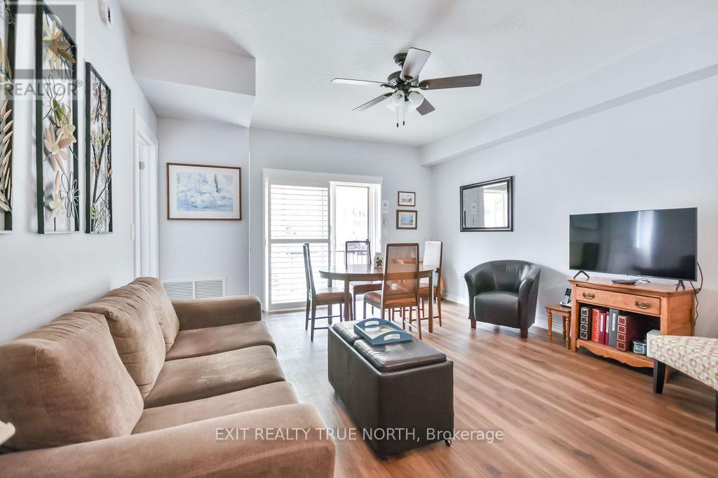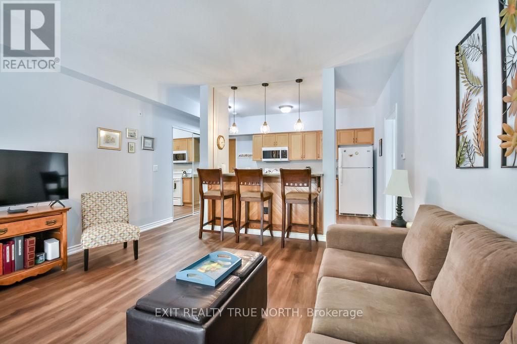 This bright and stylish one-bedroom unit combines comfort and convenience in the heart of Elmvale. Located in the well-maintained Maplecrest building, this thoughtfully designed, main floor unit features 9-foot ceilings and an open-concept layout, creating a spacious and airy atmosphere ideal for everyday living. Enjoy the convenience of key fob entry, elevator access, visitor parking, and an owned parking space. Step outside through the sliding glass doors to your own private balconyperfect for relaxing or entertaining. Residents also have access to a party room, adding extra value for gatherings and events. Situated within walking distance to local shops, restaurants, and services, this location offers the perfect blend of small-town charm and accessibility. With just a 10-minute drive to the sandy shores of Wasaga Beach and only 20 minutes to Barrie or Midland, this ideally positioned unit is a smart and stylish choice. (id:64974)