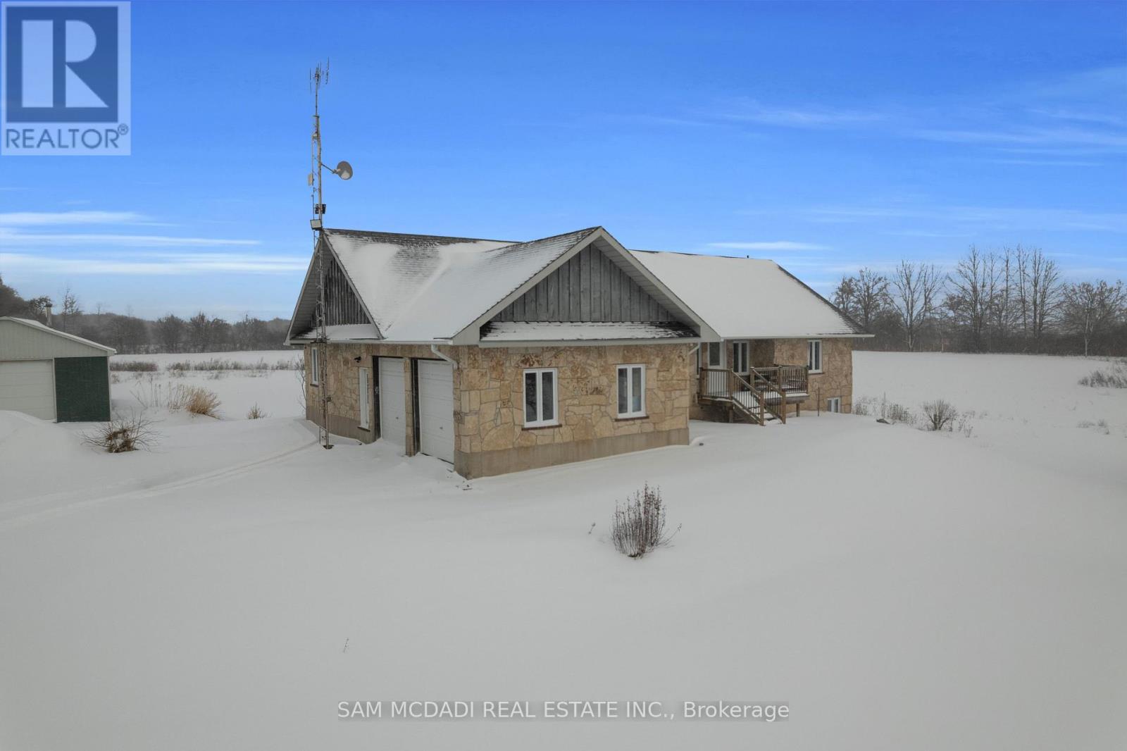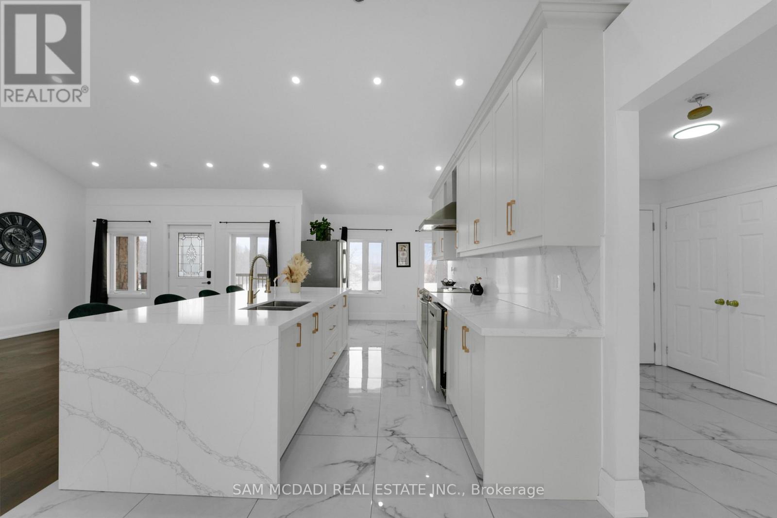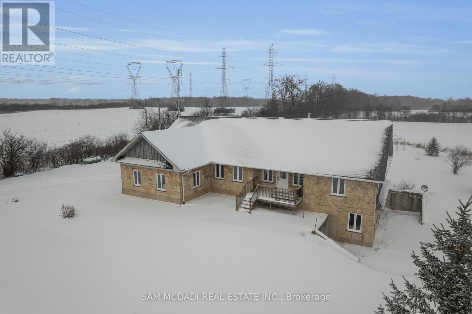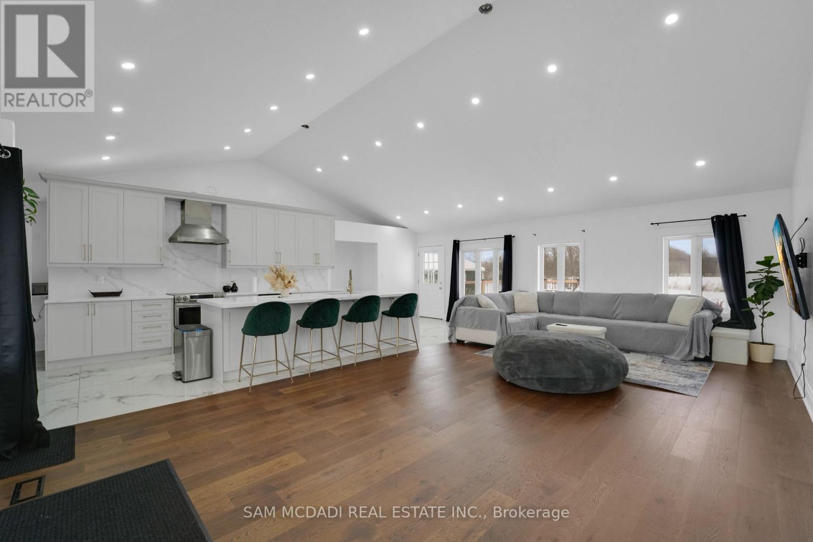 Set on an expansive 41-acre parcel, this beautiful bungalow features 3+1 bedrooms and 3 bathrooms with proven AirBnB income potential. Generating approximately $7,000 per month as a premium short-term rental during peak season, this residence presents a compelling opportunity for investors and lifestyle buyers alike. Upon entry, you'll be met by soaring 15-ft cathedral ceilings, extensive pot lighting, and curated finishes throughout, creating a bright and contemporary interior. The main level features an open-concept layout anchored by a striking chef's kitchen with an oversized island, large-format porcelain tile flooring, quartz countertops, custom cabinetry with refined hardware, and stainless steel appliances. Hardwood flooring defines the adjoining living space, while expansive windows bring in natural light and views of the surrounding countryside. The primary bedroom includes a walk-in closet and private 3-piece ensuite, complemented by two additional bedrooms and a full 5-piece bathroom. The finished lower level adds exceptional versatility with a separate entrance, offering a spacious recreation room, den, additional bedroom, 4-piece bath, and a servery with kitchenette capability, ideal for extended family use or supplementary income. Outside, the stone exterior, covered deck, and elevated setting provide year-round enjoyment, while the surrounding 41 acres offer a mix of open land and natural features, well suited to hobby farming or long-term land holding. The property's location further enhances its appeal, situated just 20 minutes to Hamilton, a short commute to the Grand River, known for kayaking, canoeing, fishing, and scenic trails, and close to local attractions, conservation areas, and charming small-town amenities. Do not miss this rare offering! (id:64974)