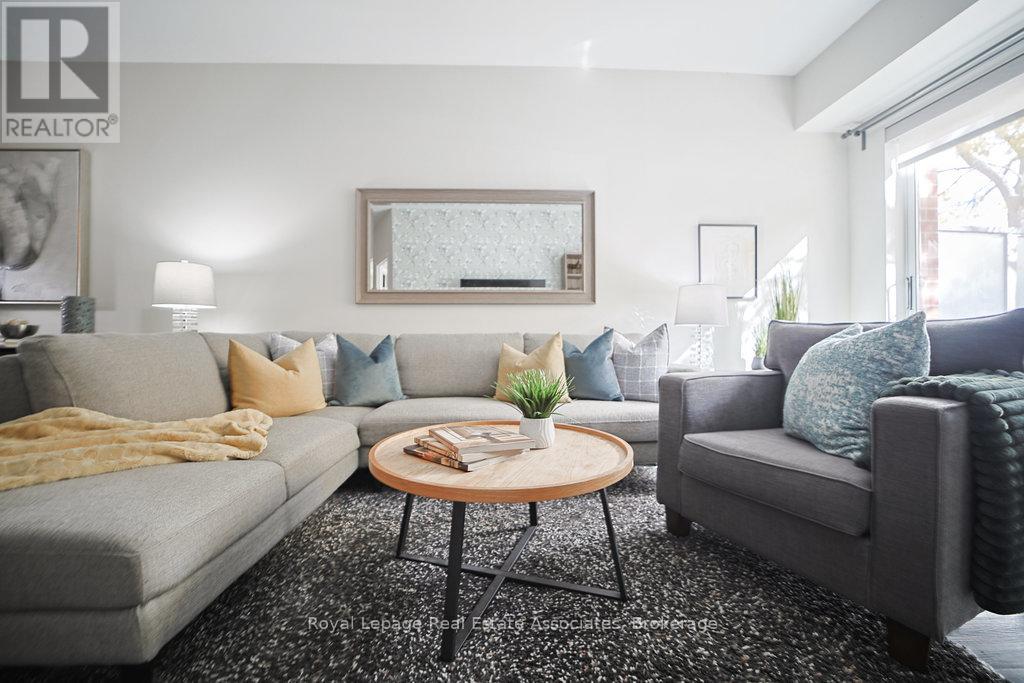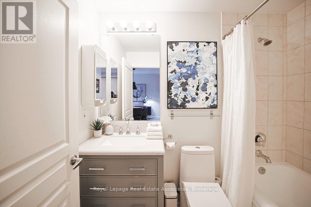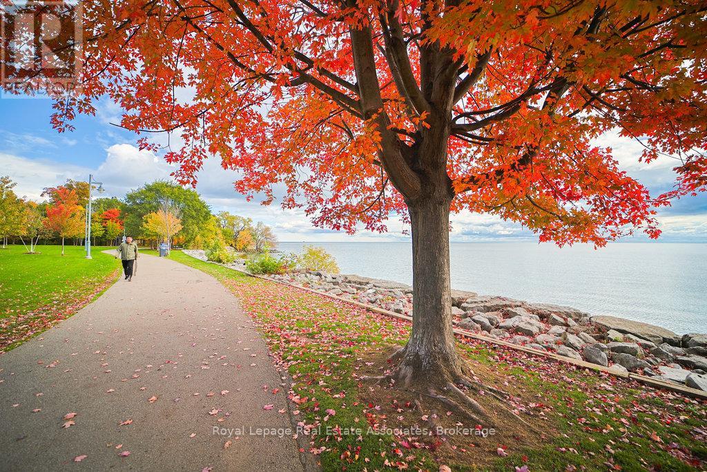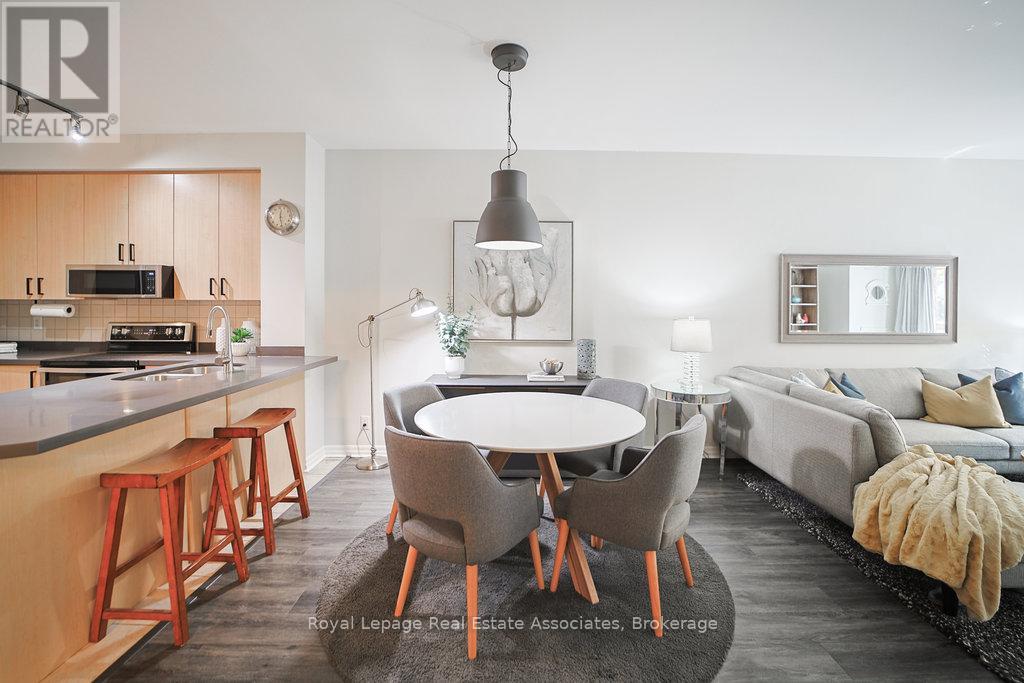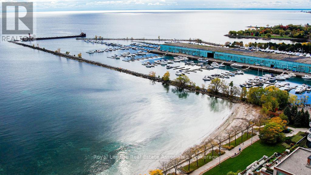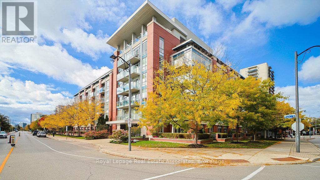 Welcome to effortless main floor living in the heart of Port Credit. This beautifully designed 1 bedroom plus den suite offers 903 sq. ft. of stylish, open concept space and the rare luxury of a true walk out terrace, not a balcony. The walk out terrace is ideal for enjoying morning coffee, gardening, and summer BBQing while creating your own private outdoor retreat.The thoughtfully designed kitchen showcases sleek grey quartz countertops, ample prep space, and a seamless flow into the spacious living and dining area, ideal for entertaining or relaxing at home. The generous primary bedroom features a walk in closet with custom organizers, while the separate den provides versatile space for a home office, guest area, or cozy reading nook.A standout feature is the walk in laundry room, offering exceptional storage and functionality rarely found in condo living. Even the storage locker is conveniently located on the same ground level for easy access.Perfectly positioned just steps to the gym, lobby, and courtyard, this suite also offers added privacy with no neighbours on one side. Skip the elevator and step directly outside to enjoy the fresh lake air.Live just moments from the waterfront, marina, boutique shops, and vibrant restaurants that make Port Credit one of Mississauga's most desirable lakeside communities. (id:64974)