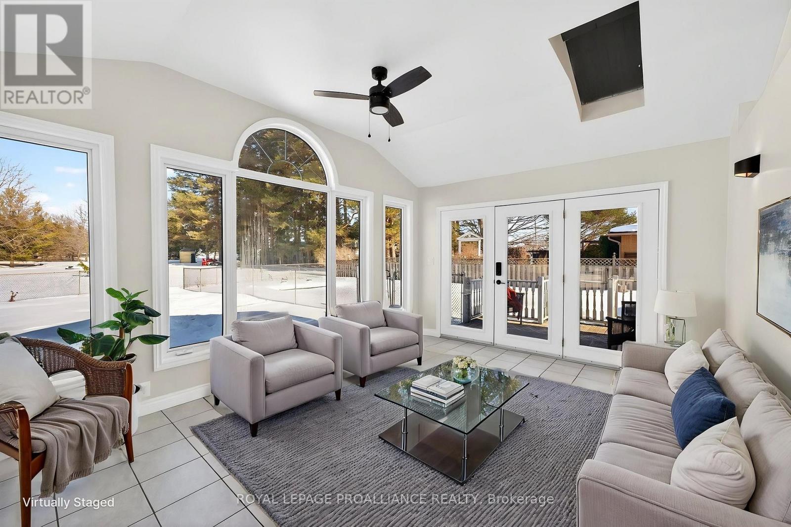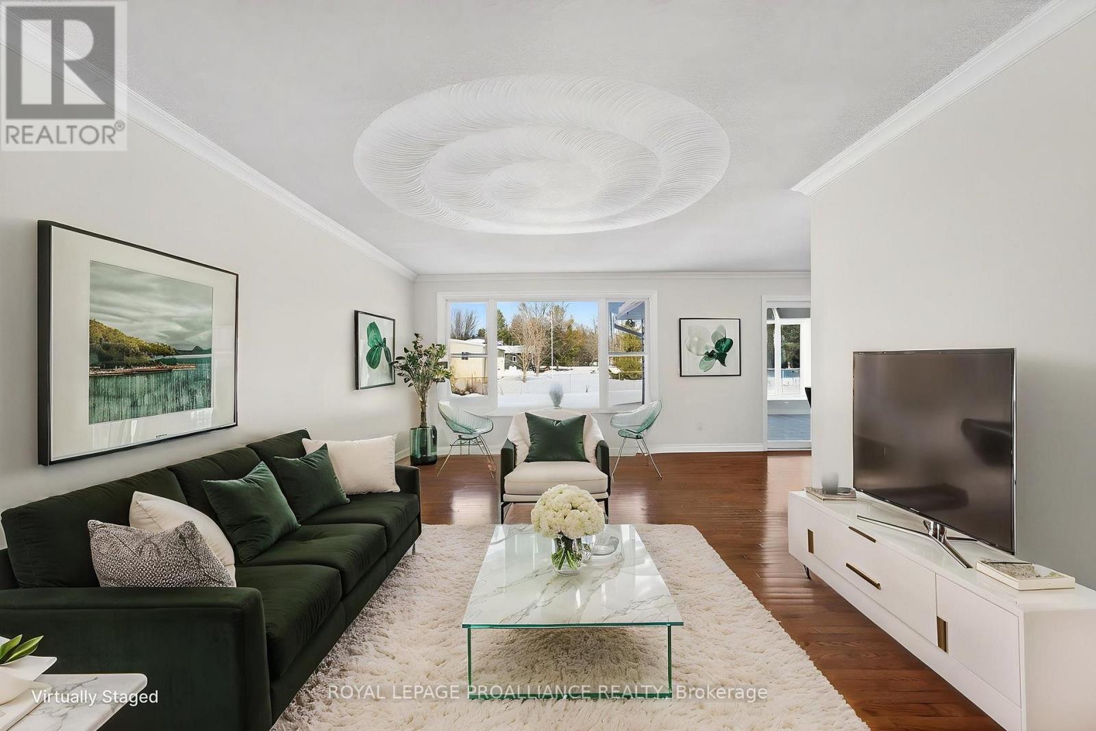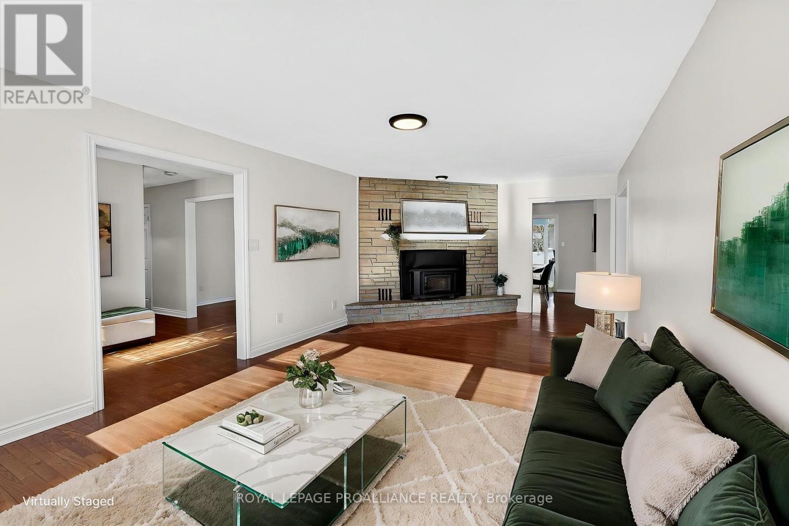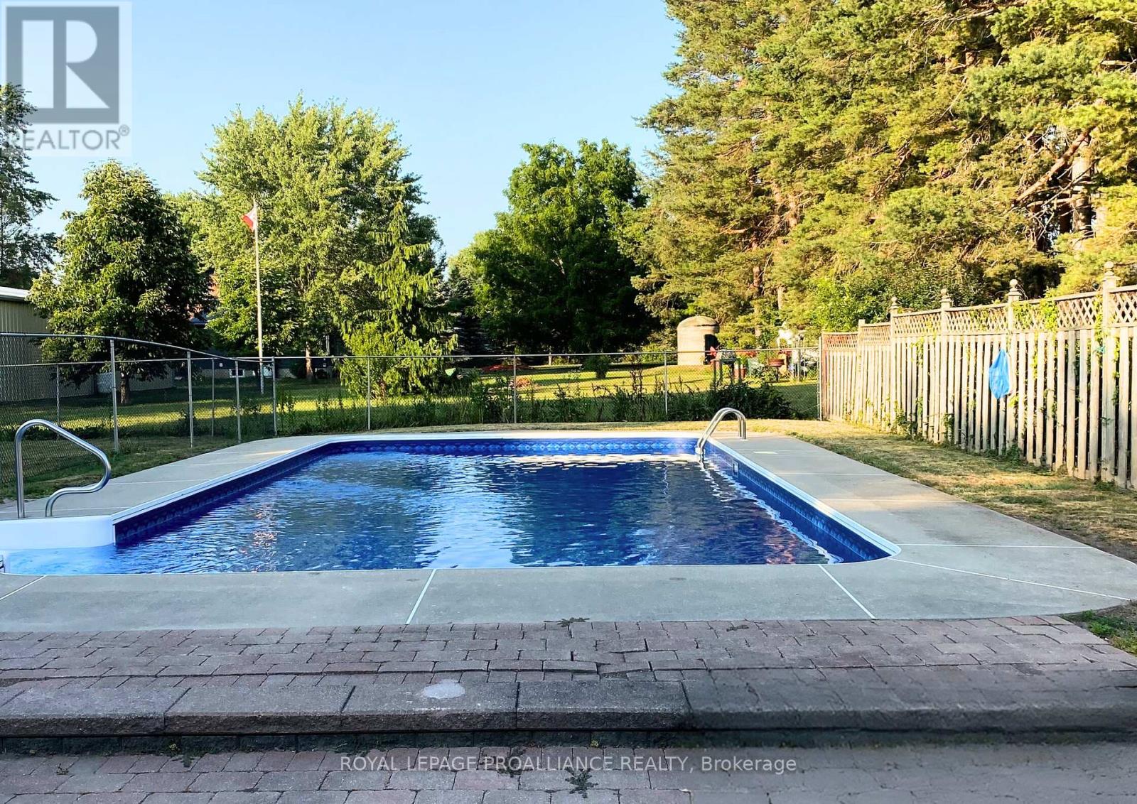 Enjoy the convenience of Belleville living with the quiet of Prince Edward County! This sprawling stone bungalow offers 3 + 2 bedrooms, 4 bathrooms and is located in the mature neighbourhood of Fenwood Gardens, just over the Bay of Quinte bridge. This summer enjoy the quick access to Sandbanks, restaurants & wineries and come home to relax on the patio around the in-ground pool. The private 100 ft wide by 160 ft deep lot is fenced with interlocking patio and an 18 ft x 36 ft in-ground pool with concrete decking, new liner and pump. Offering almost 2000 sq ft of main floor living space, hardwood floors in the living, family and dining rooms, and a stunning 15 ft x 12 ft sunroom that looks over the deck and pool - perfect for entertaining. The large eat-in kitchen just off the separate dining room is conveniently located on one end of the home. It features tons of white cabinetry, newer black stainless steel appliances and leads to the handy main floor laundry room, 2-pcs bathroom with tiled shower and access to the outside patio for easy barbecuing. Offering a functional layout for growing families, you'll find three generous sized bedrooms and a full 4-piece bathroom on the other end of the home. The Primary suite offers a 2-pcs ensuite bathroom and huge double closets. The fully finished lower level provides incredible versatility for larger families and features a new full kitchen, a large recreation room, 2 additional bedrooms, a den/office, a full 4-pcs bathroom, and tons of storage. The lower level also offers a separate entrance. Oversized attached 2-car garage also has a work bench. Enjoy the calm space of a generous, backyard tucked within a quiet, well-established neighbourhood. Easy access to town and just a short drive to The County's popular beaches, wineries, and local attractions, this property offers an opportunity to enjoy both everyday convenience and the lifestyle the area is known for. ( Updated Roof, Furnace, Pool Eqt. & more) See Full List. (id:64974)