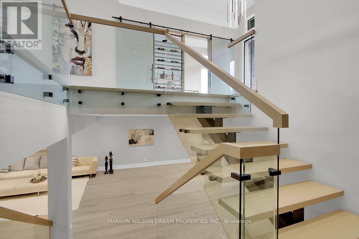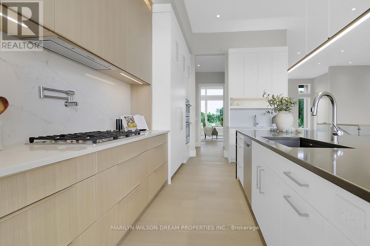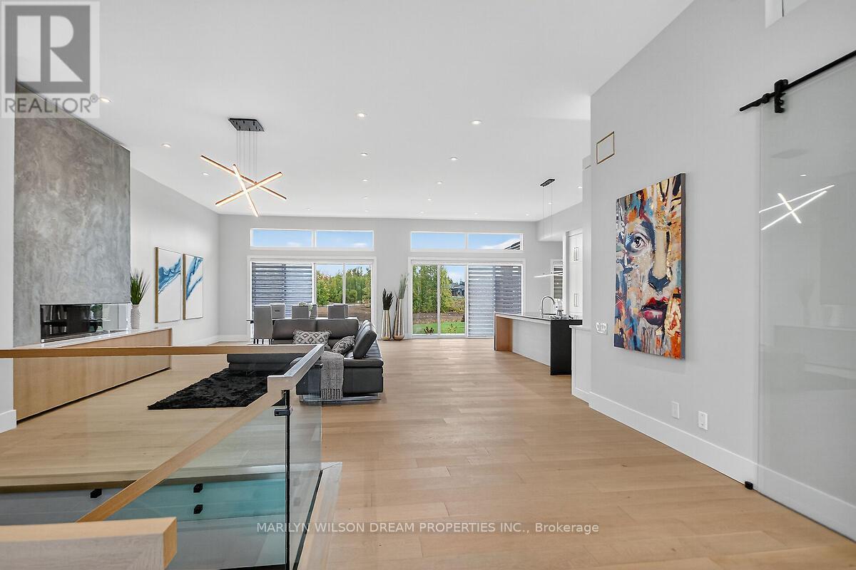 This custom designed bungalow offers both elegance and sophistication. Spectacular lot in estate subdivision with executive homes. Built by Patterson Homes, this residence has never been lived in! Attractive Dominion stone exterior and grand circular driveway. This breathtaking home is graced with magnificent scale, an abundance of natural light, high ceilings and an open floor plan. Whether you want privacy and relaxation or the perfect entertainment venue, this property is it! Step inside and the interior unfolds seamlessly with classic and contemporary design elements, offering a relaxed elegance. Flooring is 7" Vidar white oak hardwood and 30" x 30" porcelain tiles from Italy. This beautifully appointed home features a gourmet kitchen equipped with Fisher Paykel high-end appliances, a large quartz waterfall island, custom Louis L'artisan cabinetry and a butler's pantry. Flowing effortlessly into spacious living areas adorned with custom stone gas fireplace. Triple patio doors opening to the expansive hardwood deck, allowing for effortless indoor-outdoor entertaining. Elegant office with frameless glass sliding doors and custom wine display which can showcase 47 bottles. The primary suite boasts a spacious bedroom with patio doors to deck, a spa-like ensuite with a soaker tub, a walk-in double shower, dual vanities, heated floor and a custom walk-in closet. Two additional bedrooms with shared bath. Oversized mudroom with powder room and dog washing station. Solid maple floating staircase to lower level. High ceilings and in-floor radiant heating throughout. Spectacular 700 sq ft rec room with wet bar, fully sound insulated theatre, versatile bonus space perfect for fitness centre, 4th bedroom, full bath with sauna, powder room, ample storage and direct access from garage. Fully insulated massive 5 car garage features 14' ceilings and fast EV charger. Windows by Marlboro custom windows. Lutron lighting and networking wiring throughout. Tarion warranty include (id:64974)