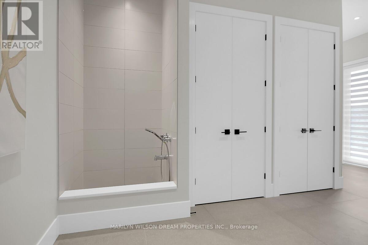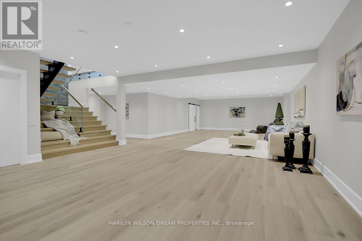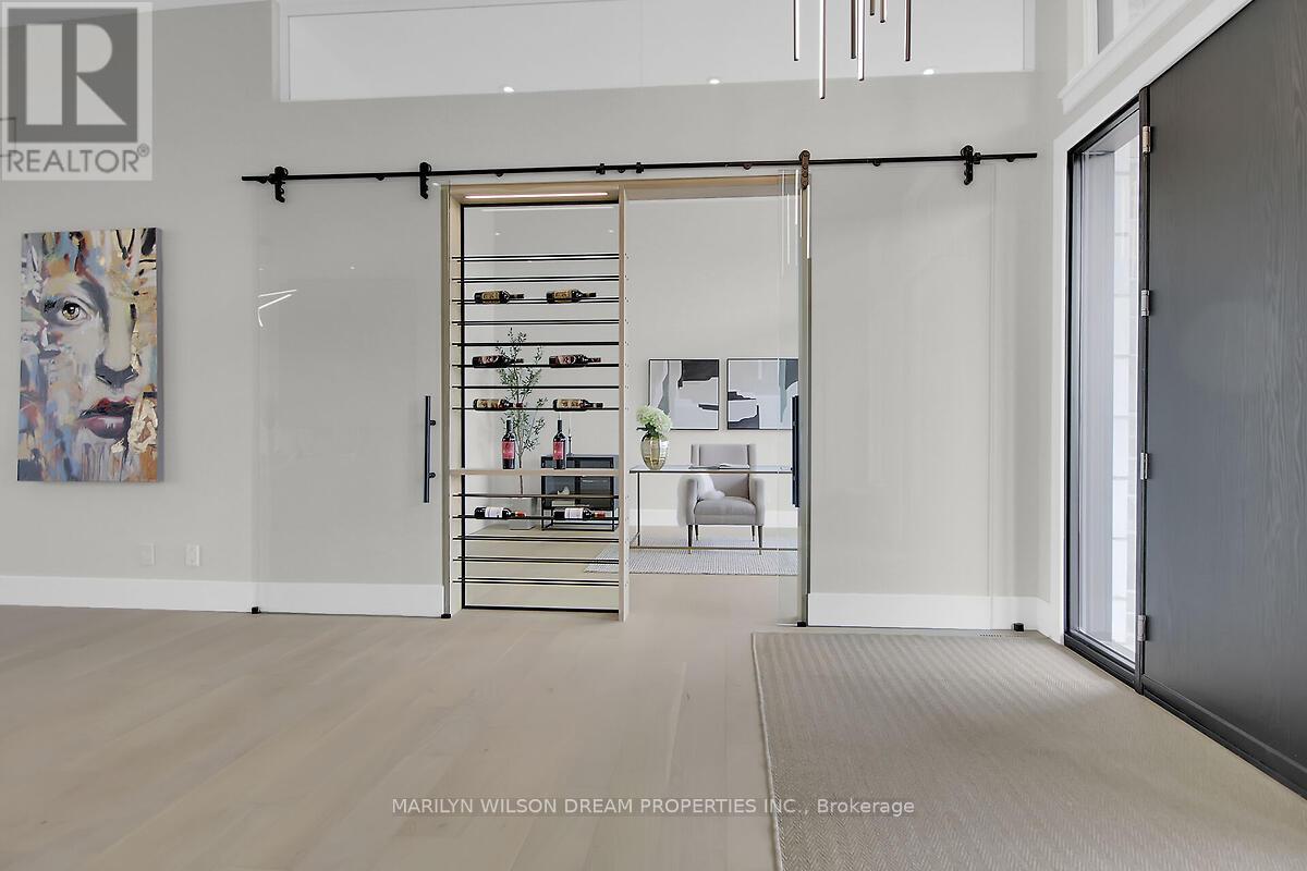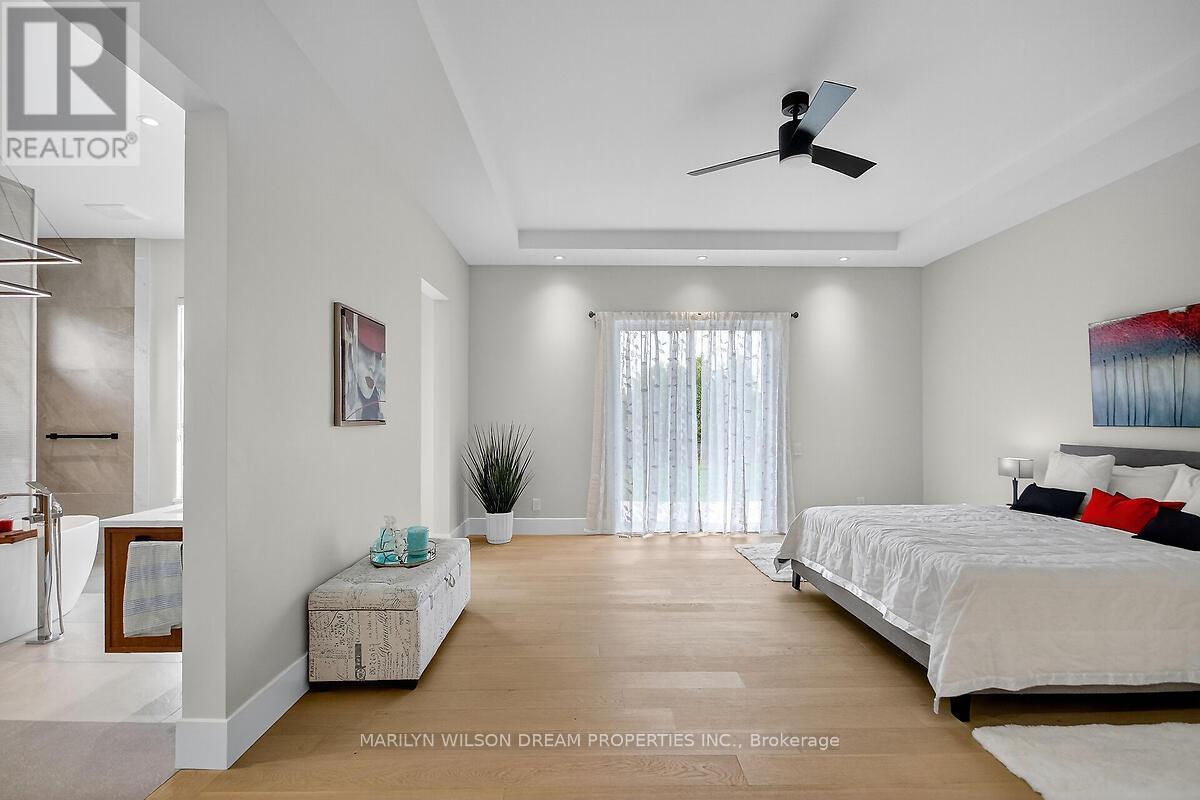 This custom designed bungalow offers both elegance and sophistication. Spectacular lot in estate subdivision with executive homes. Built by Patterson Homes, this residence has never been lived in! Attractive Dominion stone exterior and grand circular driveway. This breathtaking home is graced with magnificent scale, an abundance of natural light, high ceilings and an open floor plan. Whether you want privacy and relaxation or the perfect entertainment venue, this property is it! Step inside and the interior unfolds seamlessly with classic and contemporary design elements, offering a relaxed elegance. Flooring is 7" Vidar white oak hardwood and 30" x 30" porcelain tiles from Italy. This beautifully appointed home features a gourmet kitchen equipped with Fisher Paykel high-end appliances, a large quartz waterfall island, custom Louis L'artisan cabinetry and a butler's pantry. Flowing effortlessly into spacious living areas adorned with custom stone gas fireplace. Triple patio doors opening to the expansive hardwood deck, allowing for effortless indoor-outdoor entertaining. Elegant office with frameless glass sliding doors and custom wine display which can showcase 47 bottles. The primary suite boasts a spacious bedroom with patio doors to deck, a spa-like ensuite with a soaker tub, a walk-in double shower, dual vanities, heated floor and a custom walk-in closet. Two additional bedrooms with shared bath. Oversized mudroom with powder room and dog washing station. Solid maple floating staircase to lower level. High ceilings and in-floor radiant heating throughout. Spectacular 700 sq ft rec room with wet bar, fully sound insulated theatre, versatile bonus space perfect for fitness centre, 4th bedroom, full bath with sauna, powder room, ample storage and direct access from garage. Fully insulated massive 5 car garage features 14' ceilings and fast EV charger. Windows by Marlboro custom windows. Lutron lighting and networking wiring throughout. Tarion warranty include (id:64974)
