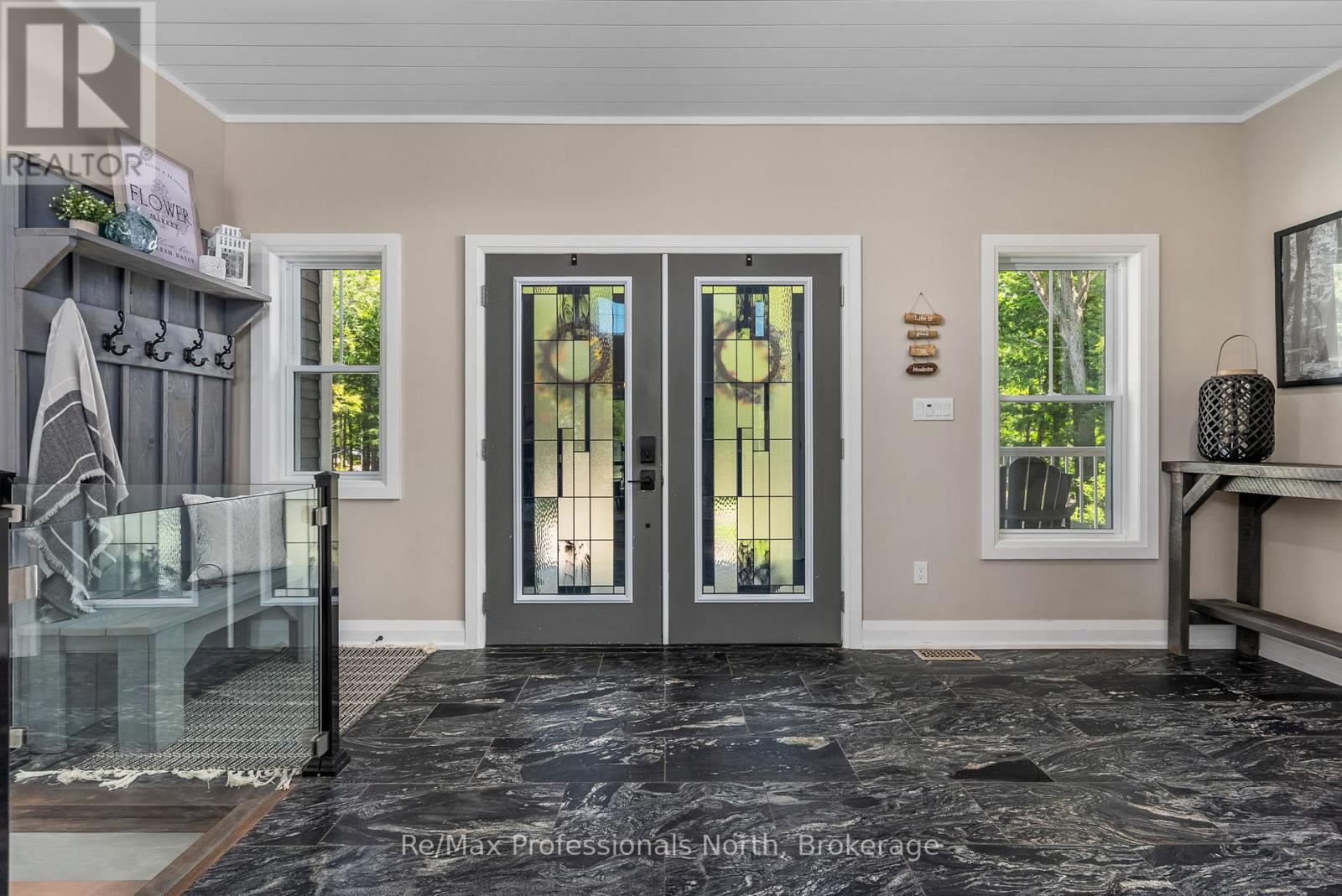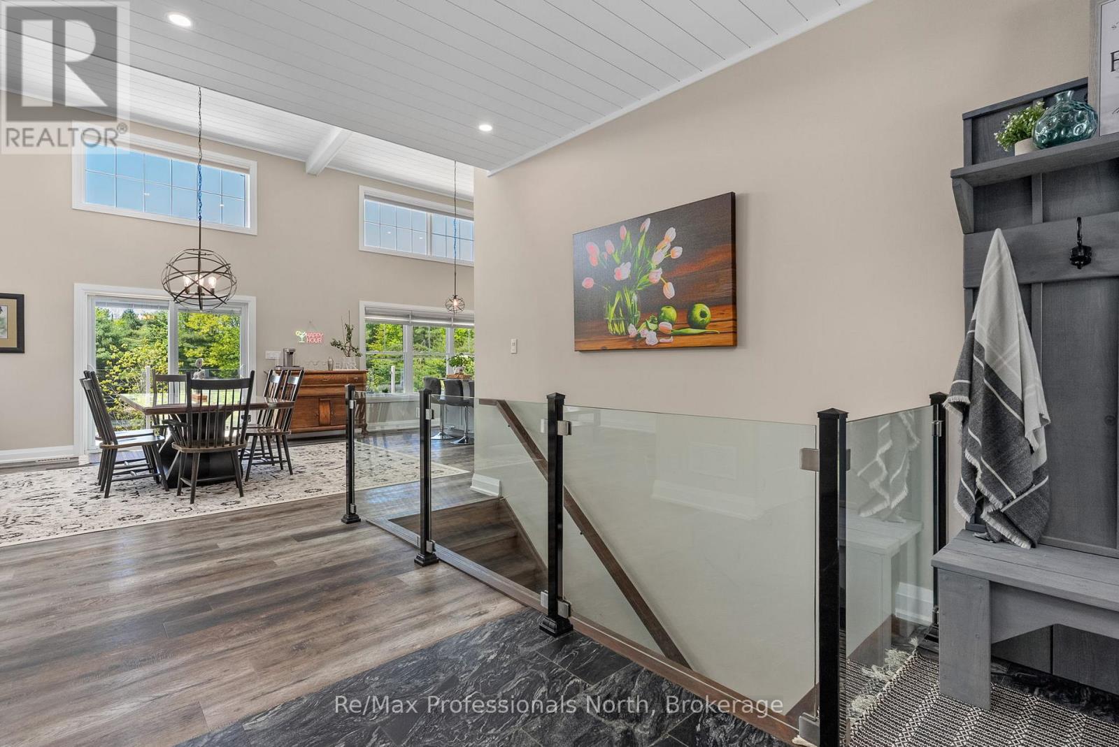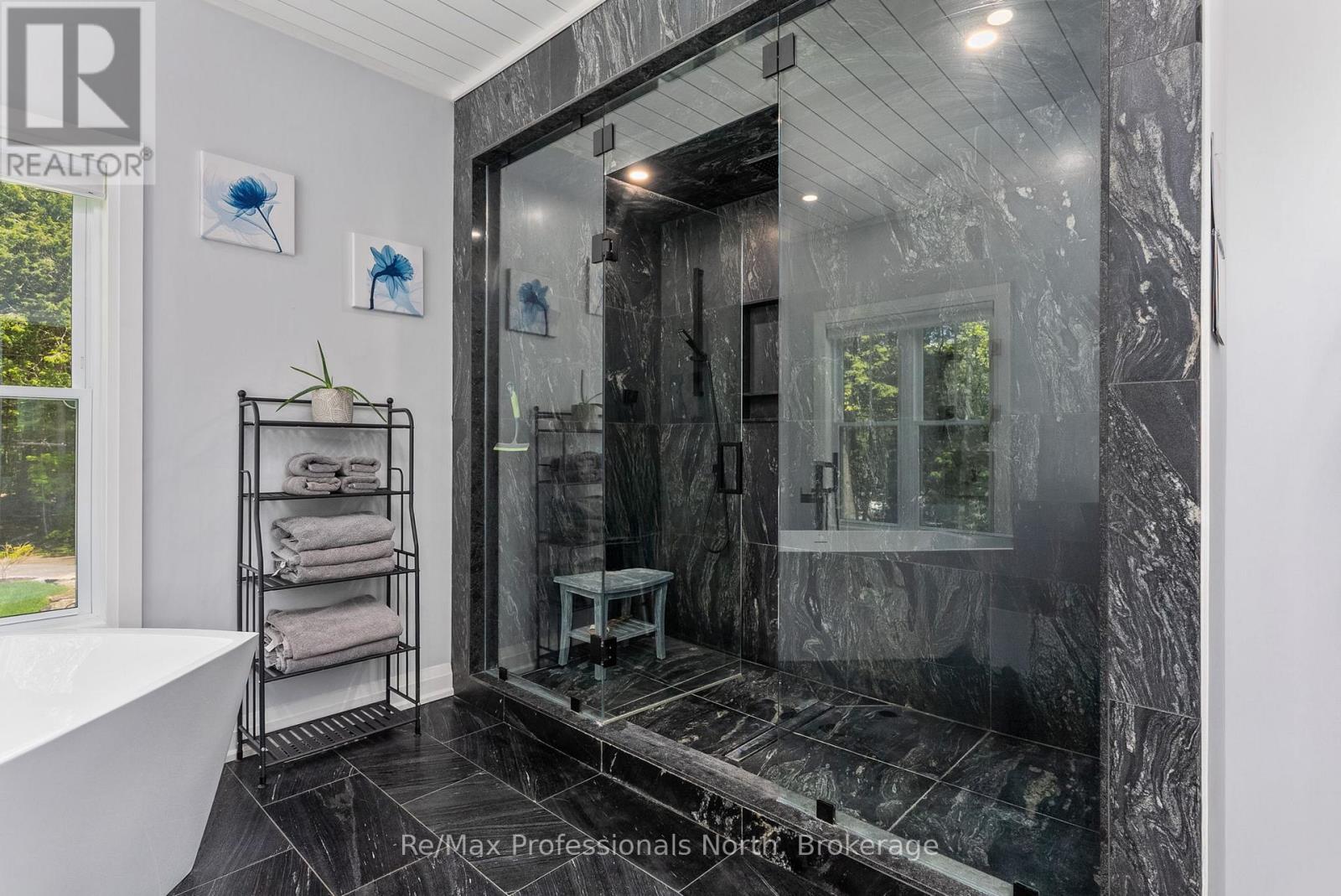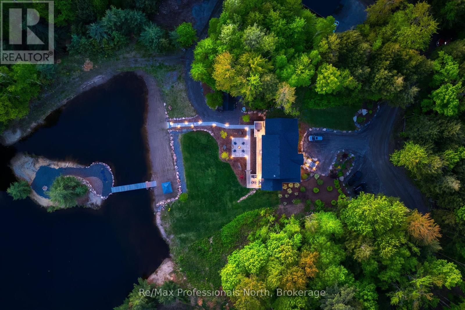 Welcome to 1076 Xavier Street situated in one of Muskoka's most desirable executive enclaves, an exceptional custom-built estate set on 7.17 acres just south of Gravenhurst's downtown. Set back from the road and hidden from view, this 2022-built home offers rare seclusion with a long granite-lined driveway, scenic pond with sandy beach and island, stunning outdoor living, and a 40' x 60' heated shop creating a Muskoka retreat that feels like your own private resort. A dramatic granite staircase leads to a covered front porch and into 3,602 square feet of beautifully finished space across two levels. Vaulted shiplap ceilings, expansive windows, and a striking black propane fireplace framed by floor-to-ceiling white shiplap define the great room. The entertainers kitchen features chiseled-edge granite throughout, including a statement island ideal for hosting. From the dining area, step out to a rear deck that spans the entire back of the home and overlooks your firepit sitting area, a tranquil pond, beach, and landscaped island framed by mature forest. A footbridge invites exploration, where the second firepit and Muskoka chairs offer the perfect vantage point for morning coffees or evening stargazing. The insulated Muskoka room offers passive climate flow from the home, a supplemental electric fireplace, and access to both decks. The private primary suite features direct access to the deck and hot tub, a walk-in closet, and a spa-inspired 5-piece ensuite. The fully finished walkout lower level offers a large rec room, two additional bedrooms, a full bath, and direct access to the backyard. At the rear of the property, a 40' x 60' heated shop includes 12' doors, hydro, and 3 piece bath ideal for the hobbyist, recreational gear, or as a private workspace and storage haven. A Generac backup generator provides year-round peace of mind. This is more than a home; it's an experience offering refined living, captivating scenery, and complete privacy in an exclusive setting. (id:64974)