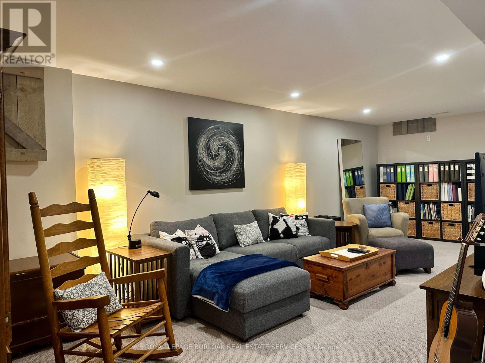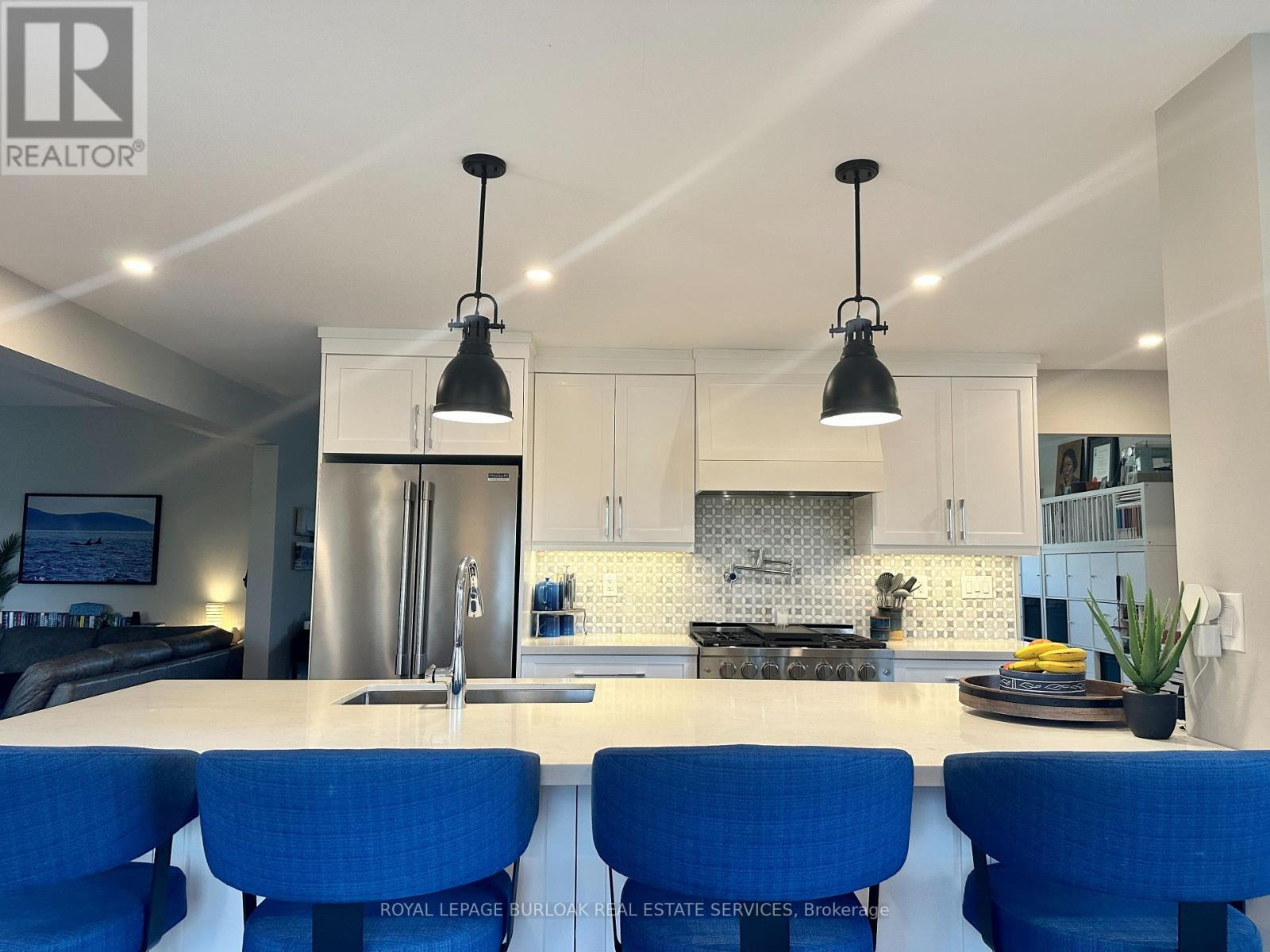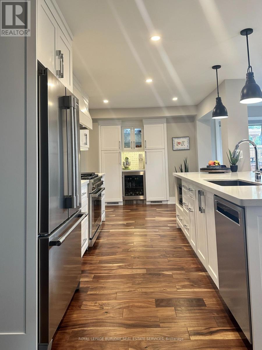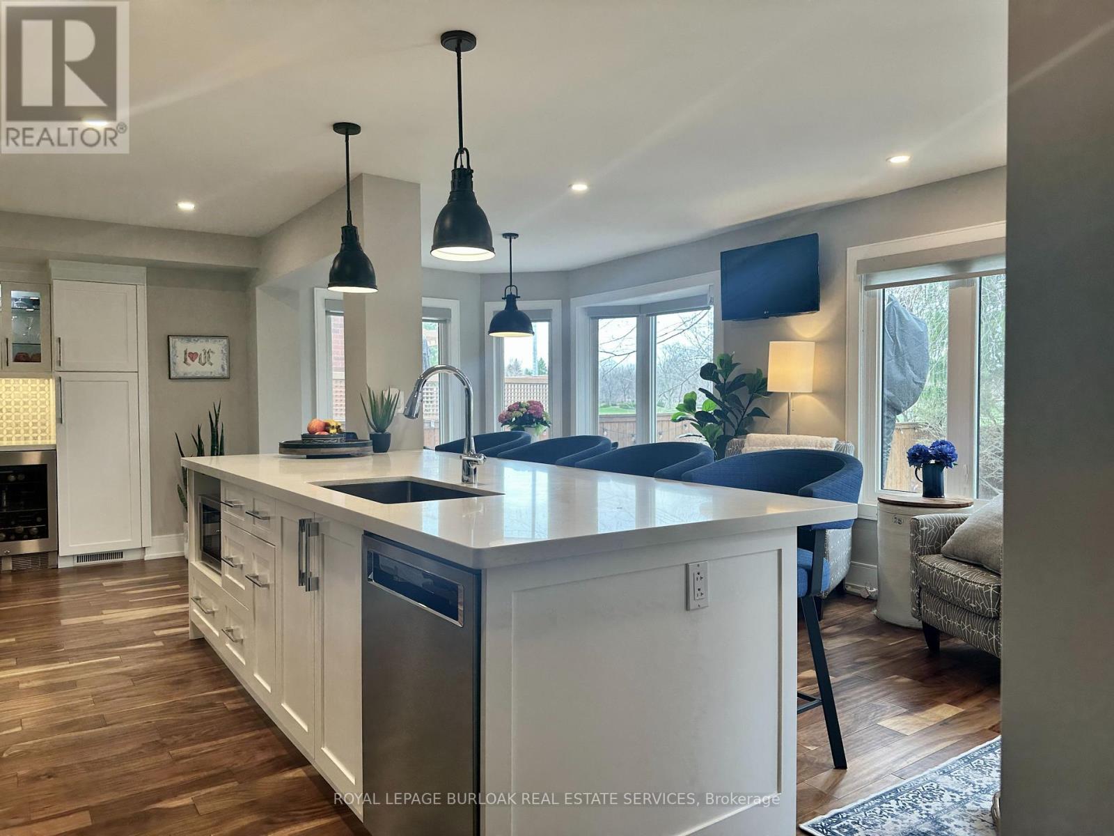 Rarely offered for sale two story detached home in Maple Lane Estates. Walk to downtown, Spencer Smith Park, the Burlington Art Gallery and Mapleview Mall. Convenient access to 403, 407, and QEW. Backing onto Maple Park with a gated fence access, this home is perfect for a growing family. Move in and relax! Fully updated inside and out, the ground floor offers an open concept, modern kitchen with island seating for 4 and wine fridge that is fully open to the family room and perfect for entertaining. Updated flooring throughout the house. The renewed landscaping, front and backyard (2025) with irrigation system allows for more outdoor living space on the spacious back deck. Includes heated floor in primary en suite, central vac, cold cellar for storage, and a fully finished basement with an extra bedroom and a full bathroom.**Seller is related to the listing salesperson. (id:64974)