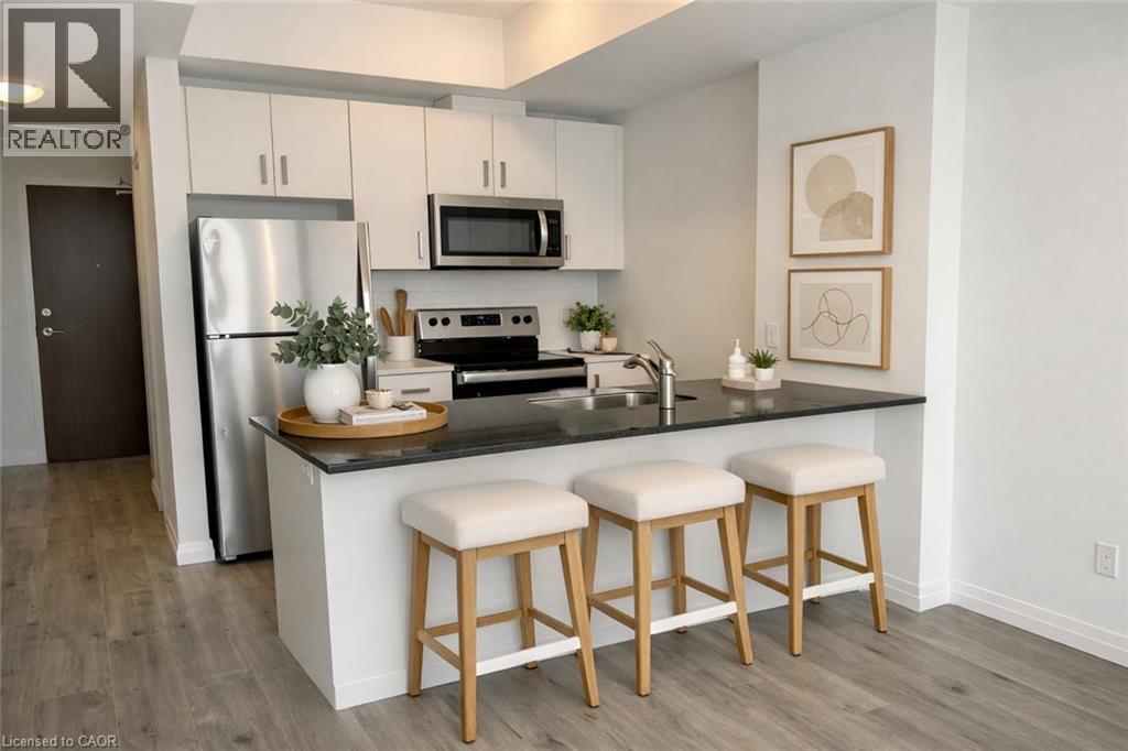Splish Splash! Get ready for POOL season!! Live in the heart of the innovation district in Kitchener and enjoy this modern Garment St condo that offers 1 bedroom, 1 bathroom, office niche, and open concept layout. Ample nature lighting from the large windows, features include wide plank engineered flooring, upgraded cabinets to 36, granite counter top, subway tile backsplash, eat-in breakfast bar, stainless steel appliances, in-suite washer & dryer, and private balcony. Also, check out the amazing building amenities like: outdoor swimming pool, half-court basketball court, landscaped terrace with BBQ, party room & private patio, outdoor dog run with pet washing stations, fitness room & yoga/wellness studio, garbage and recycling chute. This location can't be beat as it's near light rail transit (LRT), Go-Train Station, bus transit, walking distance to the Tech Hub - Google, Desire 2 Learn, Communitech, The Tannery, walking distance to University of Waterloo School of Pharmacy and Michael G. DeGroote of Medicine (McMaster University), walking distance to downtown Kitchener, Victoria Park, City Hall, restaurants, coffee shops, and shopping. Don't delay - book your showing today! (id:64974)