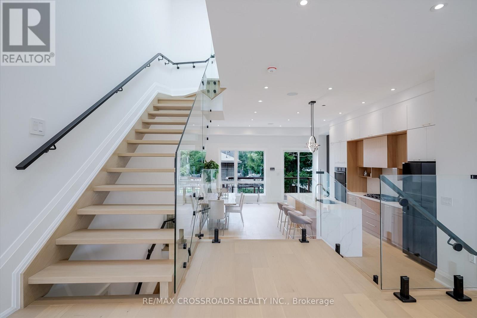 Luxurious Home In Toronto High Demand Area. Open Concept Living & Dining With Gorgeous Engineered Hardwood Flooring, Large Windows & Led Lighting! Chef's Kitchen With Quartz Counters & Backsplash, Waterfall Centre Island & S/S Appliances Including Gas Range & Built-In Microwave Oven! Stunning, Sun Filled Family Room With Custom media Wall, overlooking large deck & fully fenced Backyard! 2nd Floor Features Primary Bedroom Features Large Closet & Spa Like Ensuite With Glass Shower & Large Quartz Vanity! 2nd bedroom offers its own 3 piece en-suite. 3rd & 4th Bedroom Feature Large Windows & Closets, with 3pc common washroom. Walk-out Basement with high Ceilings, recreational room, One bedroom plus one washroom & an office space. Wet bar with B/I cabinets, sink & Quartz Counter. Fully tiled furnace room. Single car garage with a long Interlocked driveway for parking. Close to park and schools. * Fenced & Gated Backyard, l* Easy Access To Downtown, Bike To The Bluffs* 8 Mins Walk To THE GO* Close To Top Ranking Schools, Shops & Parks. (id:64974)