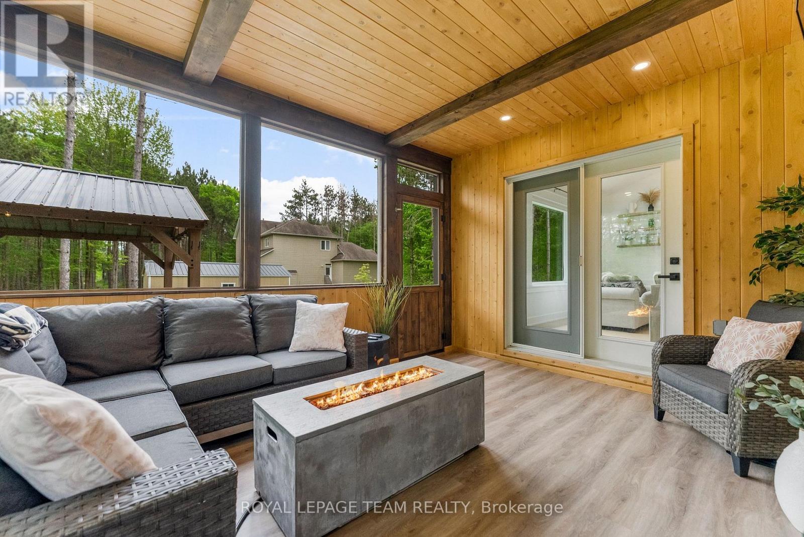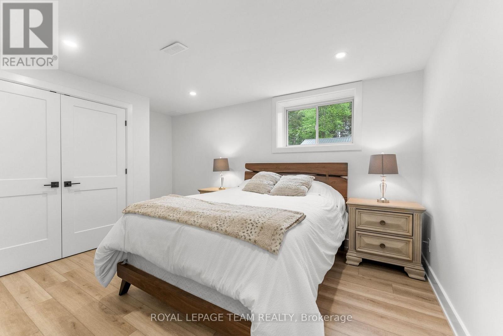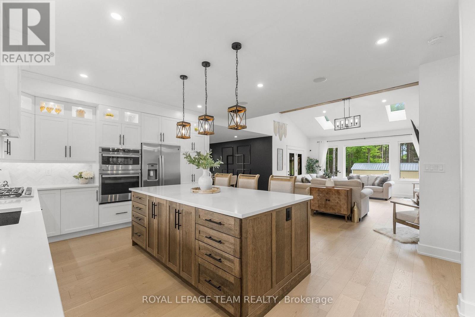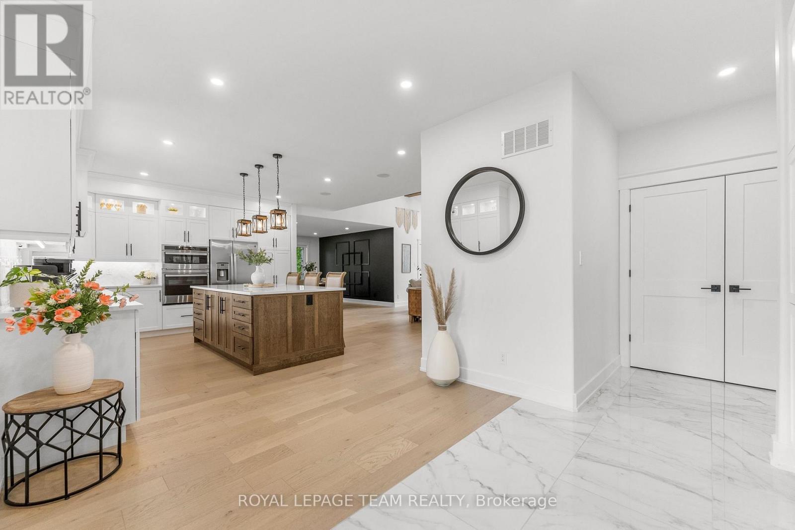 Welcome to this CUSTOM-finished, show-stopping BUNGALOW where luxury and lifestyle collide on a pristine 1-ACRE lot, just steps from the prestigious Eagle Creek Golf Club in beautiful Dunrobin - just 35 minutes from downtown Ottawa and 20 from Kanata. From the moment you arrive, you are greeted by the OVERSIZED DRIVEWAY and detached 2-car garage with a heated workshop. Inside the home, premium oak engineered hardwood and sleek marble-gloss tiles guide you through an OPEN-CONCEPT masterpiece. The kitchen is a chefs dream, featuring custom cabinetry with built-in lighting, a MASSIVE island perfect for gathering, a pot filler faucet for added convenience, and high-end stainless steel appliances. The dining area shines with a built-in hutch & bold ACCENT wall, while the living room stuns with CATHEDRAL ceilings, seamlessly flowing to a screened-in porch, ideal for entertaining or watching the game. Step onto the oversized COMPOSITE DECK, soak in the HOT TUB, and embrace outdoor living like never before. The main-level primary suite is a retreat of its own, boasting a SPA-INSPIRED 5-piece ensuite with heated marble flooring, a glass stand-up shower, a luxurious soaker tub, DUAL SINKS, and a walk-in closet. Another spacious bedroom and full bath complete this level. And yes, there is even your very own indoor GOLF SIMULATOR room. Practice year-round, rain or shine on this state of the art system. Downstairs, luxurious comfort continues - enjoy a FULLY FINISHED rec room with two distinct living areas, a dedicated exercise room, a third bedroom, and a full bath. This isn't just a home, it's a lifestyle - and it's waiting for you. Every detail found at this property has been meticulously designed and thoughtfully crafted from doors & hardware to lighting, flooring, paint and cabinetry. 12 hour irrevocable on all offers. (id:64974)