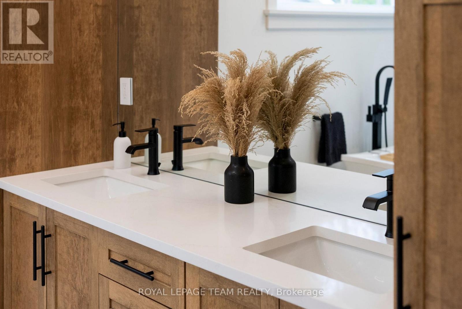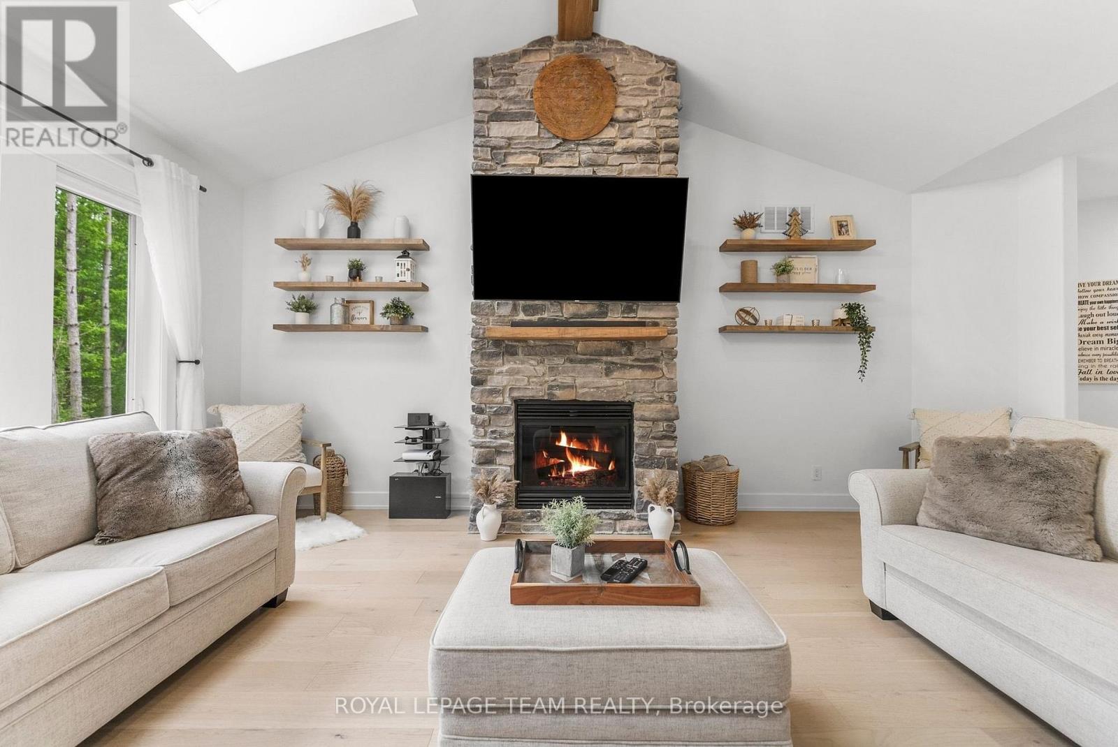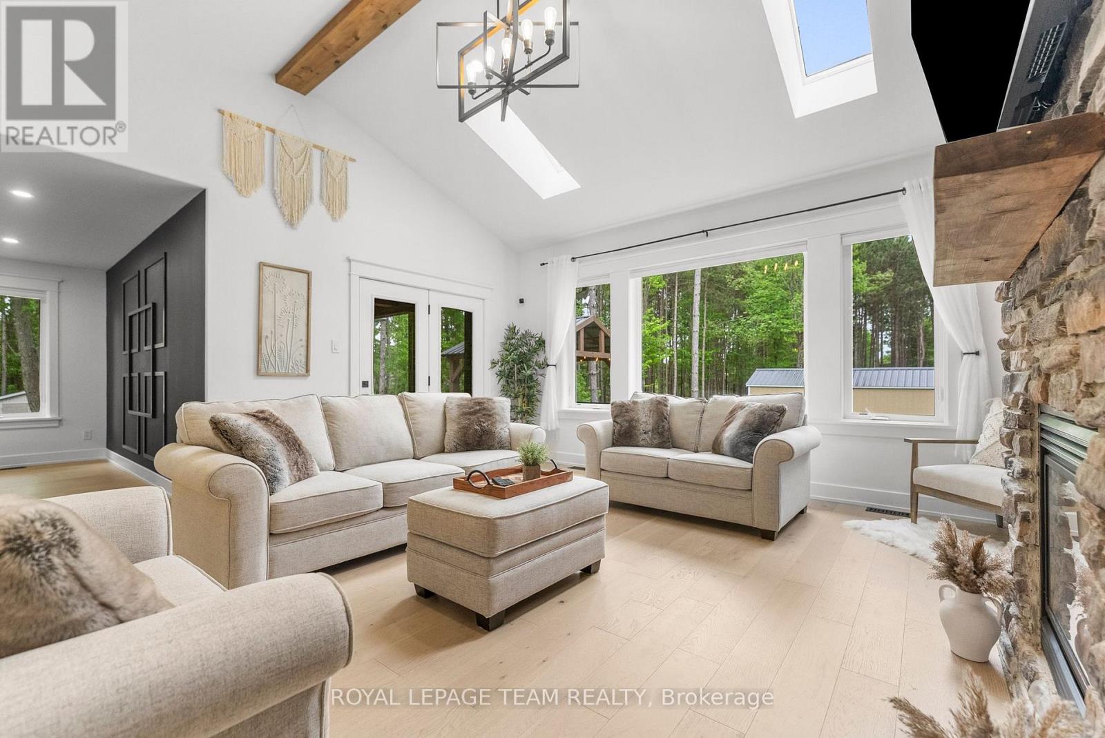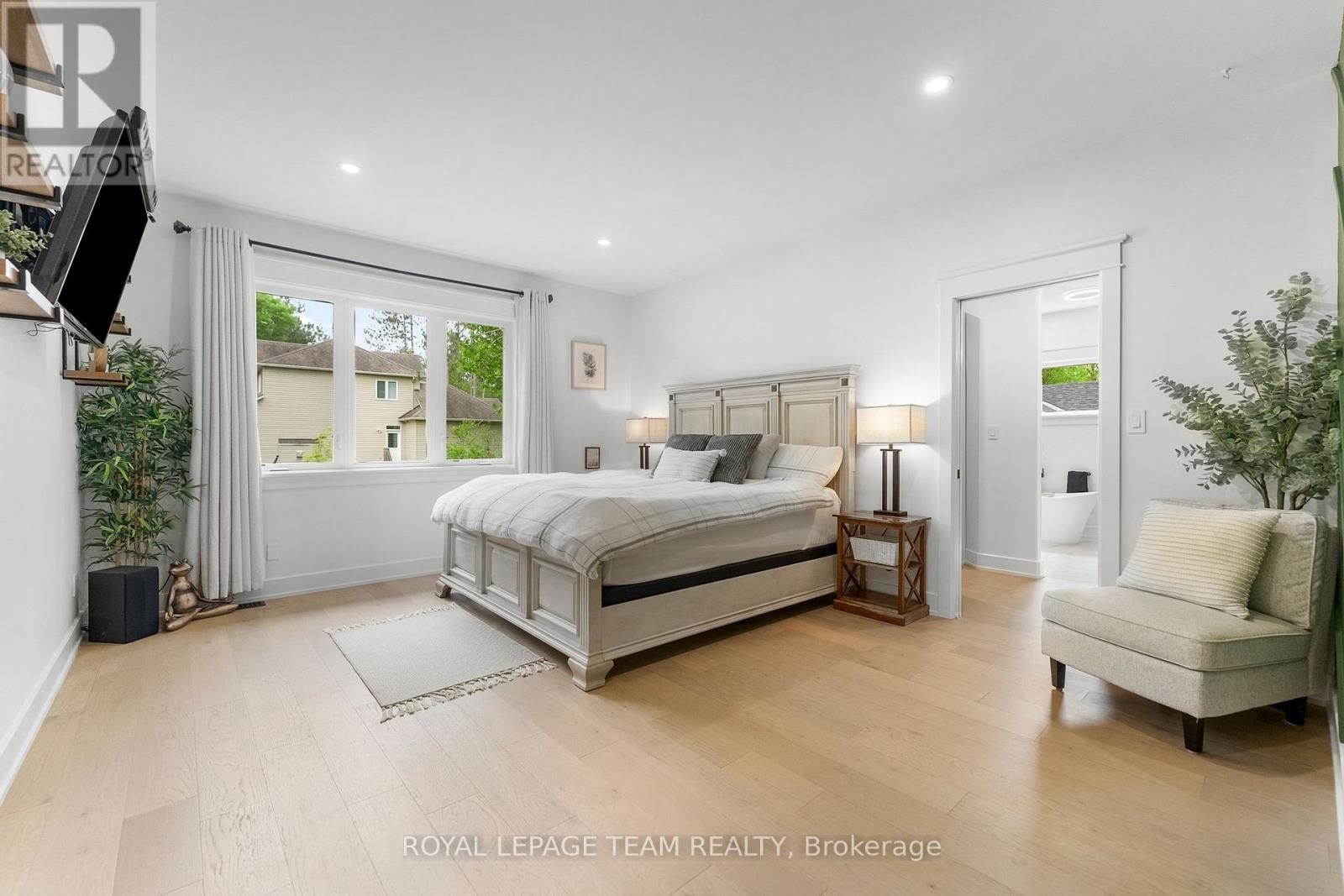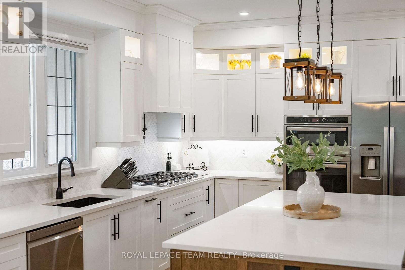 Welcome to this CUSTOM-finished, show-stopping BUNGALOW where luxury and lifestyle collide on a pristine 1-ACRE lot, just steps from the prestigious Eagle Creek Golf Club in beautiful Dunrobin - just 35 minutes from downtown Ottawa and 20 from Kanata. From the moment you arrive, you are greeted by the OVERSIZED DRIVEWAY and detached 2-car garage with a heated workshop. Inside the home, premium oak engineered hardwood and sleek marble-gloss tiles guide you through an OPEN-CONCEPT masterpiece. The kitchen is a chefs dream, featuring custom cabinetry with built-in lighting, a MASSIVE island perfect for gathering, a pot filler faucet for added convenience, and high-end stainless steel appliances. The dining area shines with a built-in hutch & bold ACCENT wall, while the living room stuns with CATHEDRAL ceilings, seamlessly flowing to a screened-in porch, ideal for entertaining or watching the game. Step onto the oversized COMPOSITE DECK, soak in the HOT TUB, and embrace outdoor living like never before. The main-level primary suite is a retreat of its own, boasting a SPA-INSPIRED 5-piece ensuite with heated marble flooring, a glass stand-up shower, a luxurious soaker tub, DUAL SINKS, and a walk-in closet. Another spacious bedroom and full bath complete this level. And yes, there is even your very own indoor GOLF SIMULATOR room. Practice year-round, rain or shine on this state of the art system. Downstairs, luxurious comfort continues - enjoy a FULLY FINISHED rec room with two distinct living areas, a dedicated exercise room, a third bedroom, and a full bath. This isn't just a home, it's a lifestyle - and it's waiting for you. Every detail found at this property has been meticulously designed and thoughtfully crafted from doors & hardware to lighting, flooring, paint and cabinetry. 12 hour irrevocable on all offers. (id:64974)