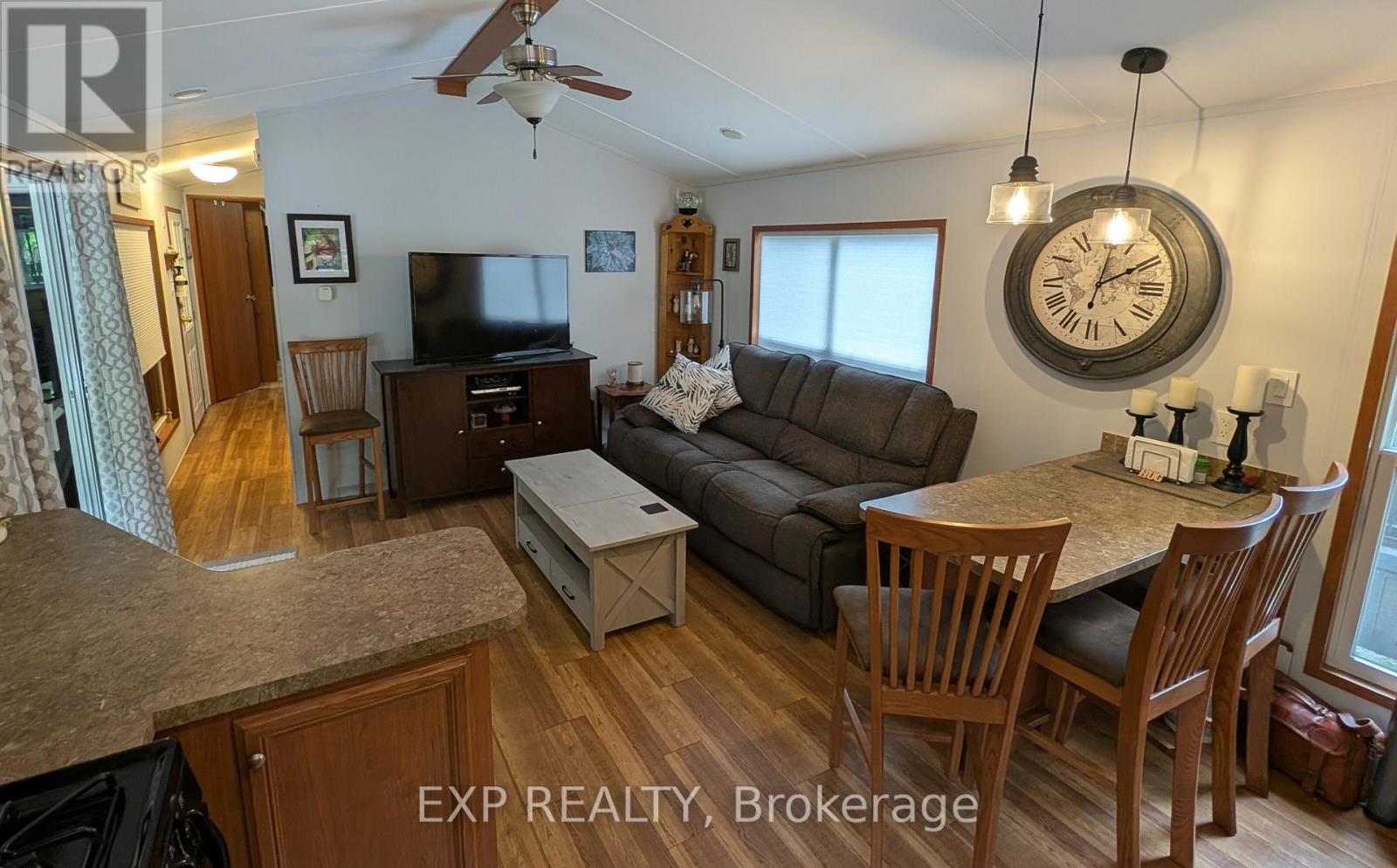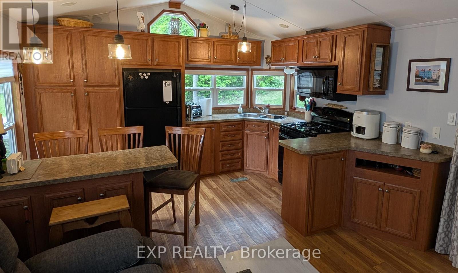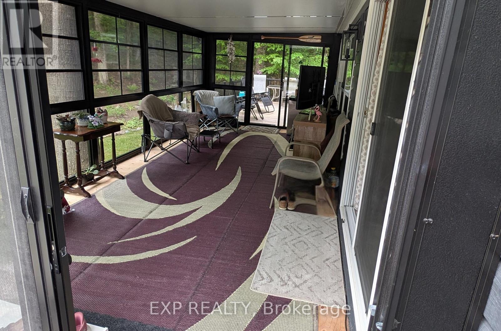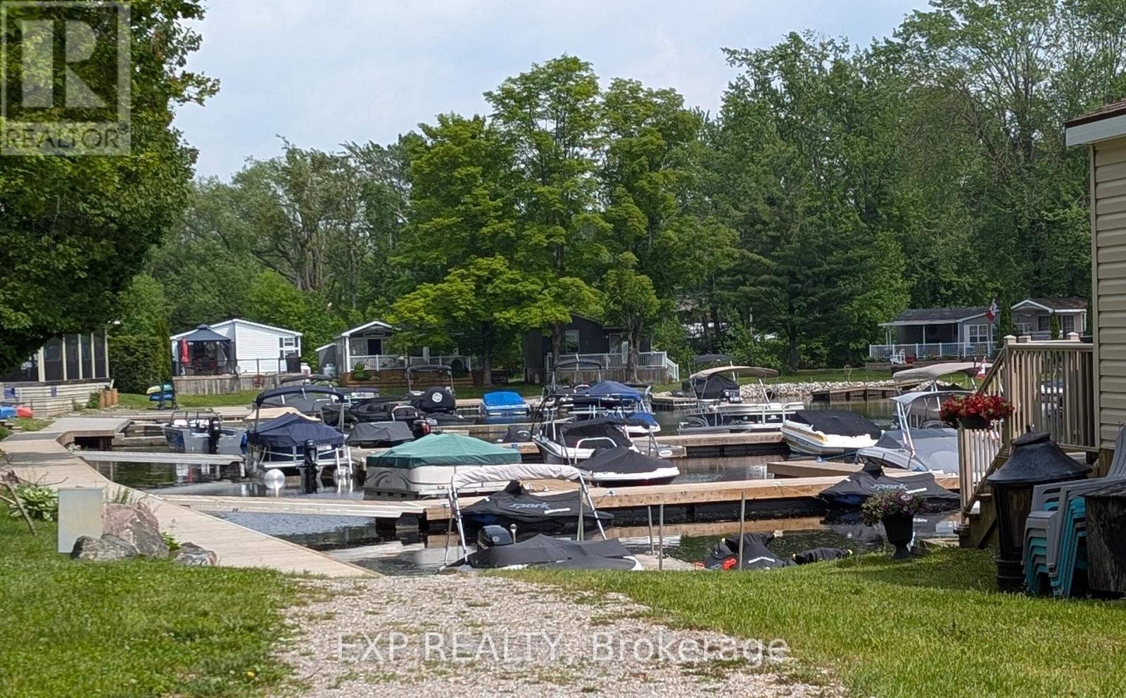 Peace, Tranquility, and Relaxation await. Welcome to your new 3-season home located in Shamrock Bay Resort. The resort is open May 1st to October 31st, and has all of the summer amenities you could ask for. This well maintained, open concept modular home is situated on the perfect lot for someone wanting privacy within nature. Your neighbour is the forest. Enter into a 3 year old sunroom (20' x 10'), allowing ample space to enjoy the outdoors from inside. Inside you will find a front facing kitchen with ample cupboard storage and an eat-in bar with stools. Opening up to the living room before walking down the hall to the guest bedroom, 3-piece bathroom, and master bedroom at the back. The master is complete with built in storage, including an office area, and a large window facing the back of the lot to enjoy more of natures beauty. Outside you find a large deck (16' x 10') for entertaining, a firepit for those cozy summer nights, and a beautifully maintained garden along the forest edge. Just down the road into the community you find a community room, inground pool, sports court, and playground. In addition there is a small library and apay per use laundry facility and a beach along the river. Have a boat? There is a boat launch area and a marina (check with the resort on availability and costs). This resort is conveniently located just off Hwy 11, but far enough that you can lose yourself in the joys of cottage living. Annual fees ($8115 in 2024) cover hydro, water, sewer, garbage collection, outside maintenance, community living maintenance and property taxes. (id:64974)