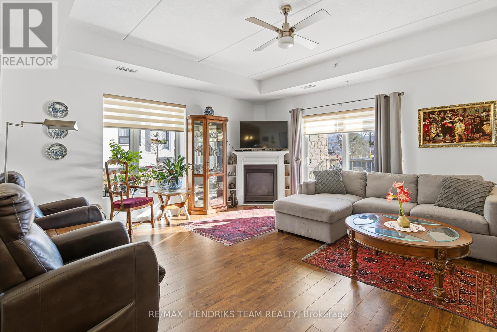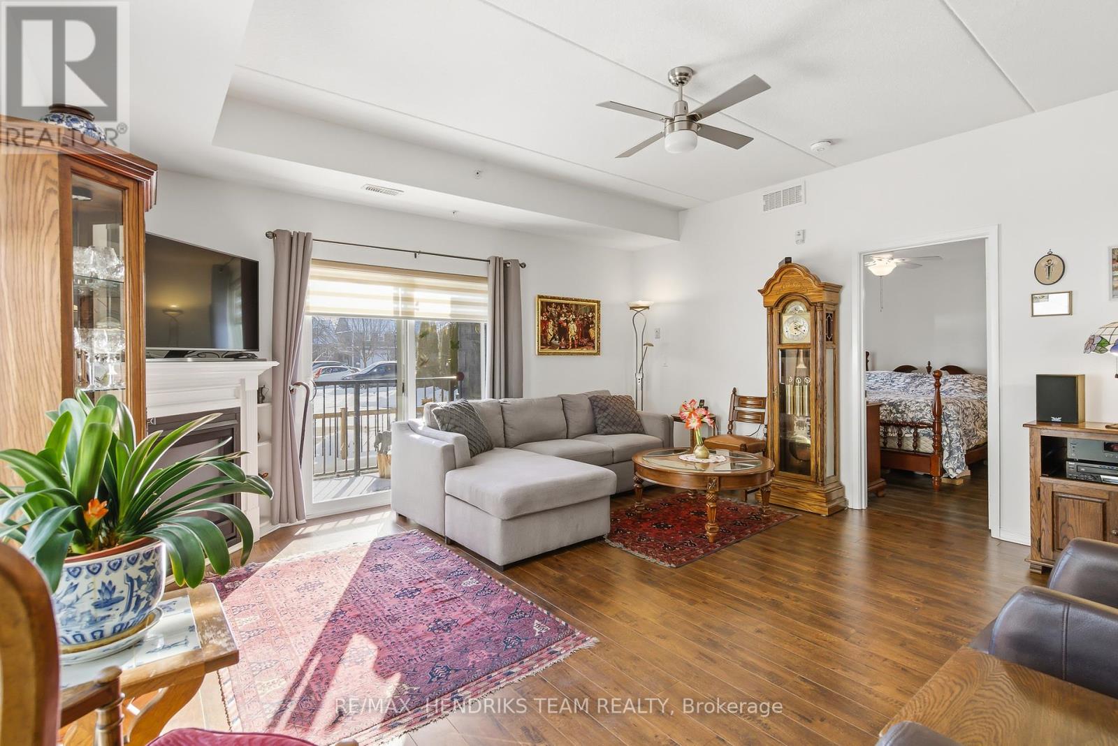 Walk right into your condo with no need to use the elevator! Convenient main floor 2 bedroom, 2 bath accessible condo over 1,100 square feet! Wonderfully kept and cared for by the owners since new in 2016. Wonderful natural light shines into this South-East exposure corner unit. Open design living area with white & bright kitchen with plenty of cabinets and counter-space with adjacent dining room area. Spacious living room with corner gas fireplace. Sliding patio doors to balcony - perfect for a morning coffee and a relaxing afternoon book read. Private split-bedroom layout with primary bedroom ensuite with easy step-in shower. The 2nd bedroom is currently used as a den and has an adjacent 3 piece bath with accessible step-in jetted bathtub. Laundry room with convenient stack-able washer and dryer and laundry tub. Includes central air, owned hot water tank, forced-air gas furnace, one surface parking space, private locker plus common area room for additional patio furniture and bike storage. This exceptionally maintained building also offers a large social room with kitchen and bathroom, exercise room, and a craft & hobby room. And for the spring to fall months you can enjoy the outdoor space with gazebo and bbq area. Condo fees are keep very reasonable by having no costly pool or underground parking to maintain. A great quiet neighbourhood too - just a short walk to shopping, groceries, pharmacy, dining, churches, transit plus quick access to highway 58, the 406 and onwards to the QEW and all that Niagara has to offer! (id:64974)