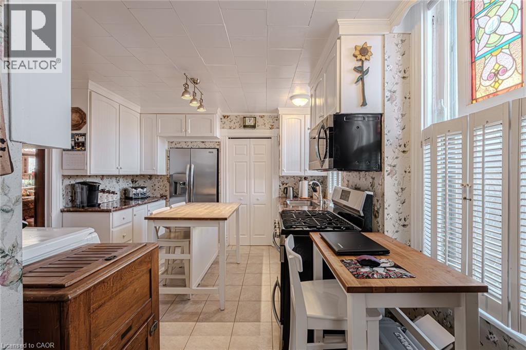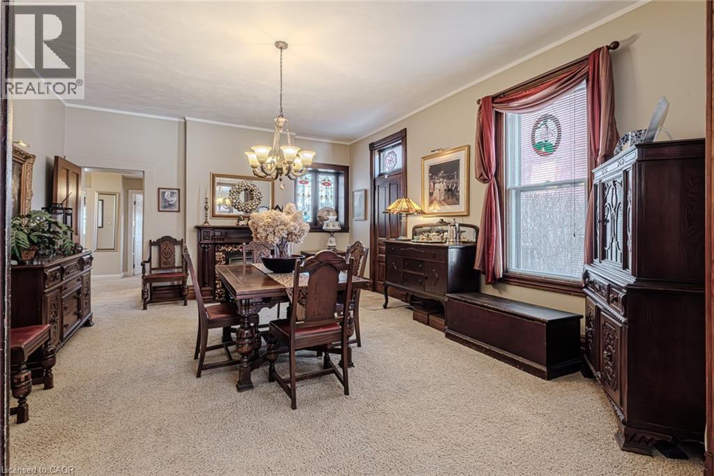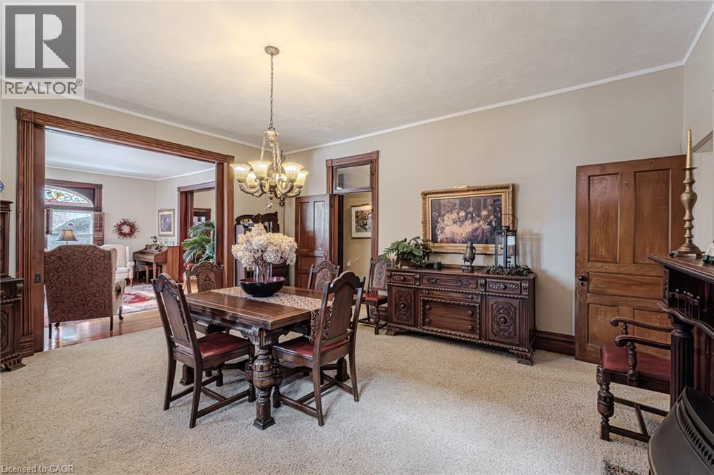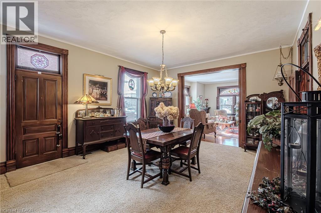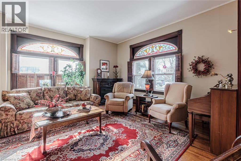 Gorgeous 2.5 story home in the heart of Simcoe. Pull in the private driveway leading to the manicured front yard and the covered porch. Step indoors to the foyer which leads to the parlor. Tall ceilings and stunning original features surround you in this inviting space. From here enter the spacious living room with pocket doors on either side. Original hardwood floors in both the parlor and living room. Natural light beams in from the large windows throughout the mainfloor with a colourful display of stained glass in the dining room. Next is the dining room with plenty of space for the whole family to gather together. Down the hall is the kitchen featuring granite countertops, a pantry and a laundry space (mainfloor laundry!). Just off the kitchen is a door to the backyard. At the back of the home is the first comfortable bedroom, a four piece bathroom, a three piece bathroom and the primary bedroom. Follow the stairs up in the main unit to loft space with an extra bedroom, storage closet and a large attic space that could be finished into additional living space. The unfinished basement houses the utilities and provides storage space. Looking for more? Head up to the second unit with two bedrooms, an eat-in kitchen, 4 piece bathroom, spacious living room and a walk-out to the sun porch. Outdoors the backyard provides space for relaxing, gardening, barbecuing and entertaining. The garage is perfect for storing all those extras in life. This charming property is perfect for a family or an investor. Located near shopping, library, schools and more. (id:64974)