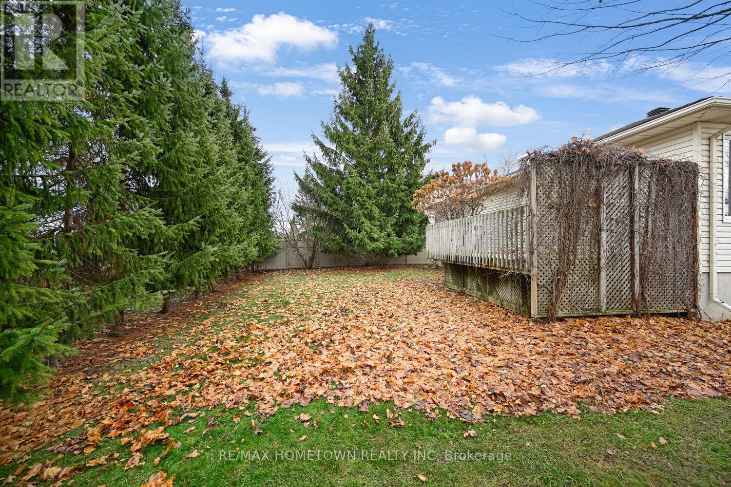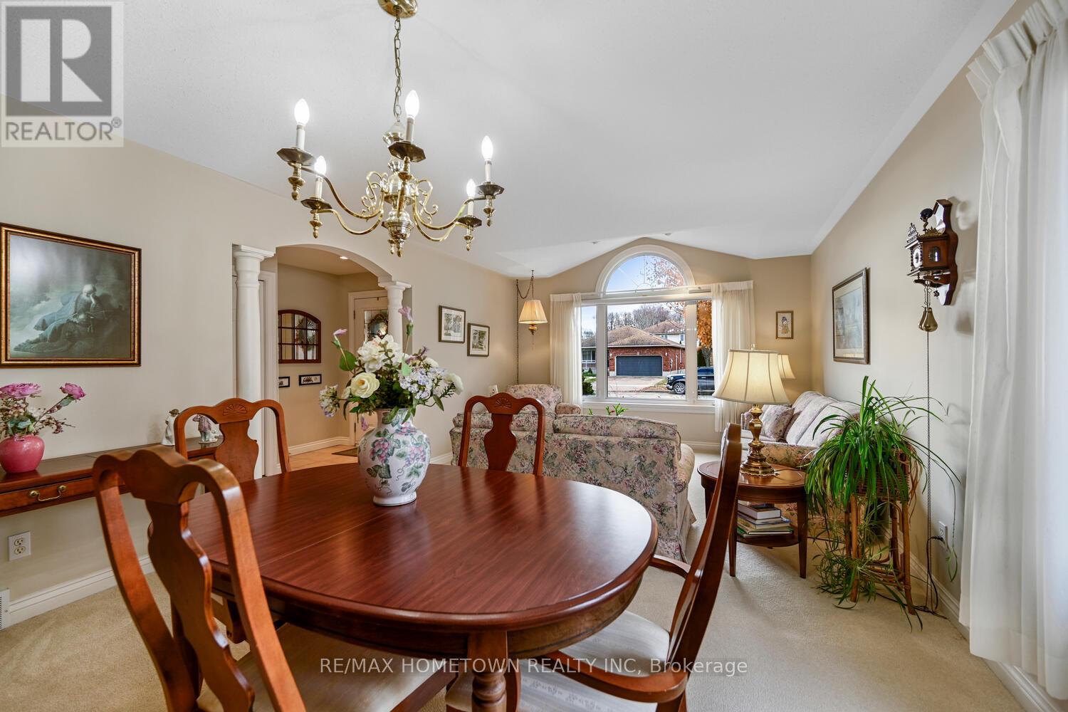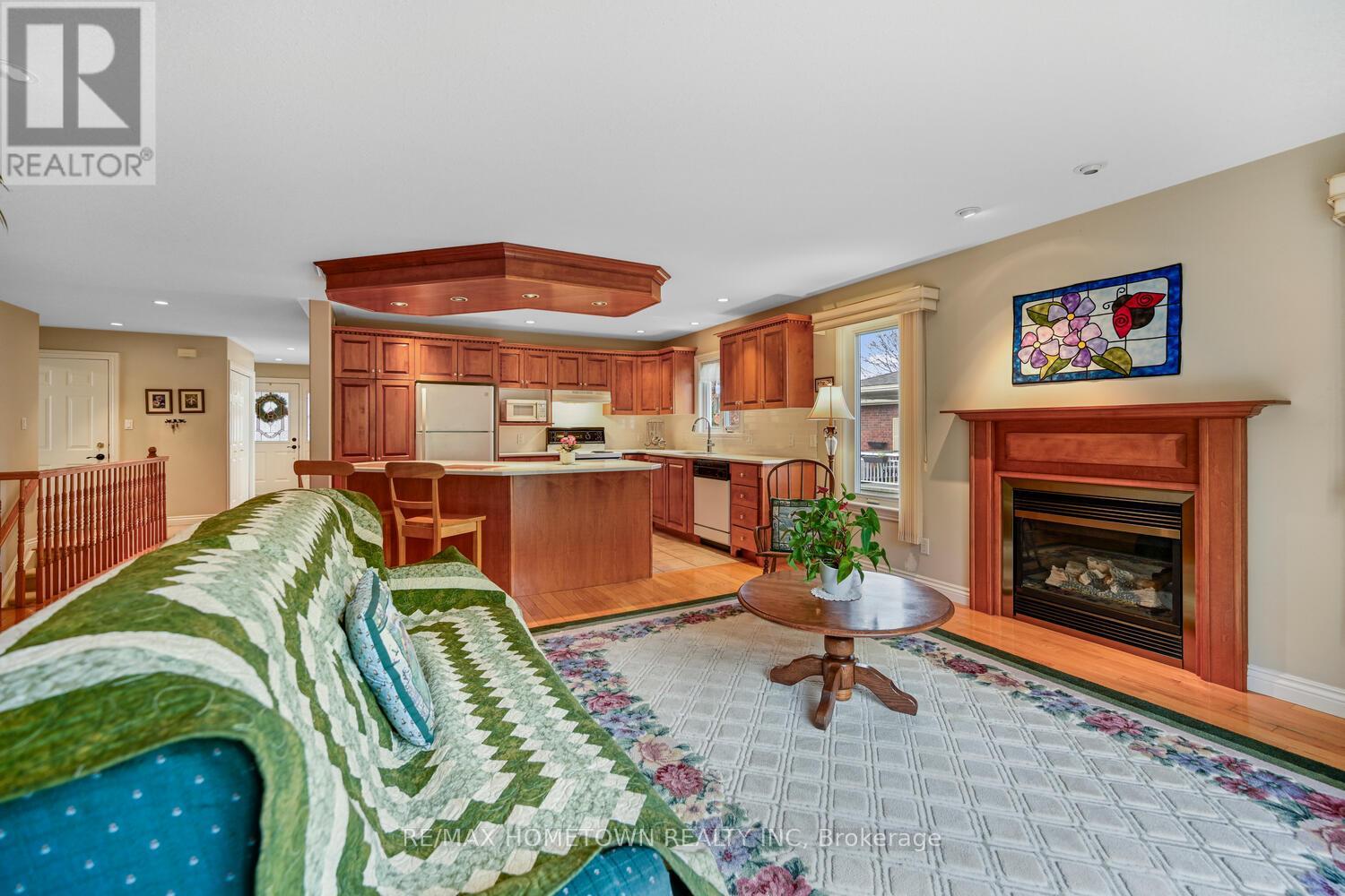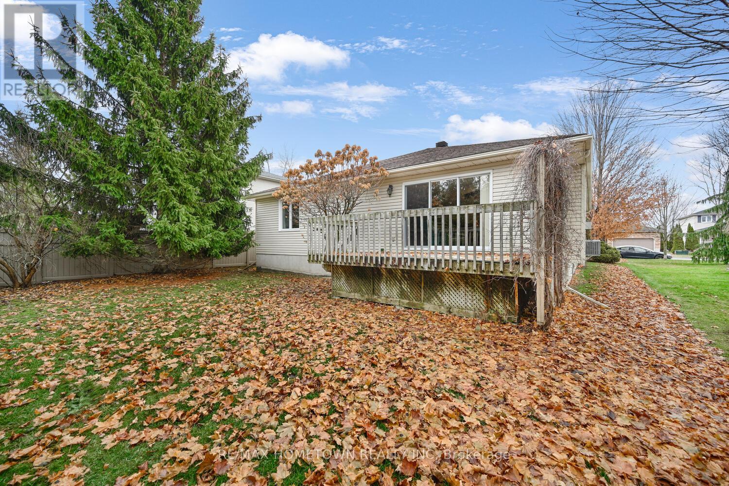 A rare and remarkable offering in the prestigious Bridlewood Subdivision, a community cherished since the early 1990s for its exceptional construction and enduring beauty under the stewardship of a family owned business, Bridlewood Homes Inc. This first-time-to-market bungalow showcases a thoughtfully modified Bridlewood floor plan and reflects a standard of care that feels almost untouched-truly a testament to pride of ownership. From the curb, the home sets an elegant tone with its full interlocking driveway, double garage, coordinated brick exterior, and interlocking walkway leading to the entrance. Inside, the generous foyer-with its double closet-opens gracefully into a pillared living and dining room crowned by a cathedral ceiling. An oversized casement window washes this space in natural light, creating an airy, inviting atmosphere that feels both classic and timeless. The beautifully updated kitchen offers abundant cabinetry and an eating island, opening seamlessly into a large family room anchored by a gas fireplace with oak mantle. A stunning triple patio door spans the rear wall, framing a truly extraordinary backyard-an expansive, private retreat lined with tall spruce trees that create the essence of country living within city limits. The primary suite offers a walk-in closet and a fully renovated, easily accessible ensuite. A second bedroom and a bright four-piece bath serve guests and family with equal comfort. The open, rail-detailed staircase leads to a bright 1,600 sq. ft. lower level, fully drywalled with electrical to code, oversized windows, and a three-piece rough-in-an exceptional canvas for future living space. With a newer roof, newer furnace, immaculate upkeep, and immediate availability, this home offers an elevated lifestyle suited to families, professionals, and retirees seeking refined living in Brockville's five-star, red-ribbon Bridlewood community. (id:64974)