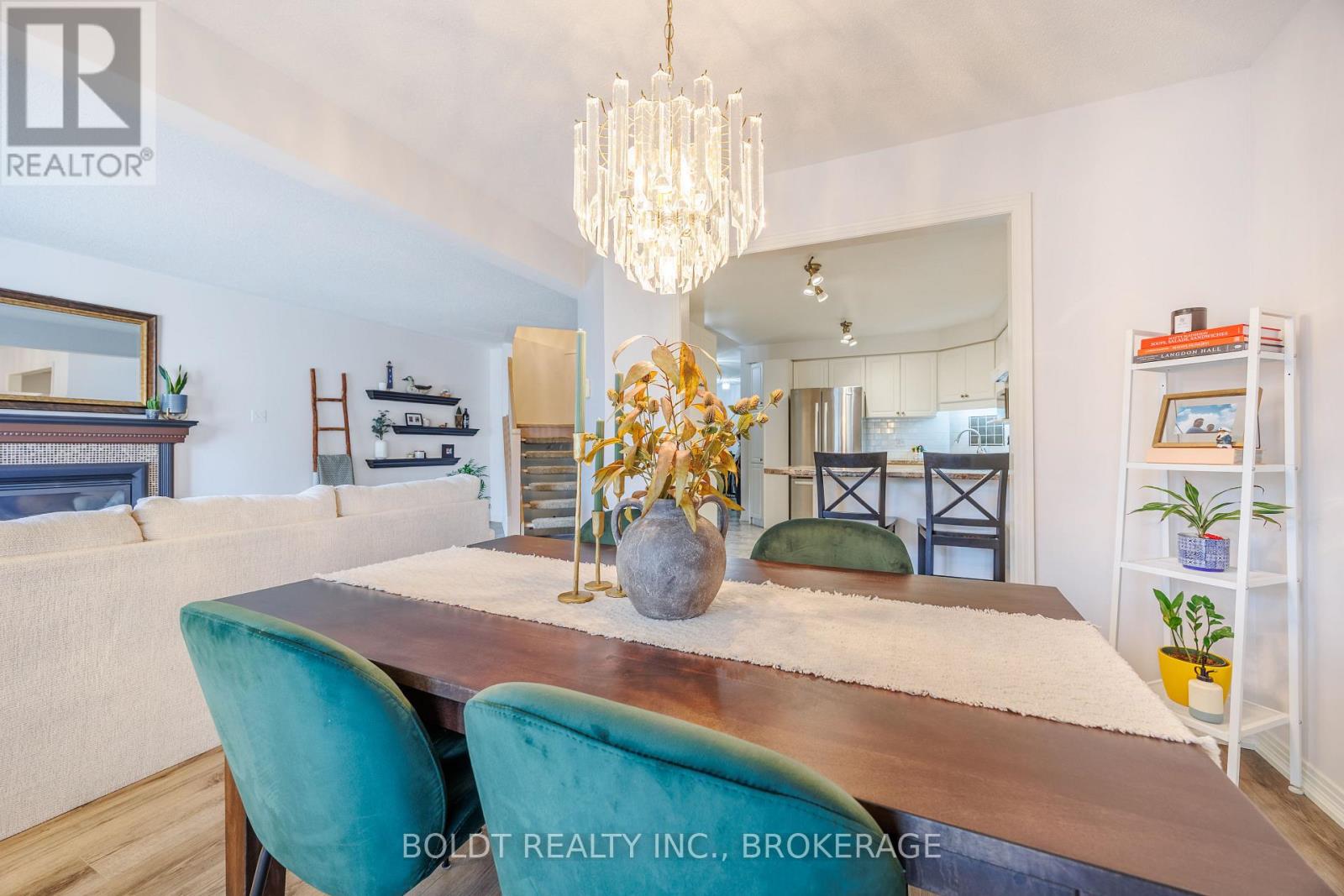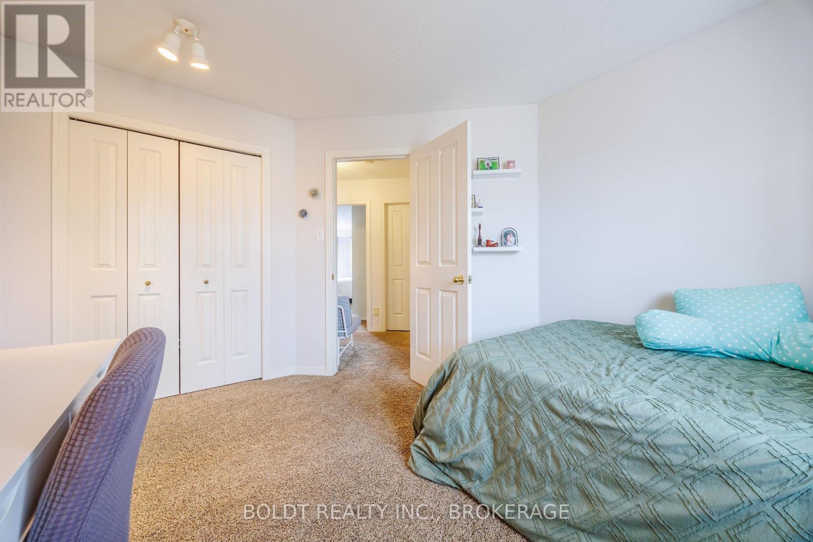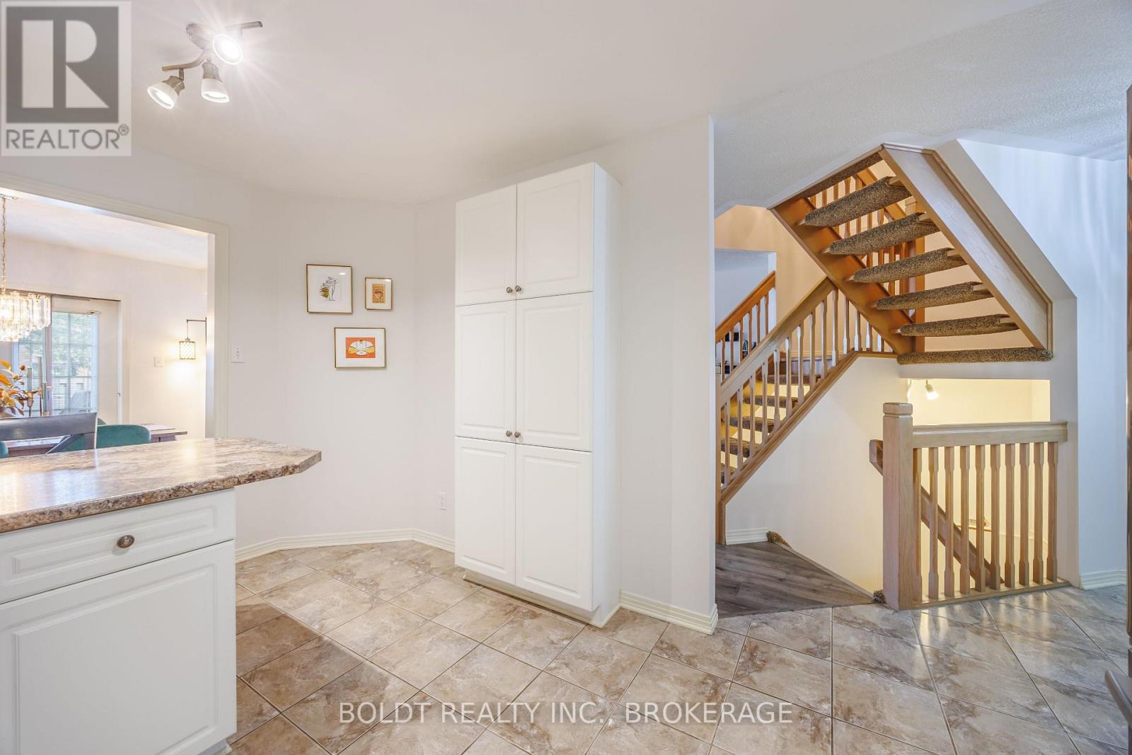 Wonderful 2 storey condo townhouse in a small 15 unit complex on a quiet cul-de-sac! Very quiet neighbourhood with mature trees and no traffic street. This is a desirable end corner unit allowing for more than average space and allowing for more natural light throughout the home. Spacious kitchen with white cabinetry and breakfast bar allows seating for three. Kitchen leads to the dining room and living room with gas fireplace. The dining room opens through garden rooms to a 11'6" by 10'6" wooden deck for barbecuing by natural gas hookup, lounging and dining in private. The upper floor has three large bedroom with the primary bedroom being 17 ft by 15.5 ft in size! This primary bedroom has a three piece ensuite and 9' by 8' walk-in closet. The other bedroom on the upper floor is a four piece with granite countertop. The interior has been recently professionally painted in a light bright neutral colour. All grass cutting, snow shovelling including driveway are done for you! This unit faces the Thames River with its walking trails only seconds away from your front door! All amenities from schools, shopping, groceries, restaurants are all too close! (id:64974)