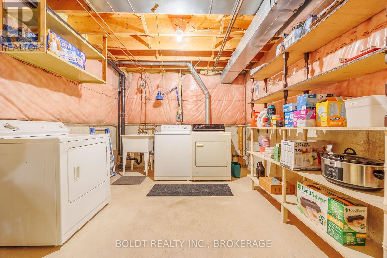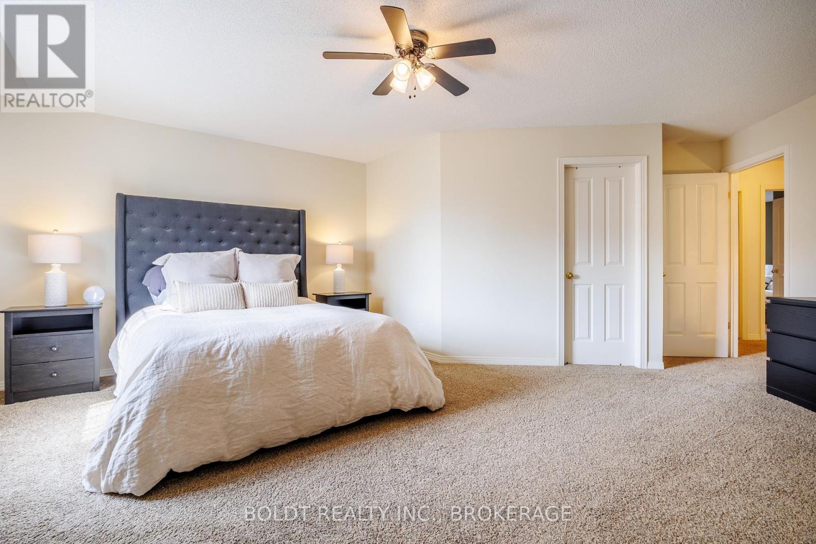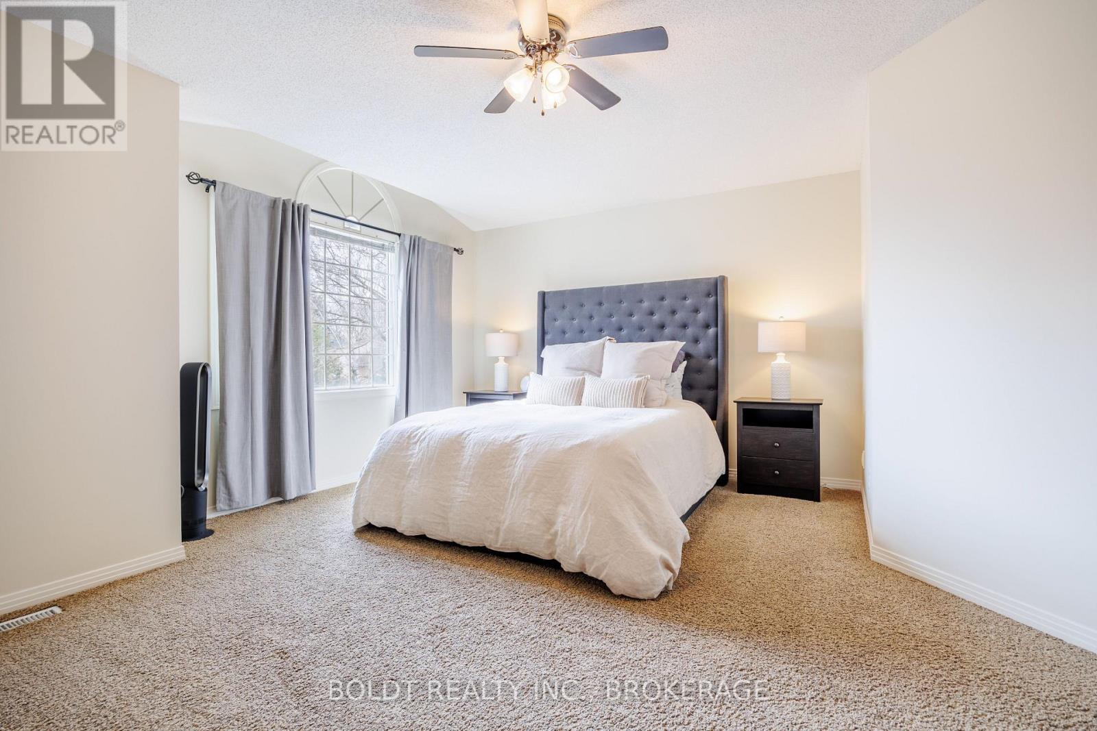 Wonderful 2 storey condo townhouse in a small 15 unit complex on a quiet cul-de-sac! Very quiet neighbourhood with mature trees and no traffic street. This is a desirable end corner unit allowing for more than average space and allowing for more natural light throughout the home. Spacious kitchen with white cabinetry and breakfast bar allows seating for three. Kitchen leads to the dining room and living room with gas fireplace. The dining room opens through garden rooms to a 11'6" by 10'6" wooden deck for barbecuing by natural gas hookup, lounging and dining in private. The upper floor has three large bedroom with the primary bedroom being 17 ft by 15.5 ft in size! This primary bedroom has a three piece ensuite and 9' by 8' walk-in closet. The other bedroom on the upper floor is a four piece with granite countertop. The interior has been recently professionally painted in a light bright neutral colour. All grass cutting, snow shovelling including driveway are done for you! This unit faces the Thames River with its walking trails only seconds away from your front door! All amenities from schools, shopping, groceries, restaurants are all too close! (id:64974)