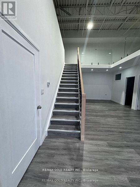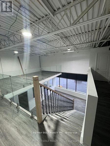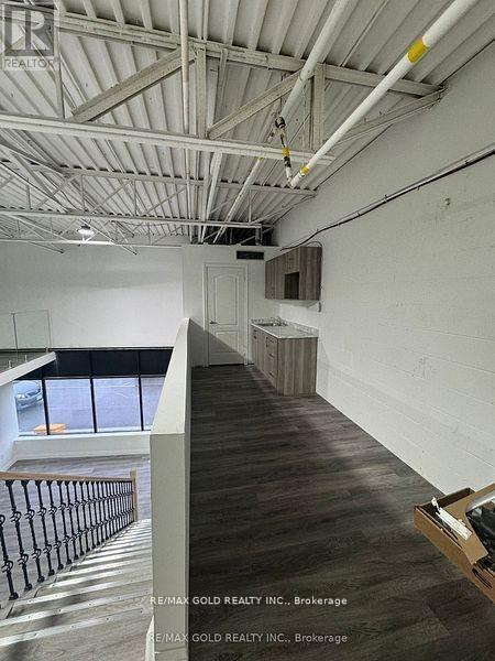 Unit allows auto repair/auto body shop use and features glass-front windows with excellent exposure. The space includes three private glass offices, a welcoming lobby area, kitchen, washroom, and additional upper-level workstation space. Steel ramp installed for automotive use.Boasting 18 ft clear ceiling height and a column-free layout, the unit offers excellent functionality for a variety of uses, including warehousing, light manufacturing, kitchen cabinet manufacturing, and other permitted industrial/commercial uses. (id:64974)
