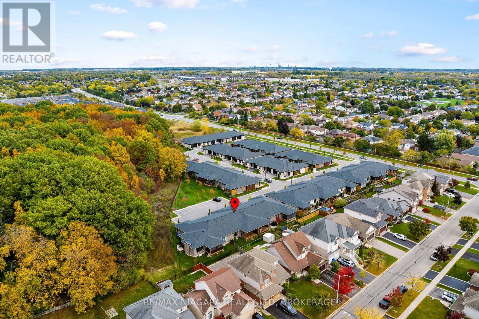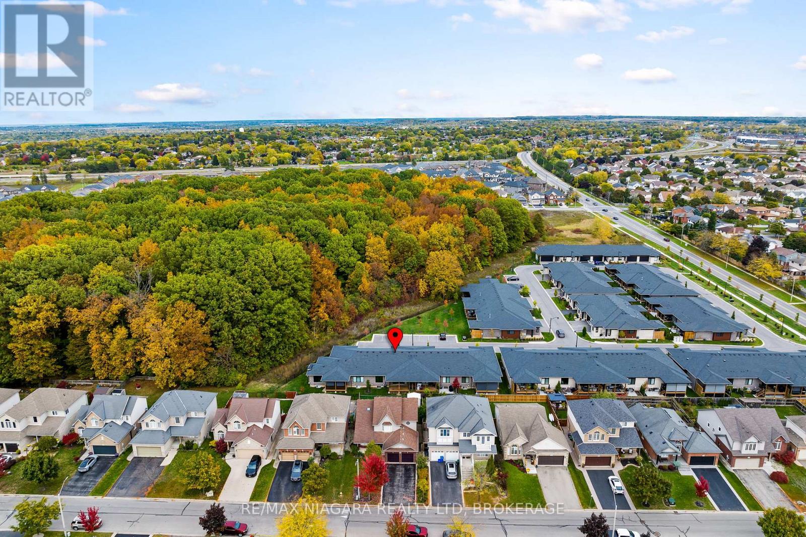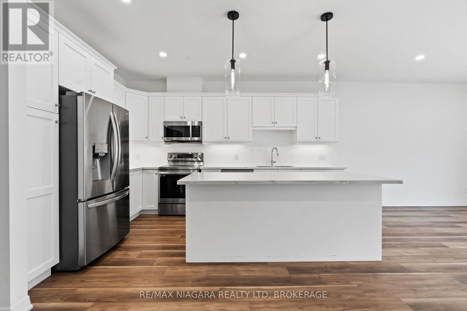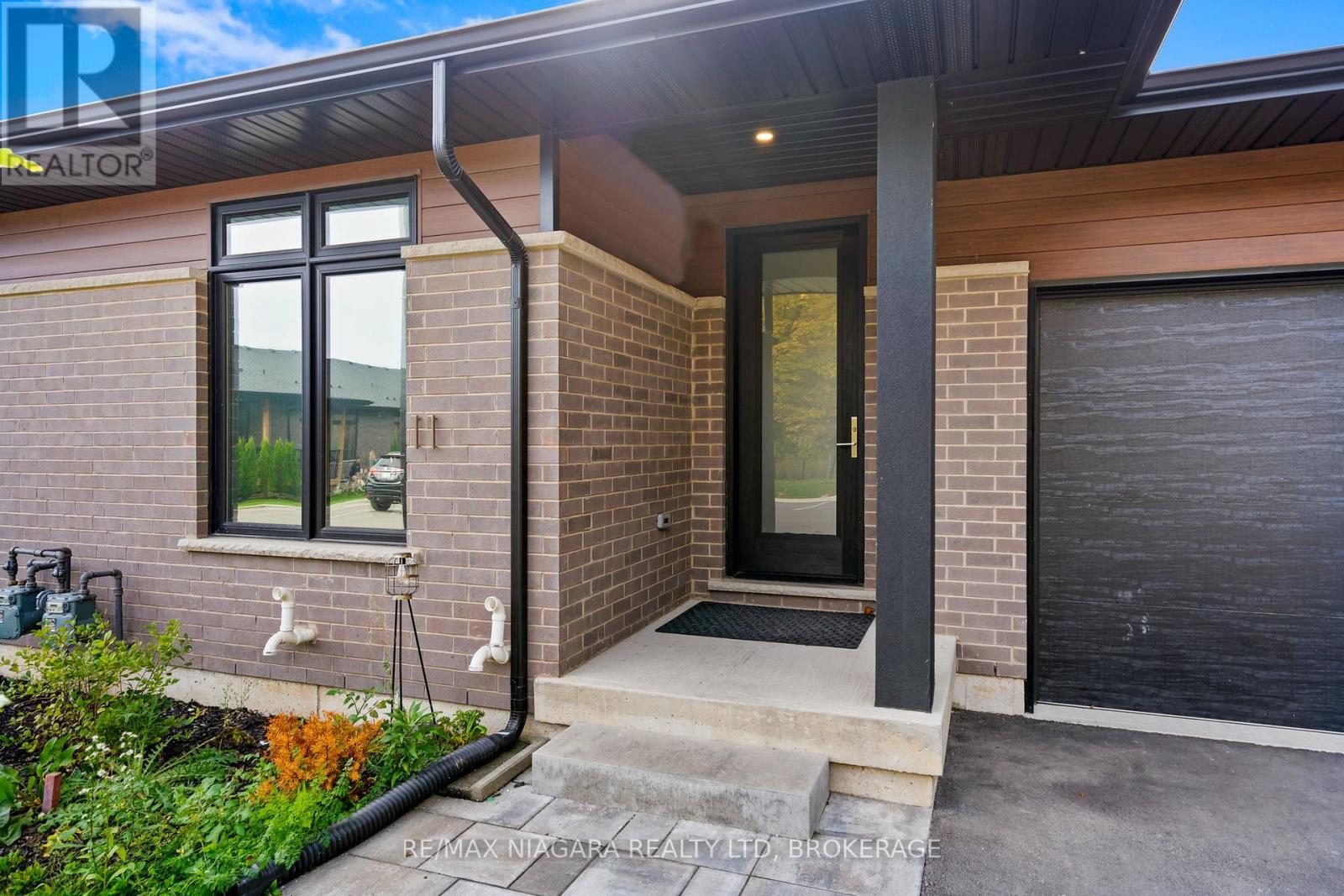 Discover over 2600 sq ft of beautifully finished living space in this bungalow townhome with its distinctive contemporary look and located in a wooded private setting on the edge of Thorold. Richmond Woods is your tranquil oasis. This thoughtfully designed home features 3+1 bedrooms, 2+1 bathrooms, a 1.5 car garage and main floor living for ultimate comfort and convenience with additional basement living space. Enjoy an open-concept layout filled with natural light, hardwood flooring, and a formal dining area ideal for entertaining. The upgraded kitchen offers a large island, quartz countertops, and seamless flow to your private deck, perfect for morning coffee or evening relaxation. Bathrooms feature quartz countertops and tiled glass showers, blending modern elegance with everyday functionality. The finished basement boasts large living room ideal for family or recreational space, with functional sink and space to add a dishwasher and fridge. Whether you're looking to downsize or enjoy a low-maintenance lifestyle in a serene, premium location, this home offers the perfect balance of space, style, and tranquility. (id:64974)