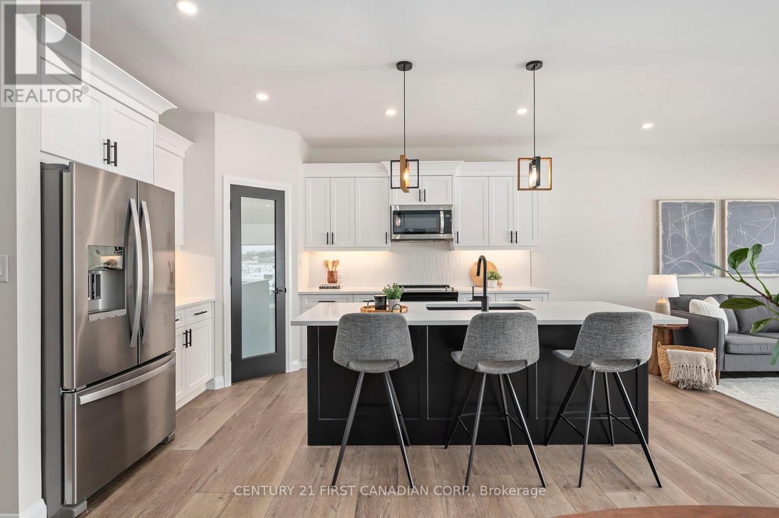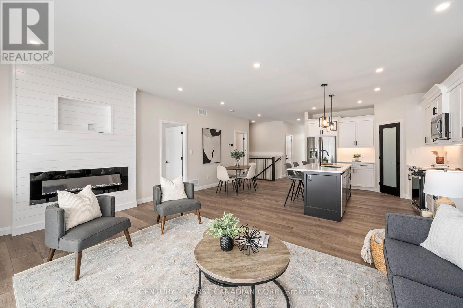 Welcome to this exceptional interior-unit bungalow condo, where refined craftsmanship and modern elegance come together in the heart of Ailsa Craig. Thoughtfully designed with a focus on quality and detail, this residence offers sophisticated single-floor living with a seamless open-concept layout.Featuring 3 generously sized bedrooms and 3 beautifully appointed bathrooms, this home delivers both comfort and elevated design. The fully finished lower level extends the living space, offering a versatile retreat ideal for entertaining, guests, or a private lounge.At the heart of the home, the designer kitchen showcases premium quartz countertops, rich wood cabinetry. Where style and function come together to create a truly impressive culinary space. Throughout, luxury vinyl flooring provides a durable yet upscale finish, complementing the home's cohesive and polished aesthetic.Every element of this residence has been carefully curated to offer a balance of luxury, comfort, and low-maintenance living-an outstanding opportunity to experience upscale condo living in one of Ailsa Craig's most desirable communities.Taxes and assessed value yet to be determined. List price reflects the anticipated benefit of a proposed Government HST rebate (not yet enacted). HST included with all applicable rebates assigned to the Builder. Price is contingent on Buyer eligibility and rebate implementation. (id:64974)