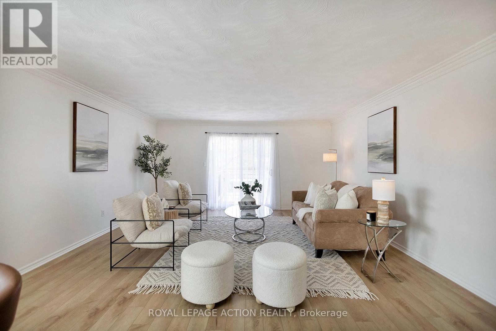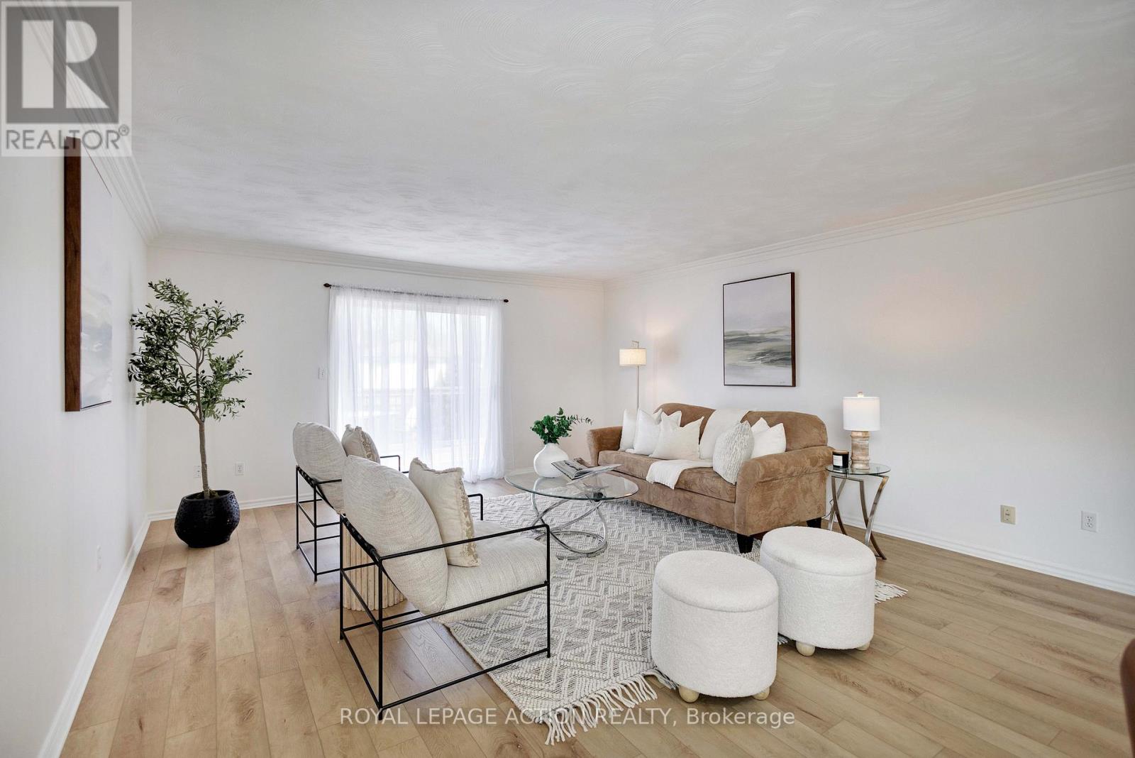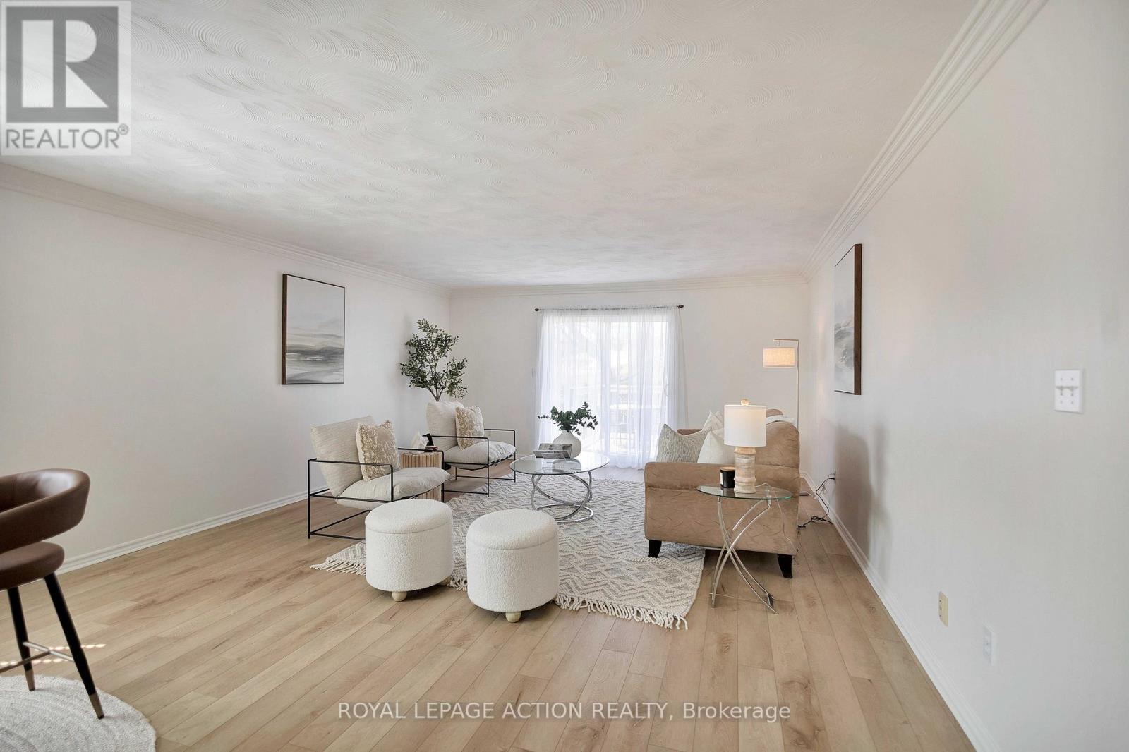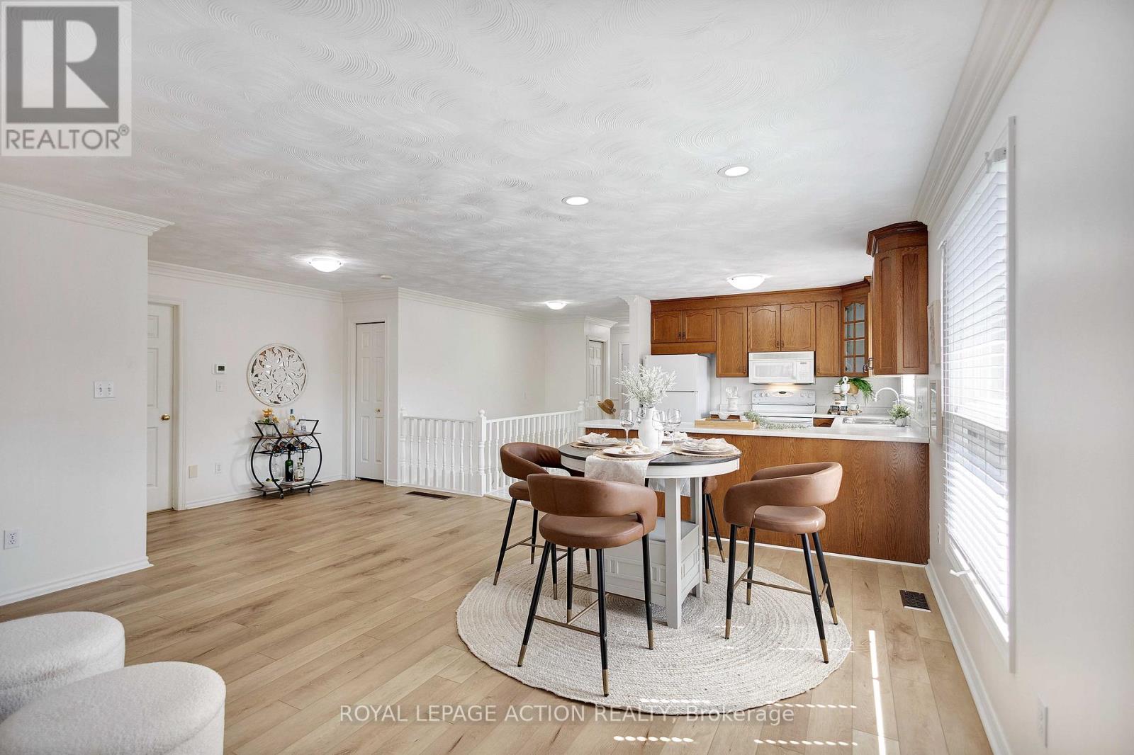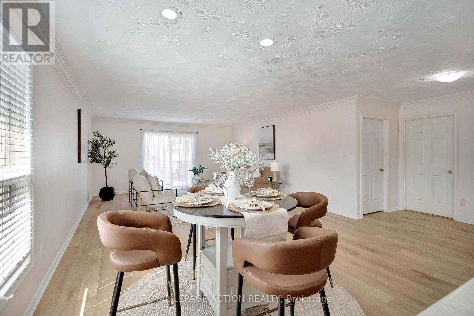 Welcome to this beautifully maintained end-unit townhouse condo offering comfort, convenience, and move in ready living! Featuring 2+1 bedrooms and 2 full bathrooms, this home is perfect for downsizers, first time buyers or anyone seeking low maintenance living without sacrificing space. This unit has a full garage and offers a second entrance direct to the home. The main floor doors are all 34 inches which meets accessibility requirements for walker/wheelchair, basement doors are standard 30 inches. Step inside to a bright, open concept layout which is enhanced by large windows that fill the home with natural light. The freshly painted interior provides a clean, modern feel throughout. Enjoy the ease of main floor laundry and a functional layout designed for everyday living. The spacious living and dining area flows seamlessly to a private deck through patio doors- perfect for morning coffee or relaxing evenings. The additional bedroom offers flexibility for guests, and the lower level includes a home office and a hobby space. Located in a highly desirable area close to shopping, transit, and all amenities, this home offers both lifestyle and convenience. A fantastic opportunity- just move in and enjoy! Front entrance pictures AI enhance to simulate a sunset. (id:64974)