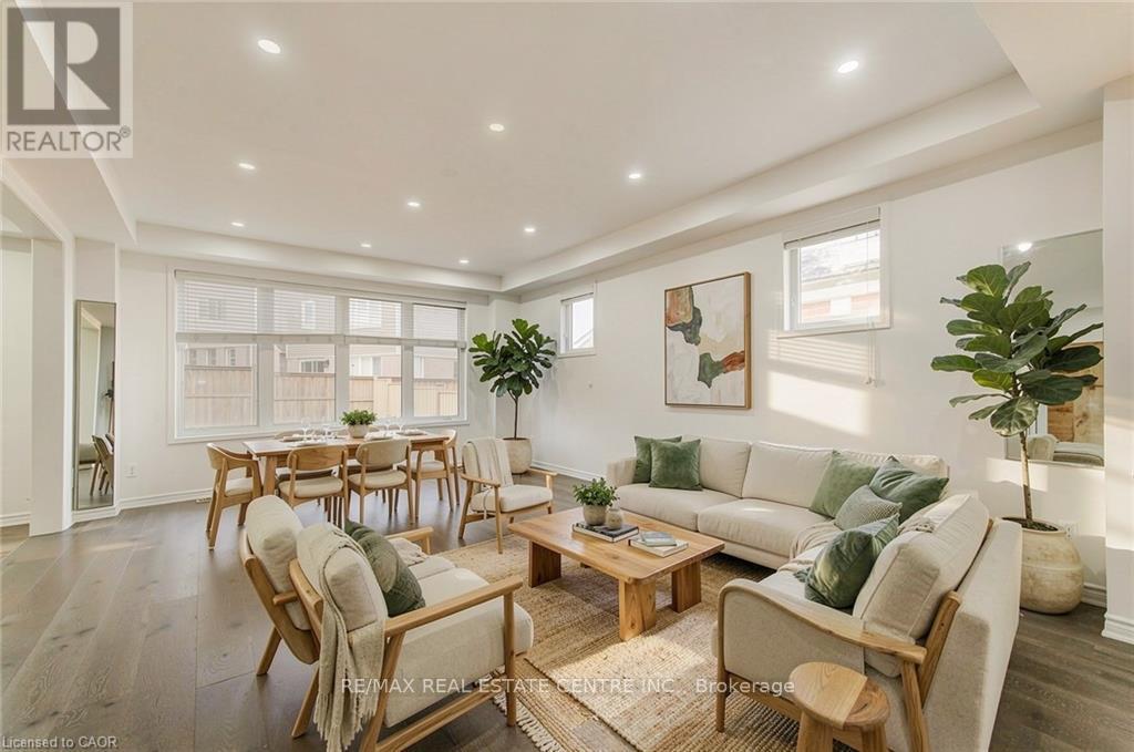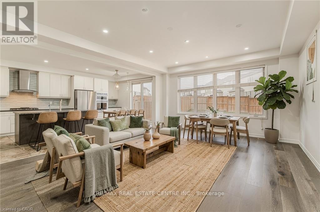 Welcome to 11 Compass Trail, a beautifully upgraded detached home offering exceptional interior finishes and a thoughtfully designed layout for modern living. The bright open-concept main floor features spacious living and dining areas, 9-foot ceilings, hardwood flooring, interior and exterior pot lights, and a convenient 2 piece bathroom. The upgraded chef's kitchen is complemented by a walk-in pantry, ideal for everyday living and entertaining. Elegant wood stairs with iron railings lead to the second level, where you'll find four generously sized bedrooms and two well-appointed bathrooms with cultured marble counters. The primary bedroom retreat boasts a luxurious ensuite and multiple walk-in closets. Situated on a premium 36 x 108 ft lot, this home features a fully fenced backyard, double car garage, and parking for four vehicles. Enjoy a rare setting fronting onto protected green space with a flowing river stream, scenic views, nearby pond, nature trails, and parks, all while being ideally located in a prime Cambridge neighborhood close to major amenities and highways. A perfect blend of luxury, nature, and convenience. The home is freshly painted and ready to move in, book your showing today! (id:64974)