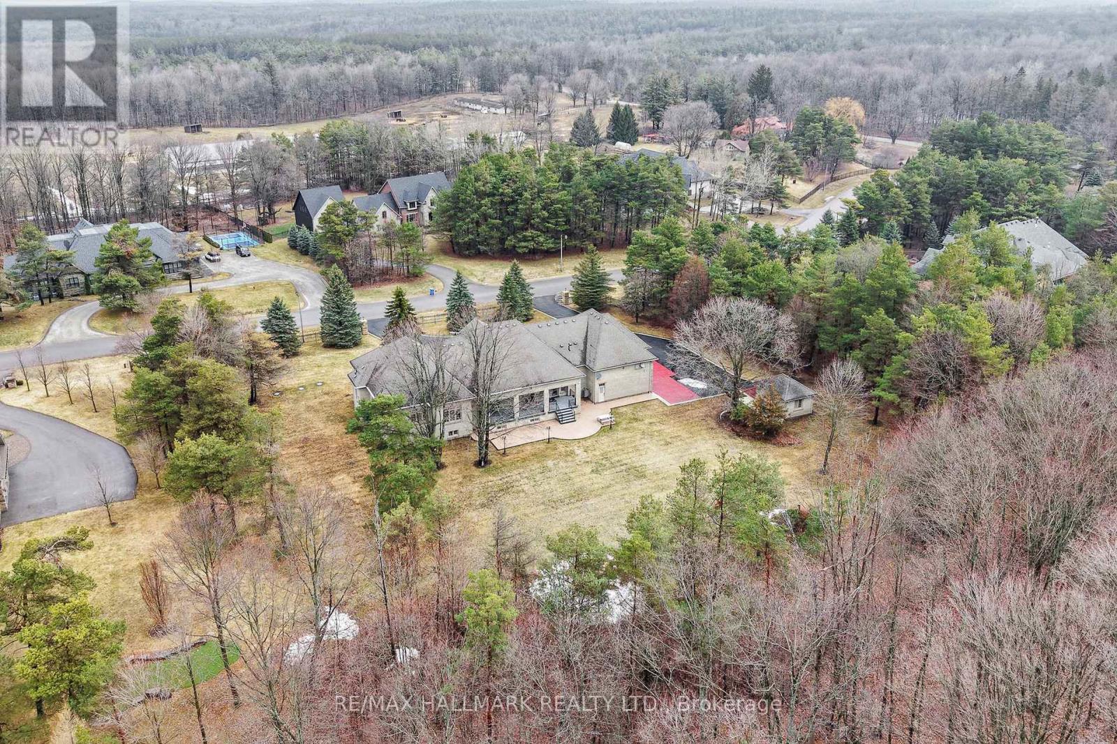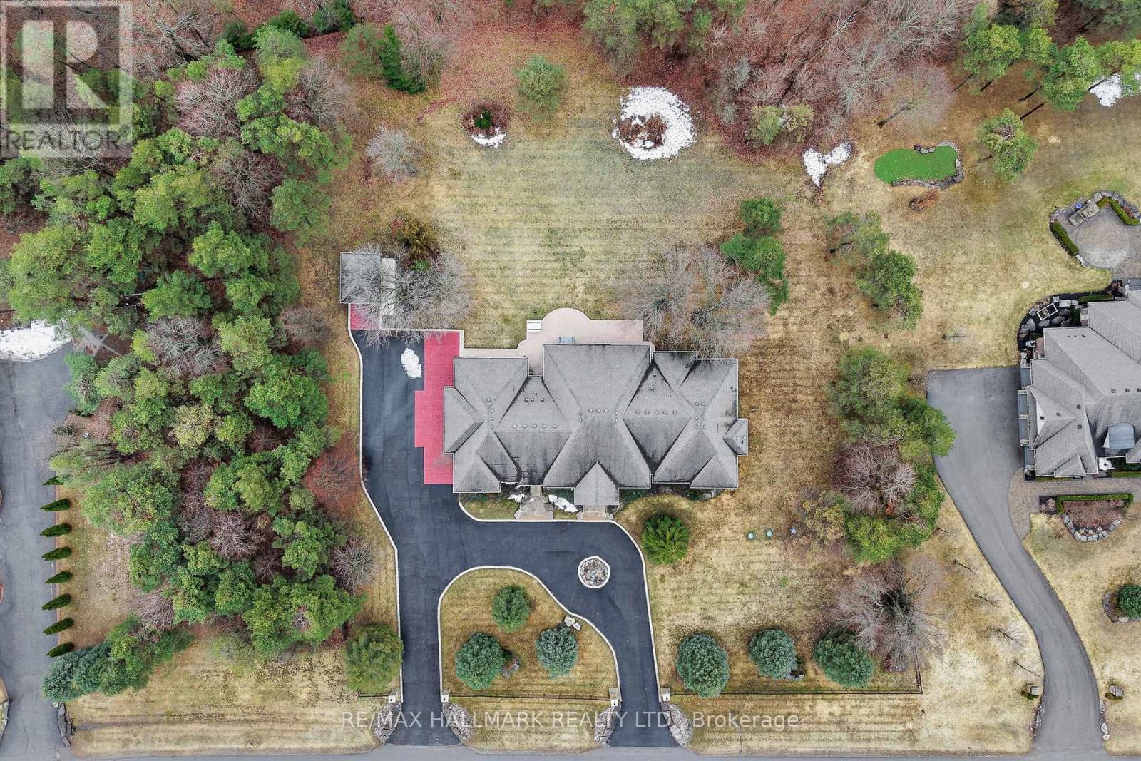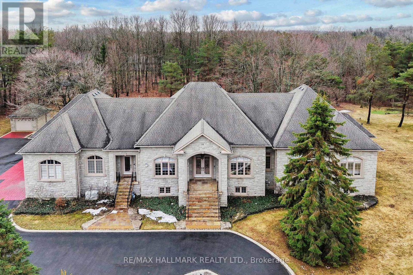 A Rare Custom Built Bungalow Offering Over 8,000 Sqft of Finished Living Space On An Exceptional 1.8 Acre Court Lot With 241 Ft of Frontage!Privately set behind mature evergreens, this impressive home showcases timeless architecture enhanced by extensive granite landscaping, dualdriveway entrances, a circular motor court, and parking for 20+ vehicles, creating a grand and memorable arrival. The striking stone exteriorextends to the garage and is complemented by nature stone finishes at all entry points. Crafted with superior Italian-inspired design, the homefeatures 10ft ceilings, rich Brazilian hardwood flooring, solid wood roof beams, tray and coffered ceilings, custom window detailing, andexquisite millwork throughout. The gourmet chef's kitchen is both functional and refined, offering granite countertops, a large centre island,premium built-in appliances, and a seamless walkout to a covered loggia overlooking beautifully landscaped grounds. A matching granitebreakfast table completes the space with cohesive design. The main level offers generously sized bedrooms, each with walk-in closets,anchored by a luxurious primary retreat featuring double door entry and a spa-inspired 6pc ensuite. The fully finished lower level expands theliving space with above-grade windows, a dramatic floor-to-ceiling fireplace with custom carved surround, built-in media centre, second kitchen,steam shower bath, and a versatile bedroom/office. With 2 separate staircases and complete lower-level living, this home is ideal formultigenerational living. Extensively equipped with 2 furnaces, 2 A/C units, 2 HRV systems, 200 amp service, 22kW Generac generator and sprinkler system.Additional upgrades include: metal front fence, updated windows, regularly sealed stonework, and new LED pot lights throughout. Just minutesto golf, amenities, and scenic forest trails. Don't miss out on this truly rare offering defined by scale, quality, and exceptional attention to detail! (id:64974)