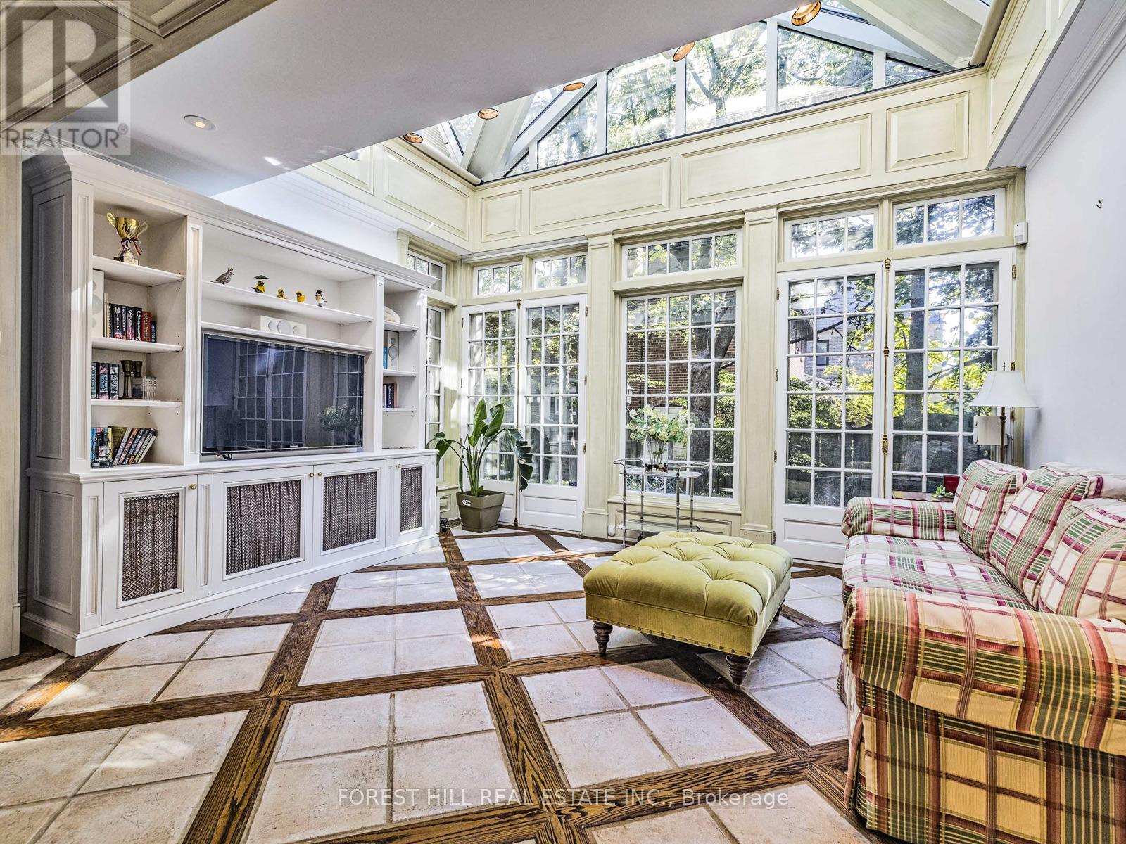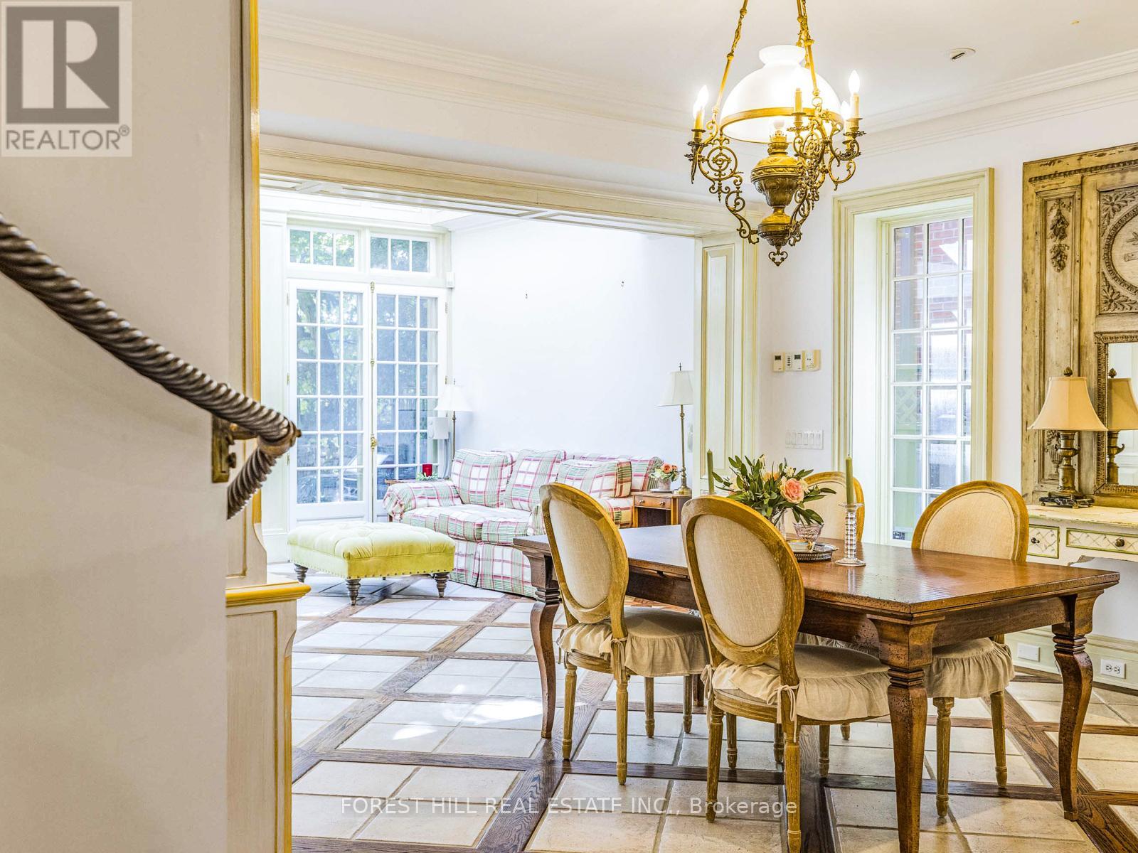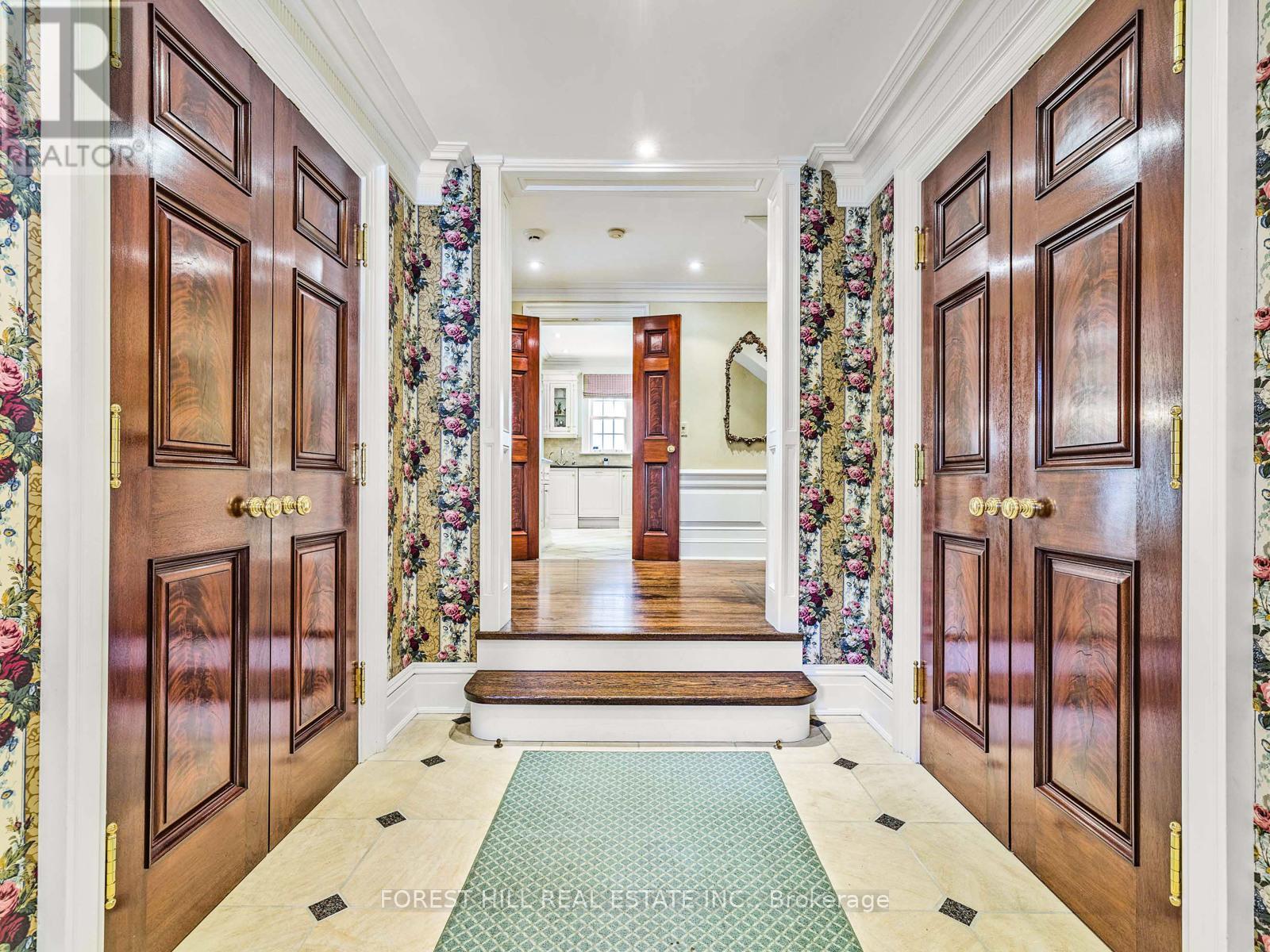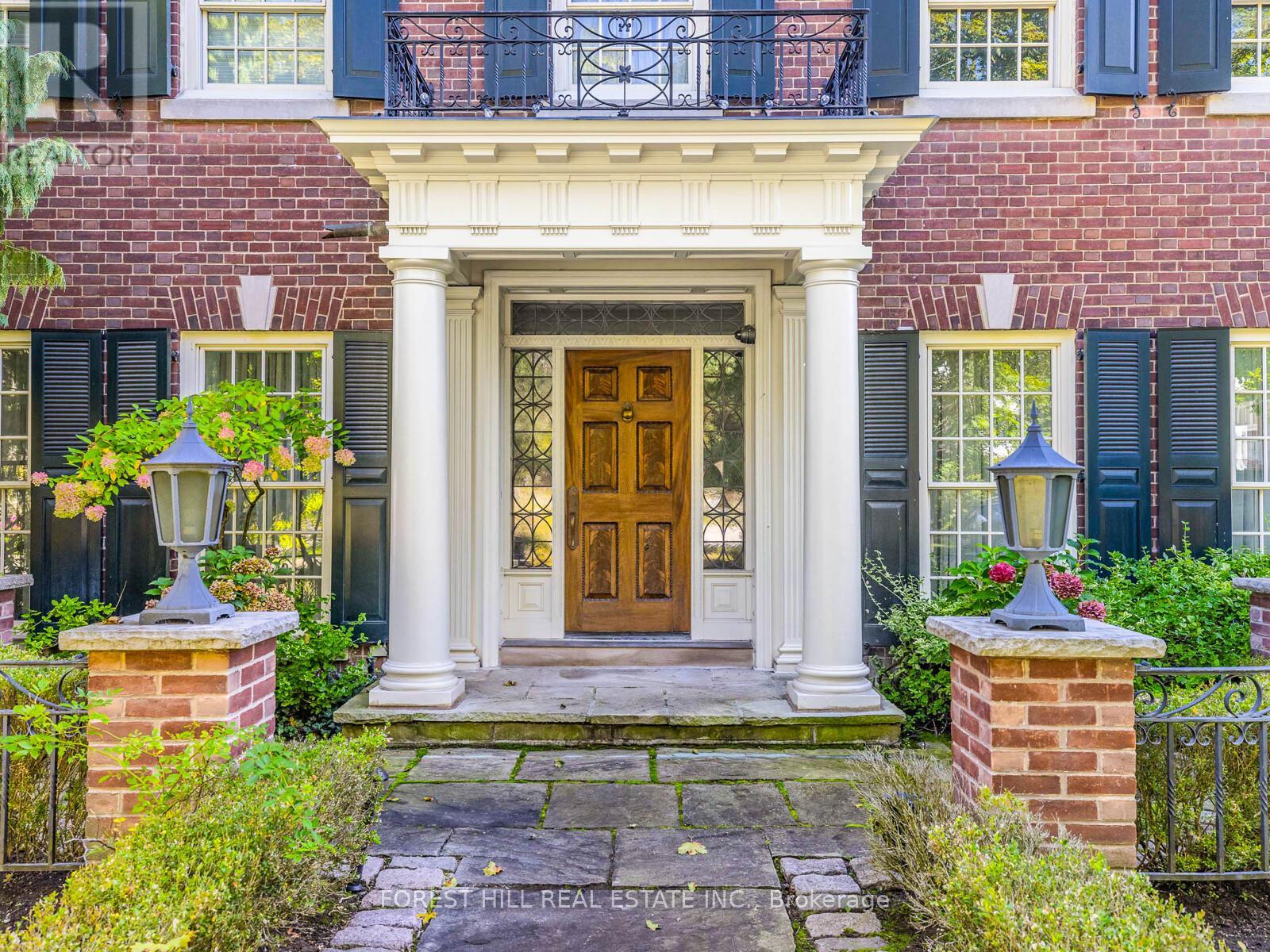 **Captivating residence/exquisite estate--Classic Elegance--This magical home has been meticulously cared for, remodeled/upgraded, and maintained by its owners--Classic/charm centre hall design offers spaces of refined and elegant comfort--5,511 sq.ft (3 storey) + 1,007 sq.ft (basement)---total 6,518 sq.ft of luxurious--where every impeccable detail has been carefully crafted and preserved. The grand principal rooms are designed for both elegance and comfort, a formal dining room and a living room with marble mantle fireplace. The functional gourmet kitchen is equipped with built-in appliances (Sub-Zero/Wolf brand), custom cabinetry & granite countertops. The adjoining family/sun room features a HEATED LIMESTONE floor and 16 ft high glass ceilings, allowing natural sunlight and French doors walkout to south exposure private garden. Upstairs, the hand-carved antique pine paneled library elaborates a story of this home, perfect for versatile use such as 2nd family room and adjoining a mahogany paneled office for a private space. The primary bedroom offers a dressing room, 6 pcs ensuite. The family gym on 2nd floor offers a 18 ft high ceiling with skylights for convenience and comfort. On 3rd floor, the additional all 3 bedrooms provide their own private ensuites, closets, and feature a 3rd furnace and 2nd laundry area. The lower level offers an entertainment room, music and studio room, wine cellar with climate control. Outside, the landscaped lush garden features cheerful trees for privacy and relaxation, and a heated driveway for 5 vehicles, and 2 cars in garage. Surrounded by top ranking private and public schools-UCC/BSS/Havergal College/Forest Hill Junior & Senior PS & Forest Hill CI. A short walk brings you to Forest Hill Village with shops, restaurants & cafes, minutes to sunway station, hwys & more! (id:64974)