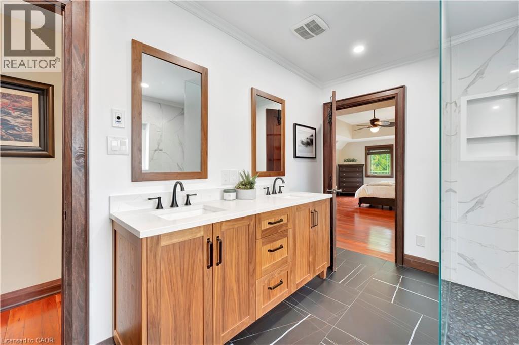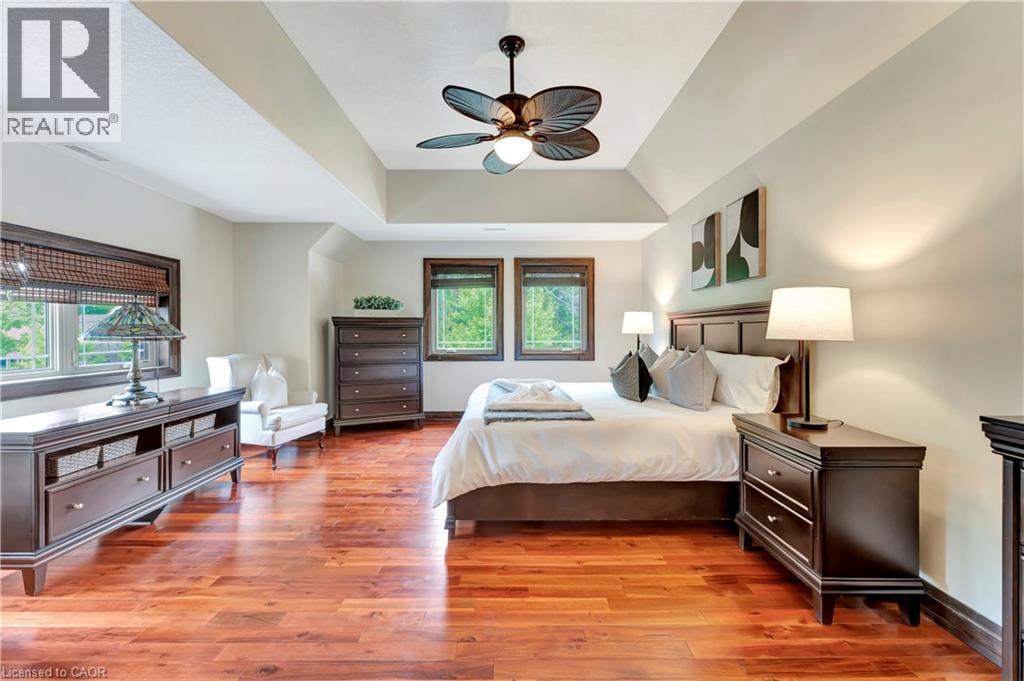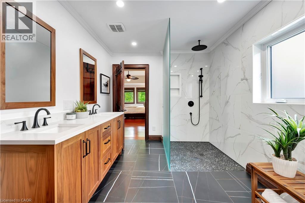 An incredible opportunity to live on one of the most sought-after streets in all of KW! From the moment you arrive you'll be captivated by the striking exterior! The exposed aggregate driveway (10 car parking) is perfectly complemented by three garage bays. Situated on a meticulously landscaped near half acre lot (100’ x 191’), an absolute showstopper inside and out. The expansive open-concept main floor design allows effortless entertaining and comfortable everyday living. The living room offers picturesque views to both the front and rear property, seamlessly flowing into a dining area with walkout access to the backyard deck. The oversized eat-in kitchen is a chef’s dream, featuring a 6-seater island and an abundance of cabinetry and prep space, with an additional corridor of custom cabinetry that leads to a sunken sunroom bathed in natural light. Upstairs, the impressive primary suite is lined with windows, creating a bright, airy retreat. A generous walk-in closet (potential for a second walk-in) complements the spa-inspired ensuite bath. Two additional bedrooms and a large storage room complete the upper level. The thoughtfully designed layout offers flexibility with a ‘secondary wing’, a perfect retreat for extended family or guests. This wing features a stunning living room with soaring vaulted ceilings and oversized windows, full bathroom, two additional bedrooms and large office. With two separate garage entrances, the home also features dual mudrooms, each with its own powder room. The traditional basement area is ideal for entertaining, providing ample space for gatherings and leisure. Outside, the expansive deck leads you to a beautifully private, landscaped backyard oasis. A rare find in the heart of the city! Situated mere steps from one of Canada’s top-rated golf courses, Westmount Golf & Country Club, and within minutes of the region’s finest amenities, shopping, & dining. This is an exceptional offering for those seeking both luxury and lifestyle. (id:64974)