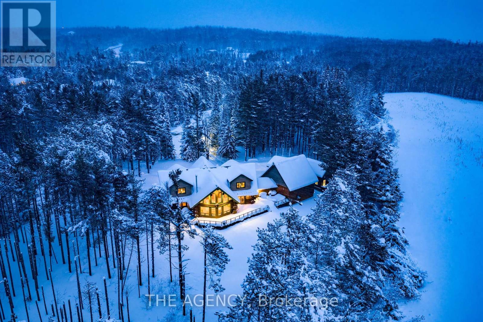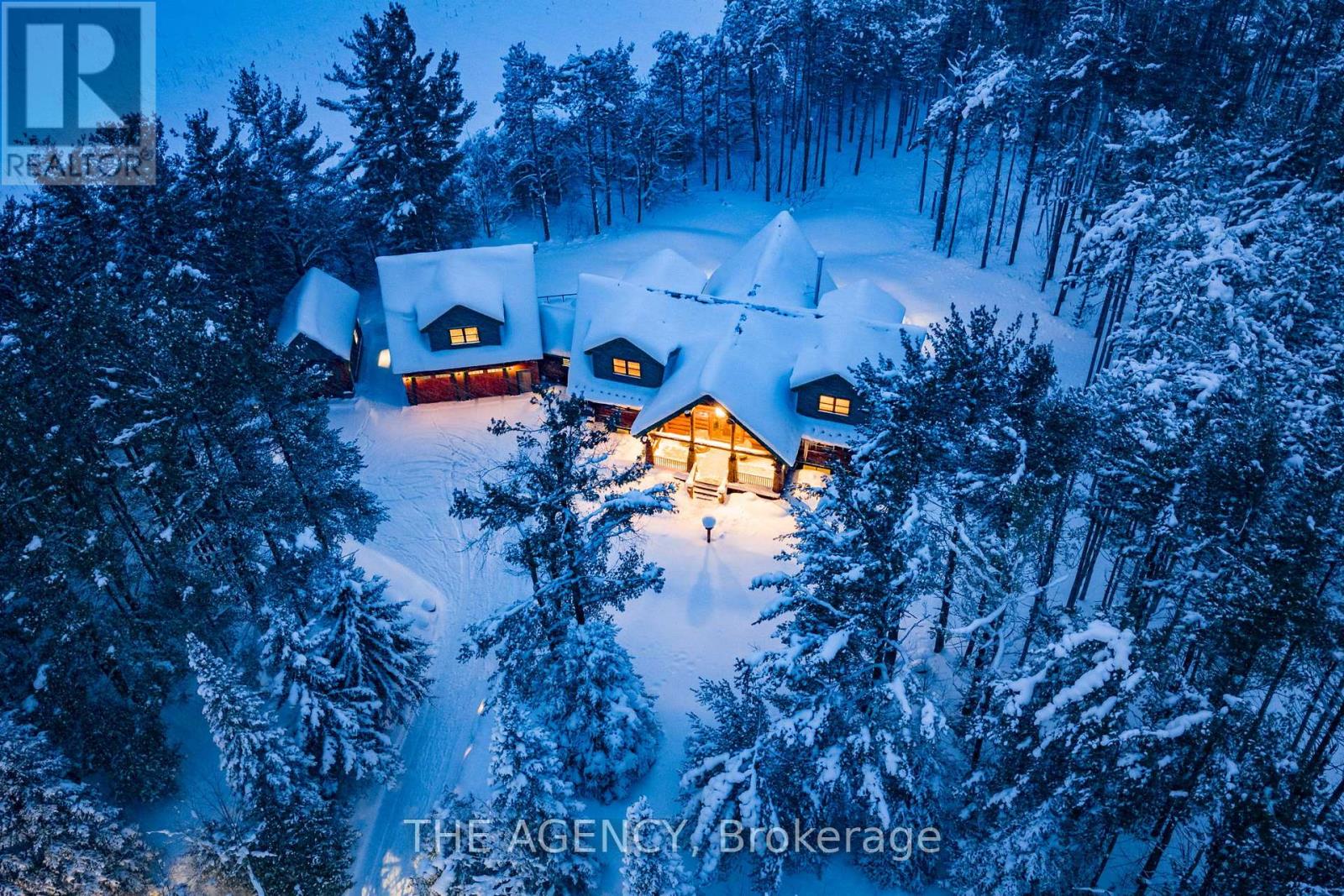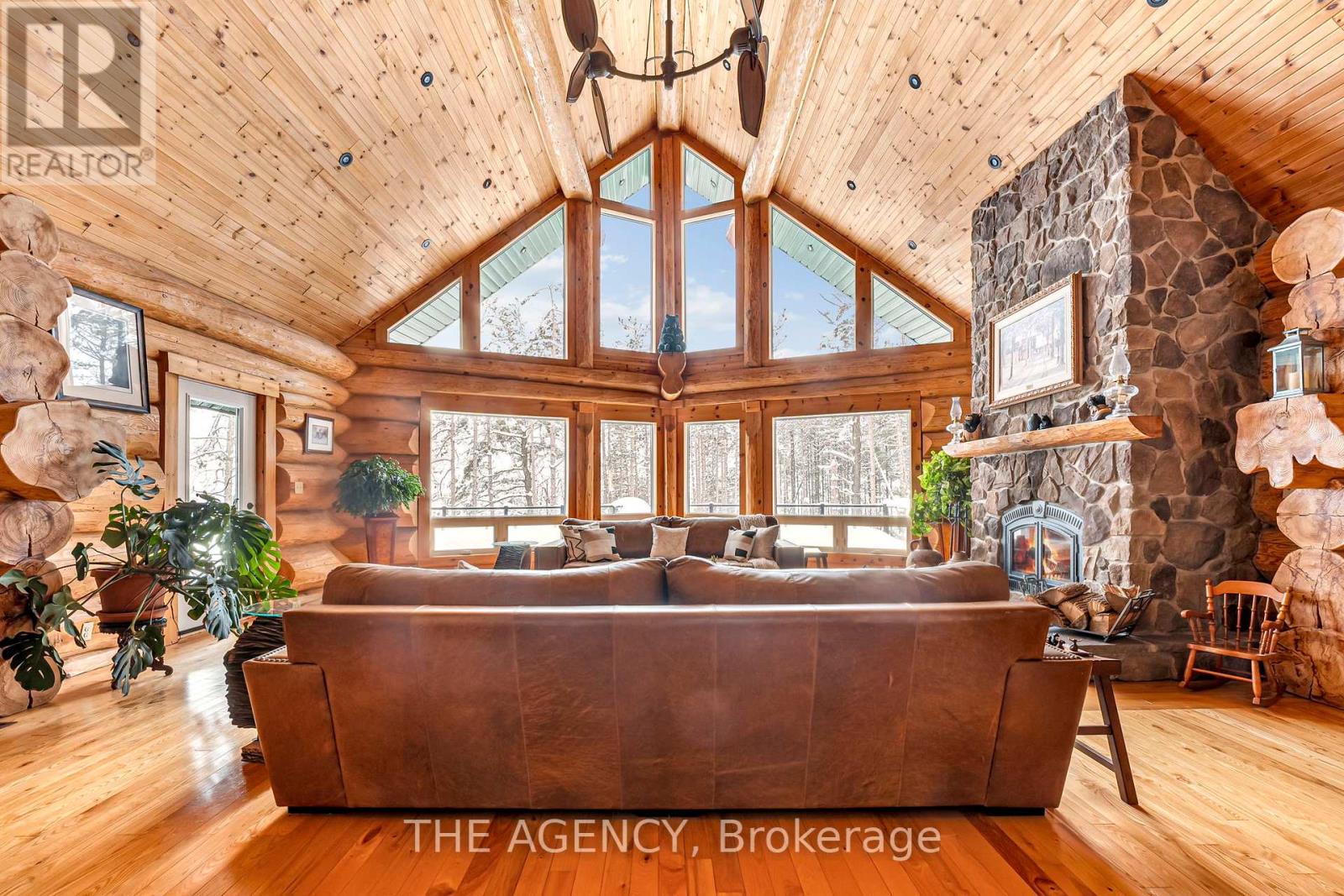 Set apart by timeless craftsmanship and natural beauty, this one-of-a-kind custom-built log home is privately situated at the end of a quiet cul-de-sac on 2.1 acres of mature, tree-lined grounds. This exceptionally unique residence boasts nearly 6,000 SF of refined living space that blends rustic elegance with modern comfort. Designed for both grand entertaining and everyday living, the home features 6 bedrooms and 4.5 bathrooms, complemented by an energy-efficient geothermal system and the low-maintenance beauty of hand-peeled Western Red Cedar. The stunning great room showcases soaring vaulted ceilings and a dramatic stone fireplace. This space flows seamlessly into a chef-inspired kitchen with granite countertops, stainless steel appliances, alongside a welcoming dining area ideal for intimate meals or large gatherings. The main-level primary suite features a private retreat complete with a walk-in closet and spa-like ensuite. Additional highlights include an upper-level den with scenic treetop views, beautifully appointed ensuite bedrooms for family and guests, and a radiant-heated lower level perfect for year-round entertaining or relaxation. An attached heated garage with smart openers is enhanced further by an impressive 650 SF loft making it ideal for a home office, studio, creative space or additional storage. Embrace the sights and sounds of the outdoors on the new 1,100 SF deck which spans the entire rear side of the home. The well-appointed grounds showcase professionally landscaped armour stone walkways and gardens as well as a detached 3rd garage. Delivering the perfect balance of privacy and convenience, this year-round retreat is located just a short drive from Barrie and only one hour from Toronto. With easy access to nearby lakes, trails, Horseshoe Valley Ski Resort, Vetta Spa, and other seasonal recreation destinations, this extraordinary property delivers an unparalleled lifestyle of comfort, beauty, and tranquility. (id:64974)